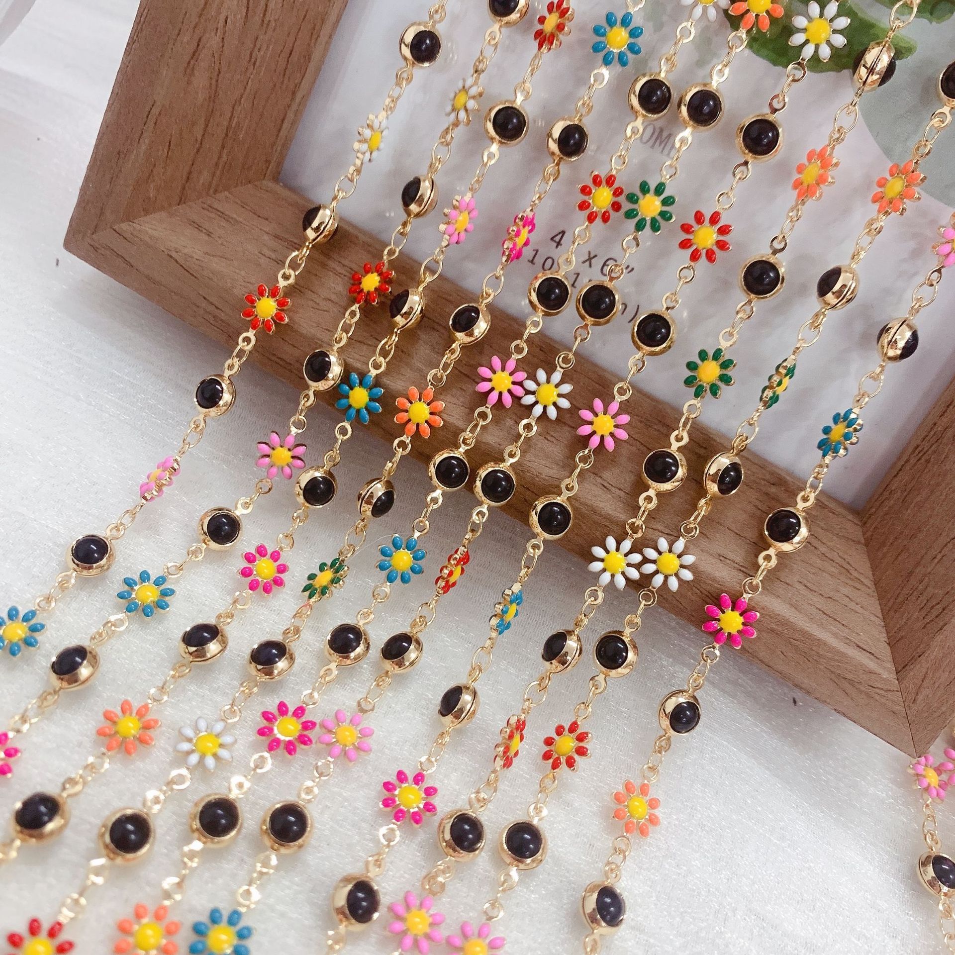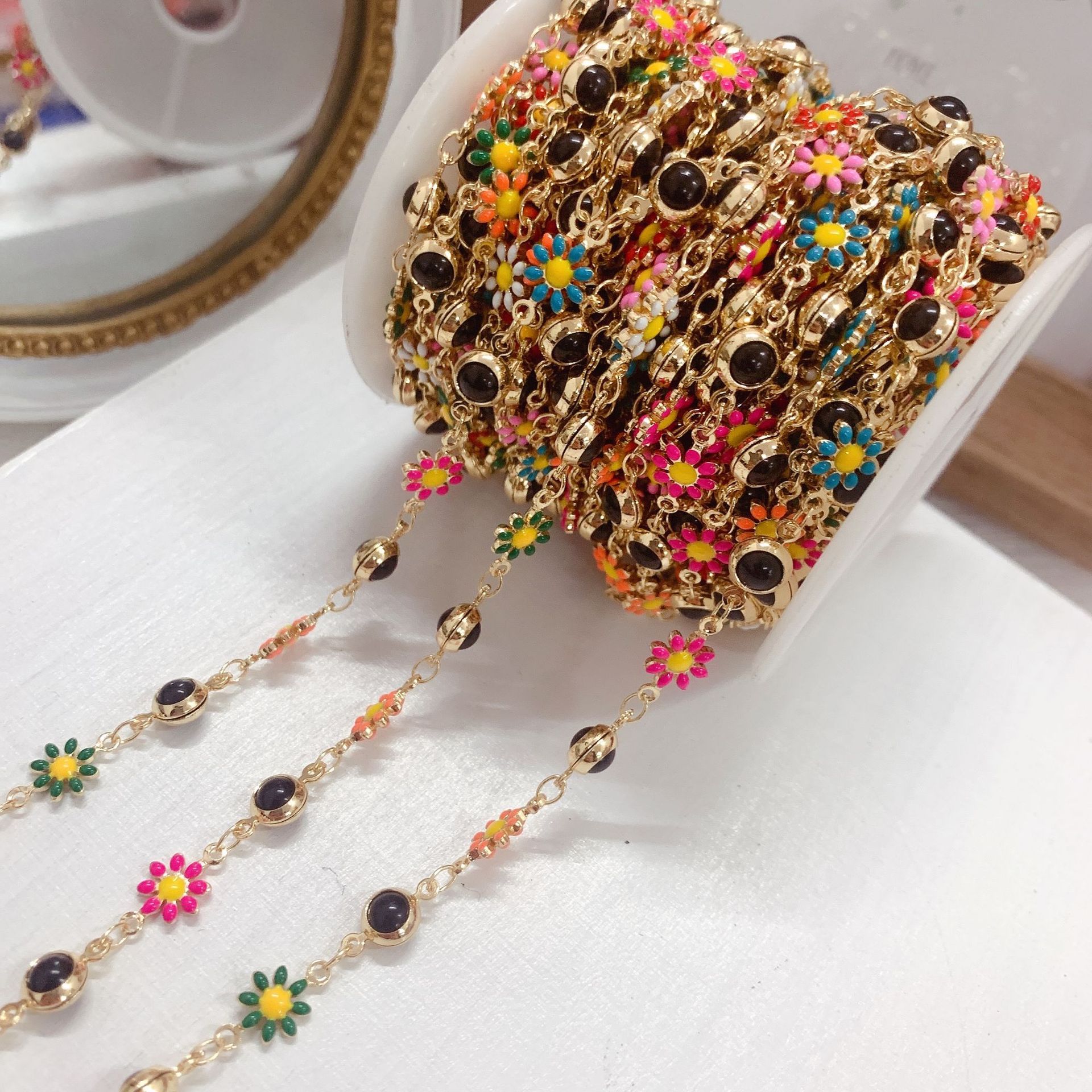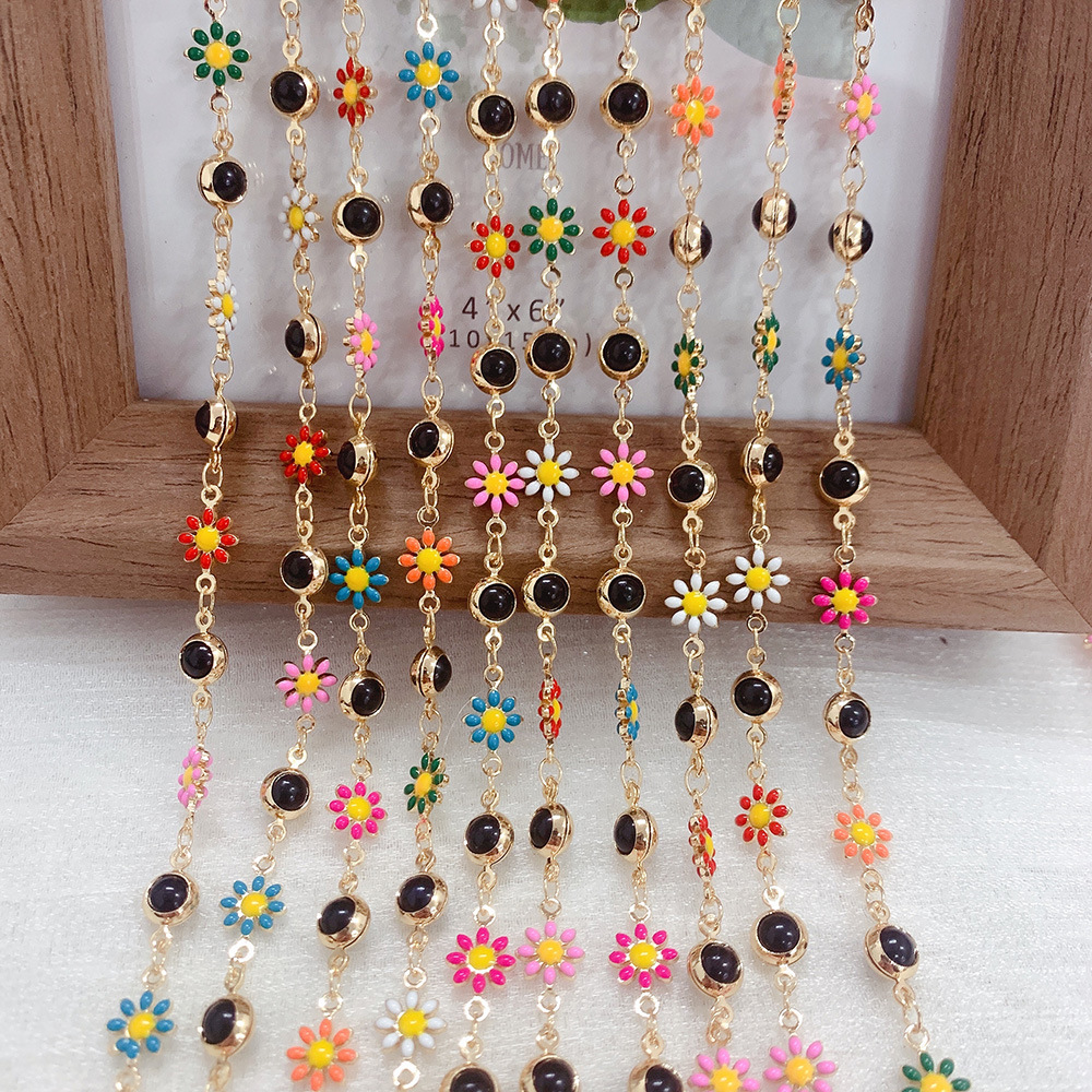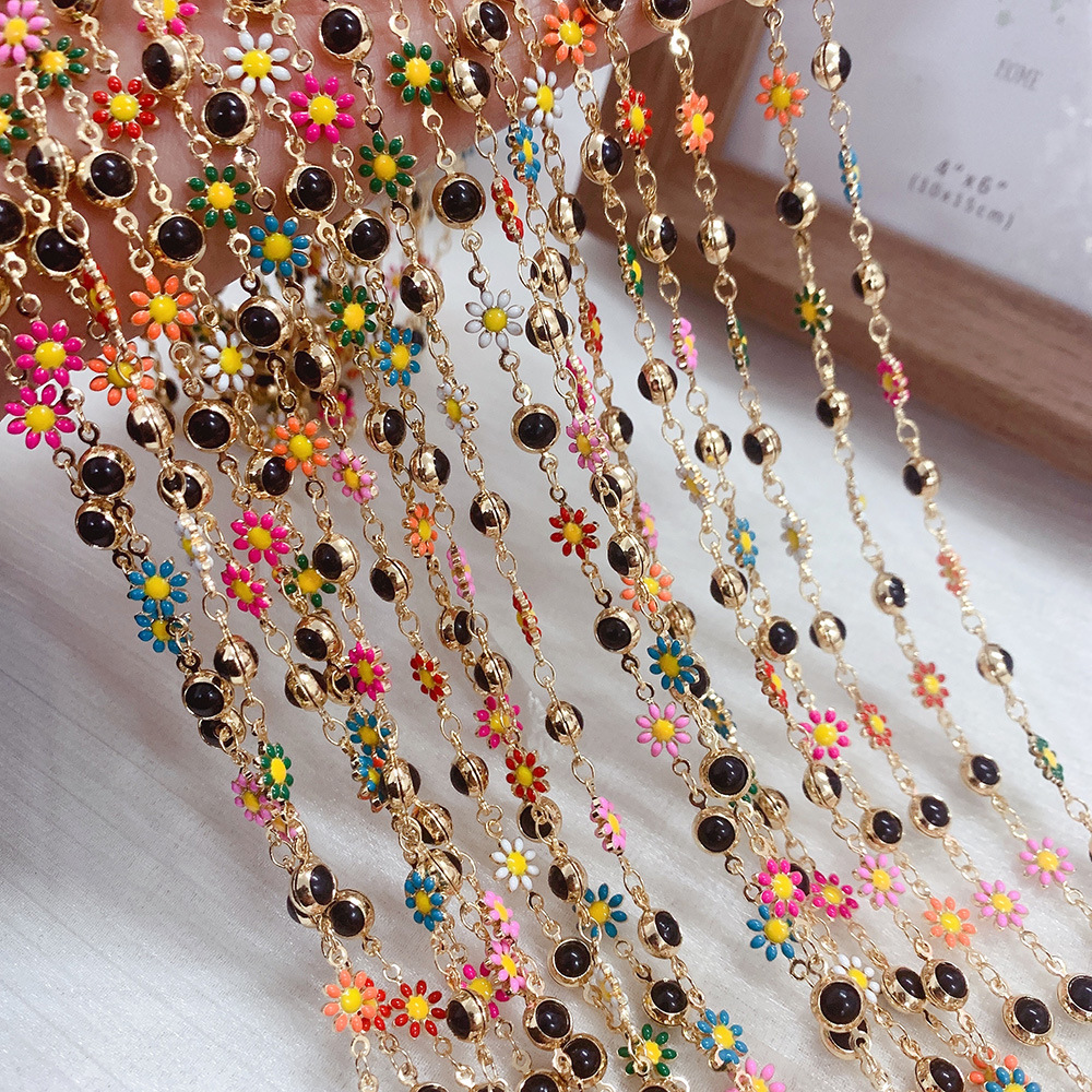 Drahokam korálkový řetěz, Mosaz, Květina, barva pozlacený, DIY & smalt, smíšené barvy, nikl, olovo a kadmium zdarma, 10m/Bag, Prodáno By Bag