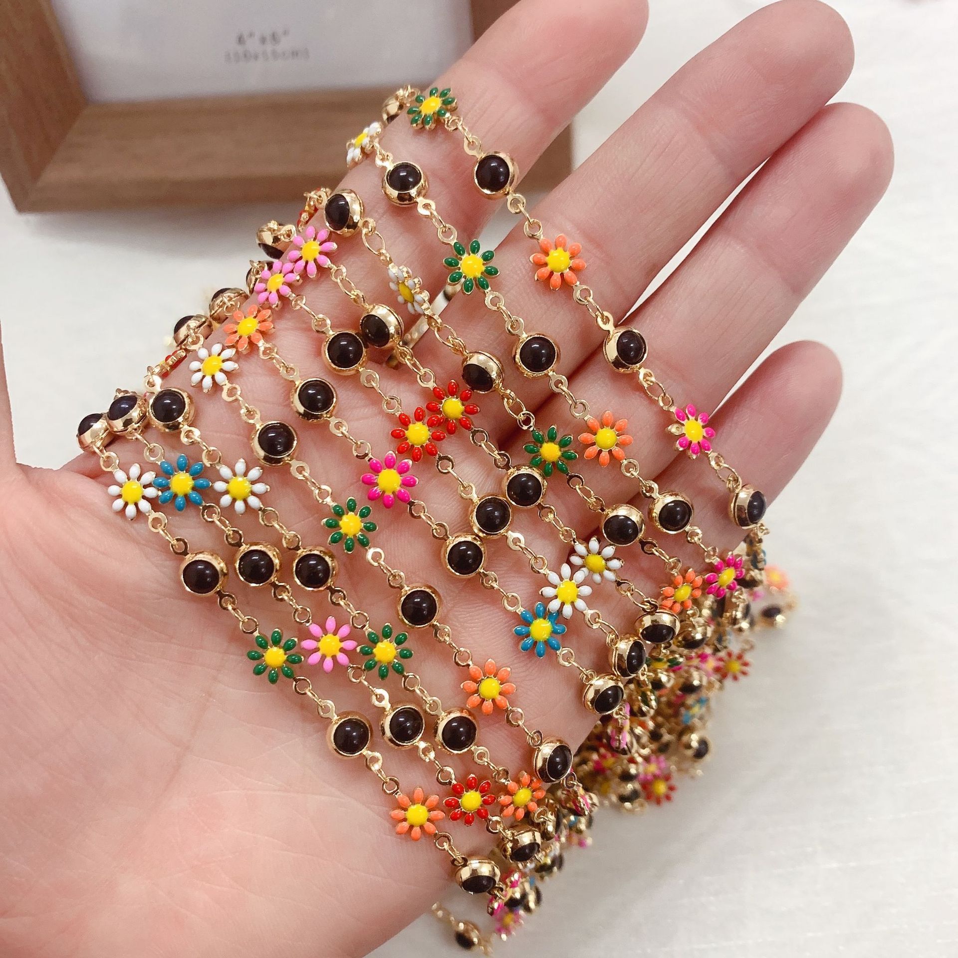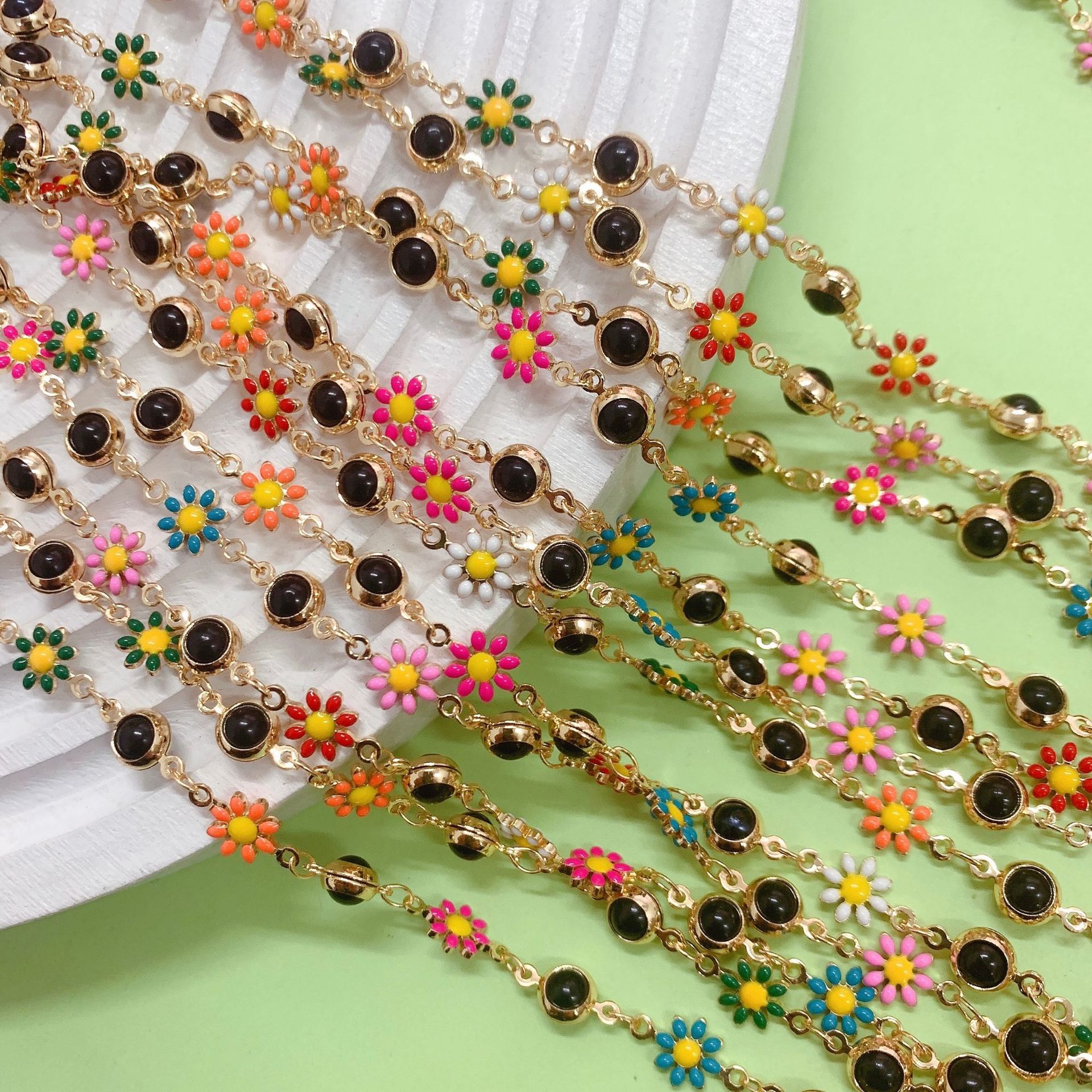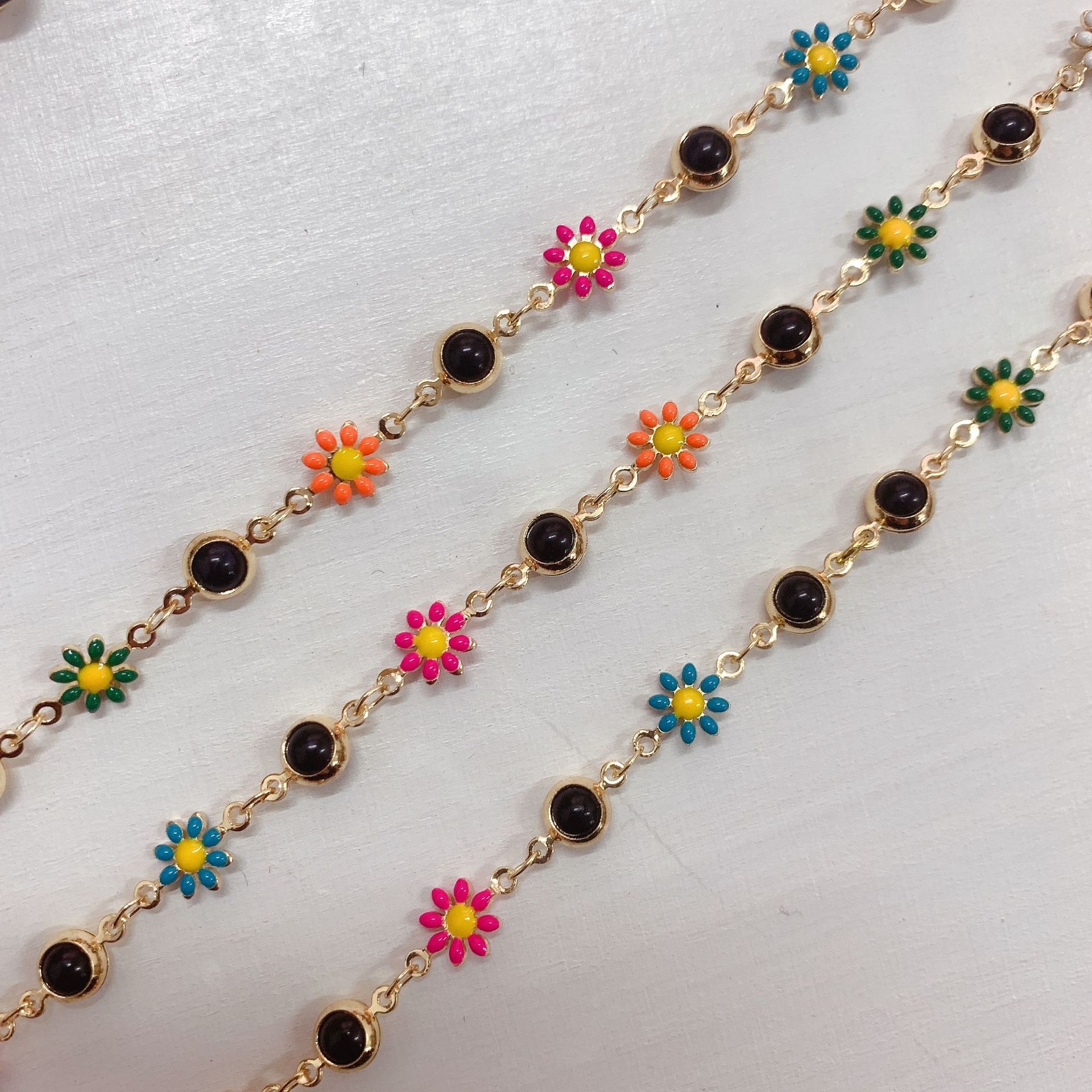 Drahokam korálkový řetěz, Mosaz, Květina, barva pozlacený, DIY & smalt, smíšené barvy, nikl, olovo a kadmium zdarma, 10m/Bag, Prodáno By Bag