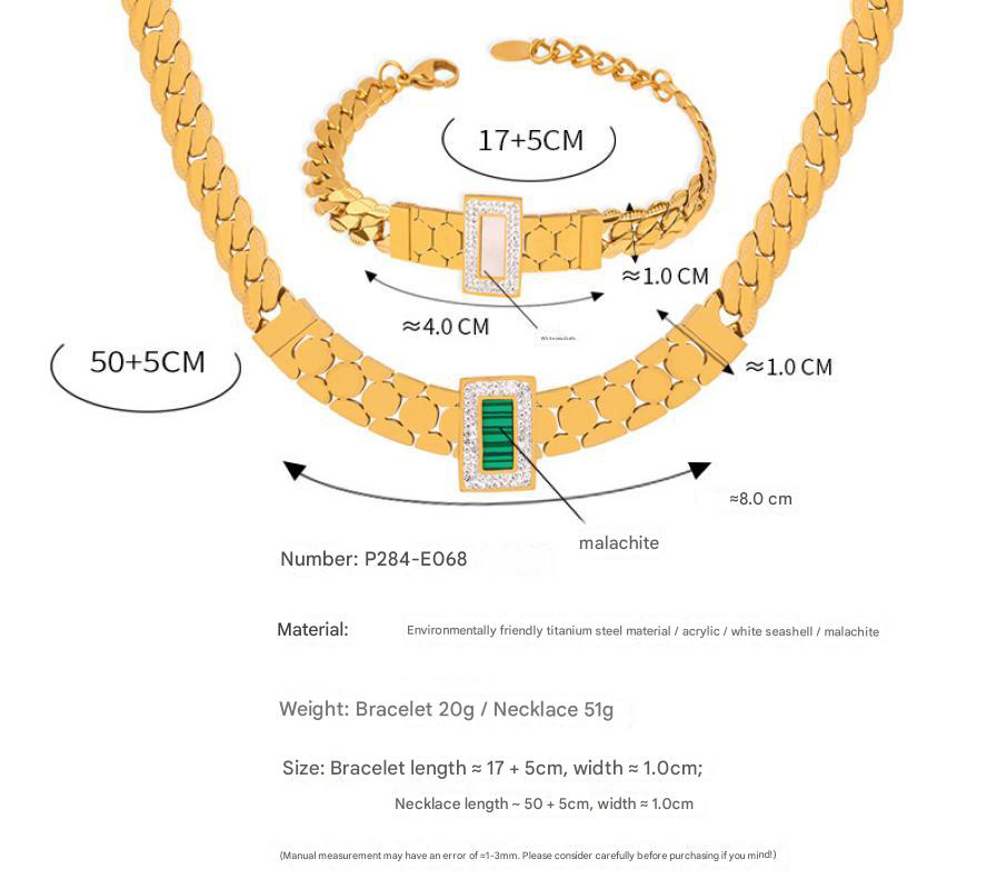1:E068-gold white seashell bracelet-17   5cm2:E068-gold black acrylic bracelet-17   5cm3:E068-silver white seashell bracelet-17   5cm4:E068-silver black acrylic bracelet-17   5cm5:E068-silver malachite bracelet-17   5cm6:P284-silver white sea shell necklace-50   5cm7:P284-silver black acrylic necklace-50   5cm8:P284-silver malachite necklace-50   5cm