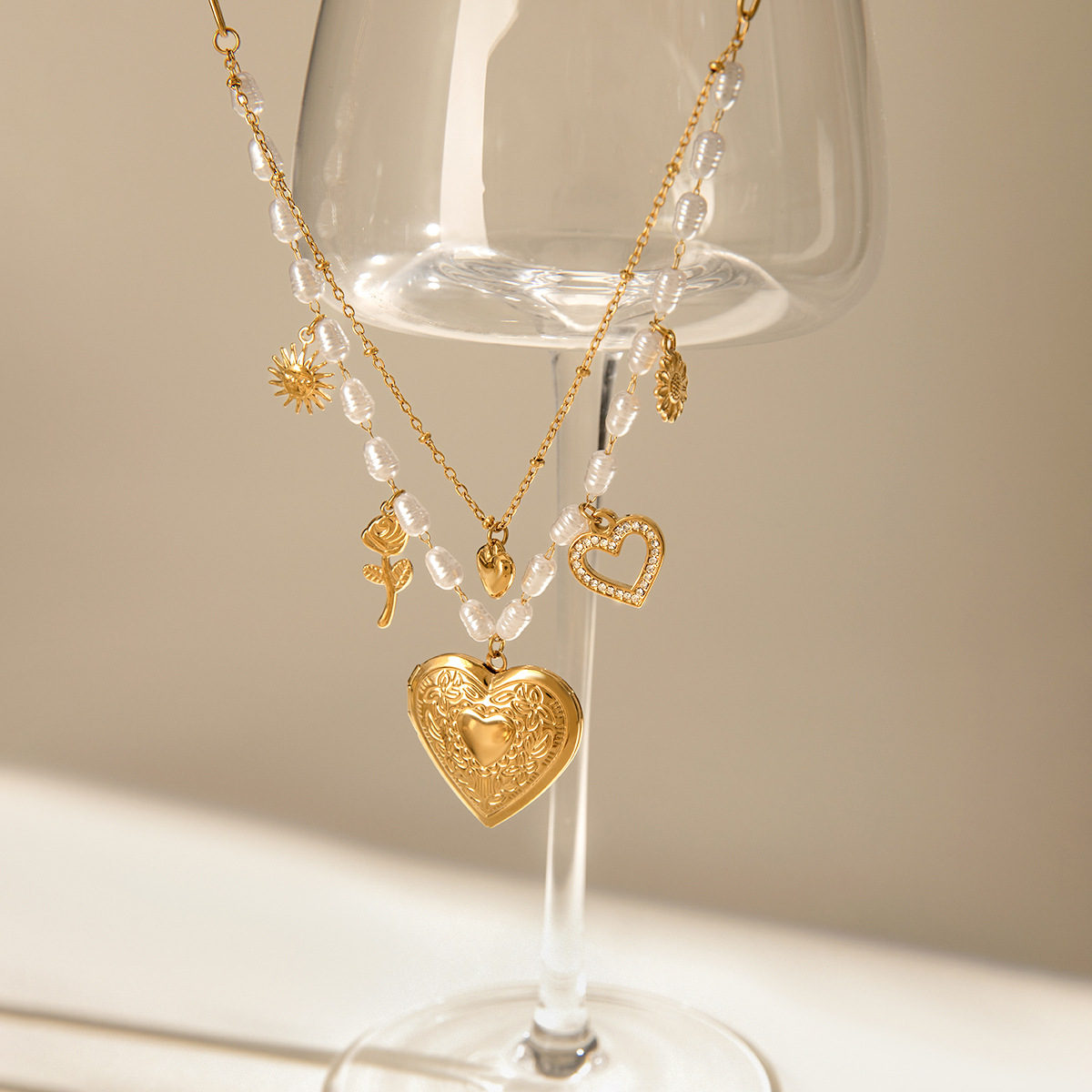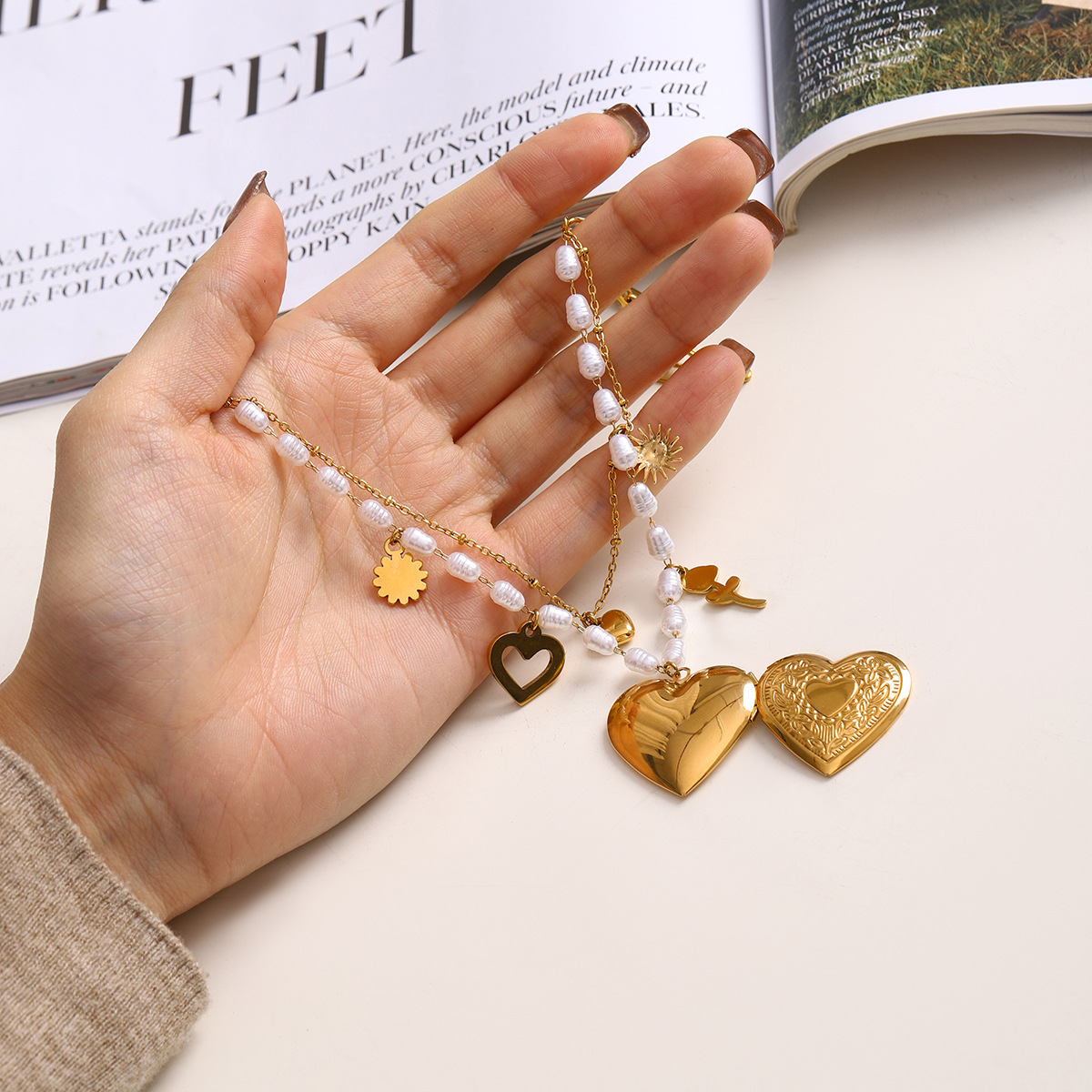 Módní Locket náhrdelník, 304 Stainless Steel, s Plastové Pearl, může otevřít a dát do něčeho & Dvojitá vrstva & pro ženy & s drahokamu, zlatý, Prodáno By PC