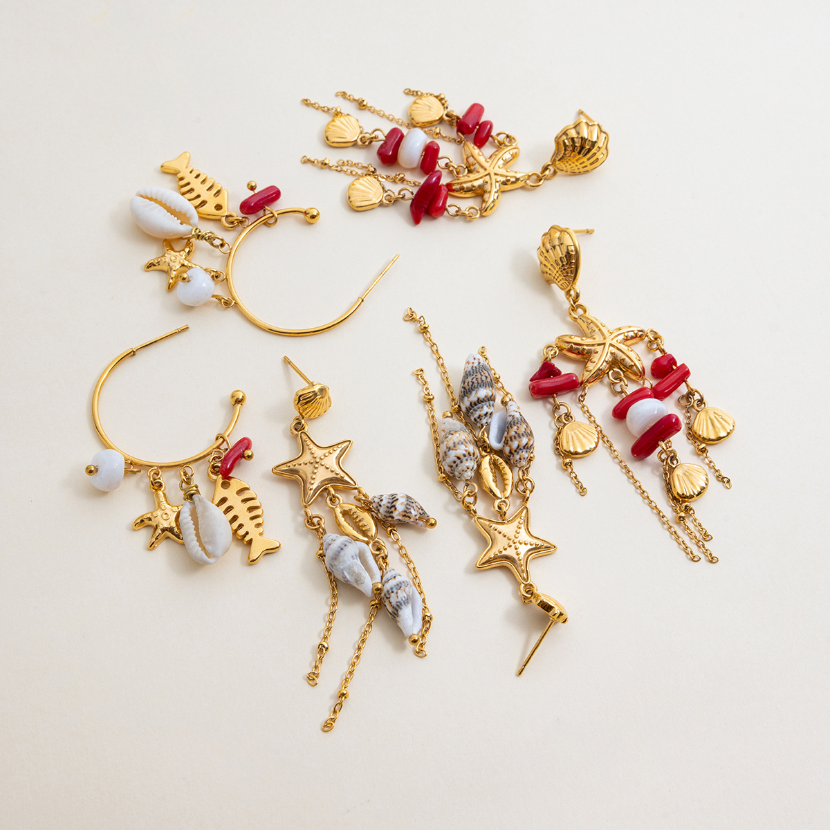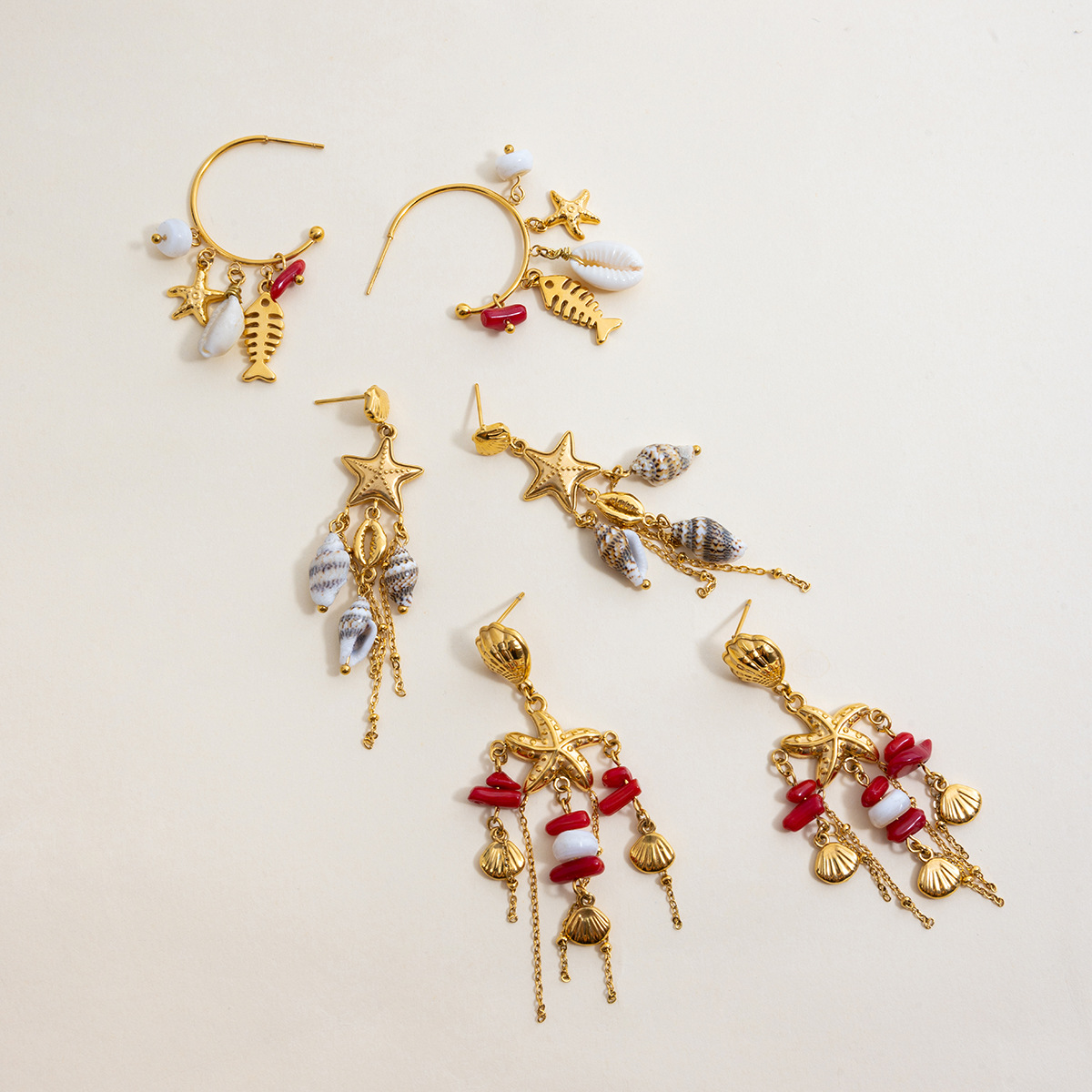 Módní náušnice Fringe, 304 Stainless Steel, s Syntetický Coral & Trumpet Shell, módní šperky & různé materiály pro výběr & pro ženy, zlatý, Prodáno By Pair