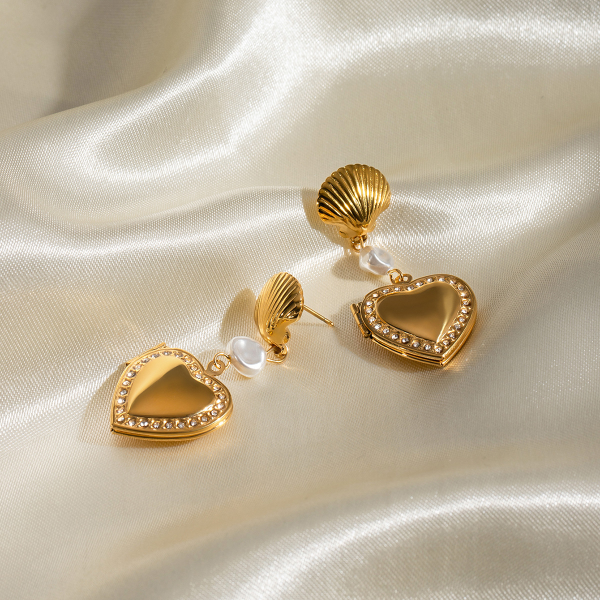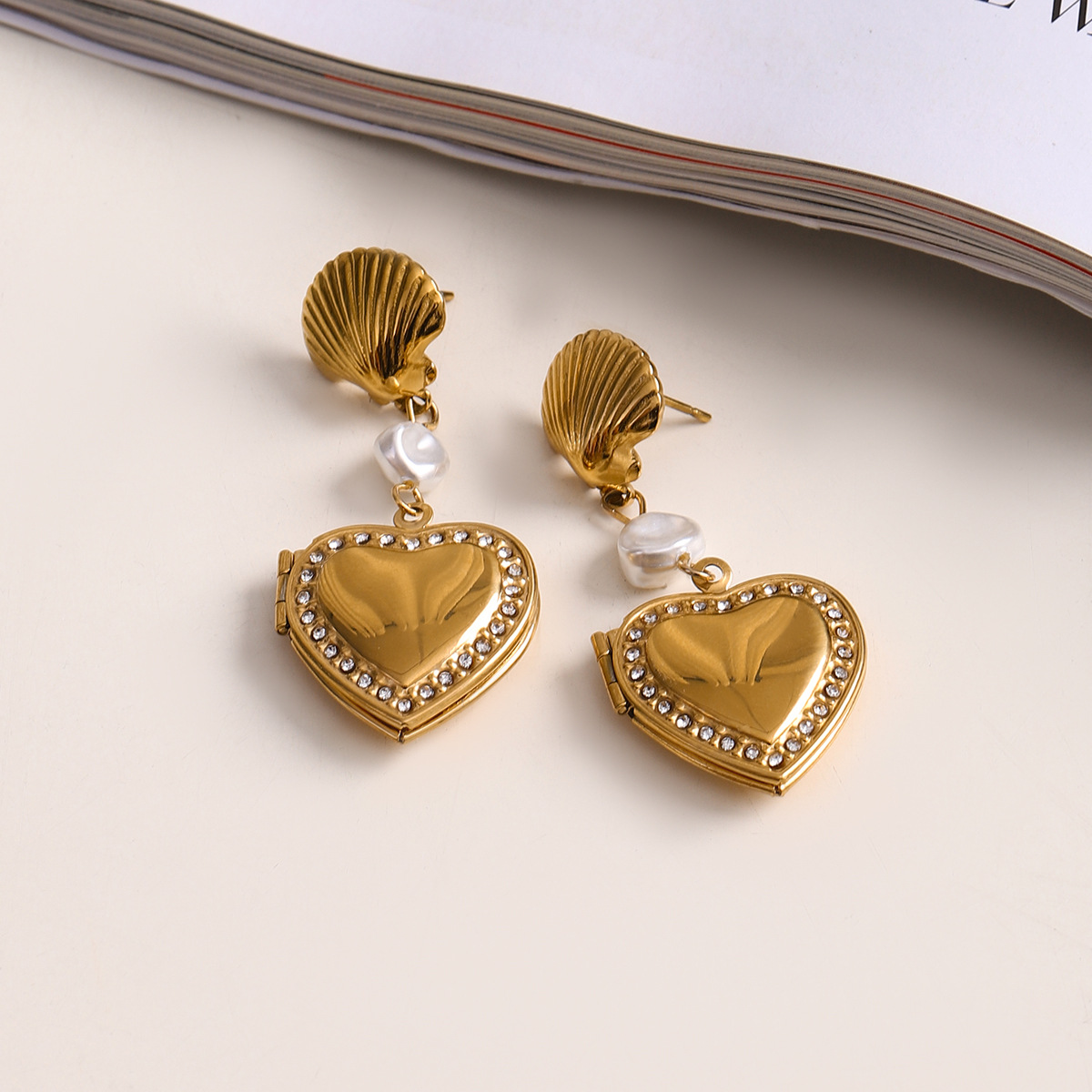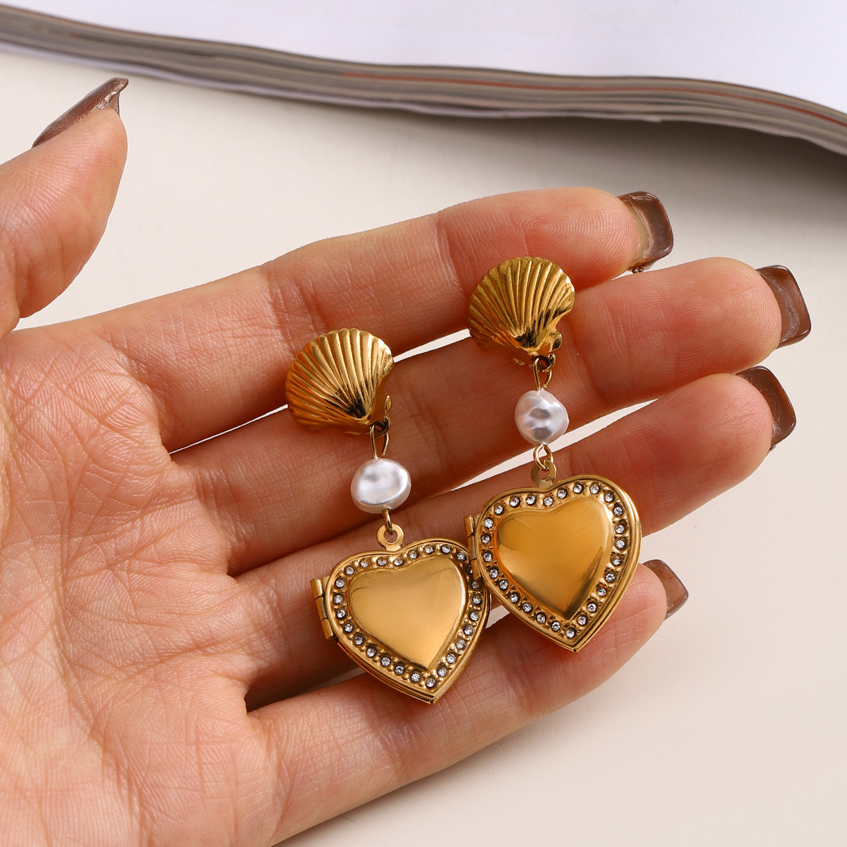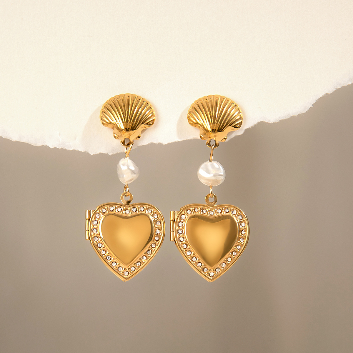 Nerezová ocel Drop náušnice, 304 Stainless Steel, s Shell Pearl, může otevřít a dát do něčeho & pro ženy & s drahokamu, zlatý, Prodáno By Pair