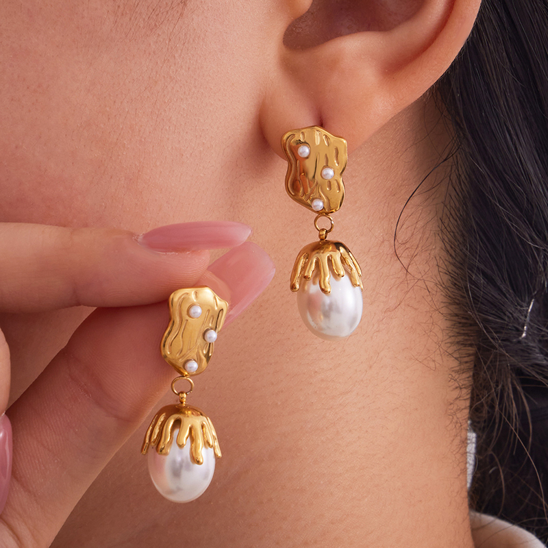 Nerezová ocel Drop náušnice, 304 Stainless Steel, s Přírodní kámen & Plastové Pearl, barva pozlacený, pro ženy, Prodáno By Pair