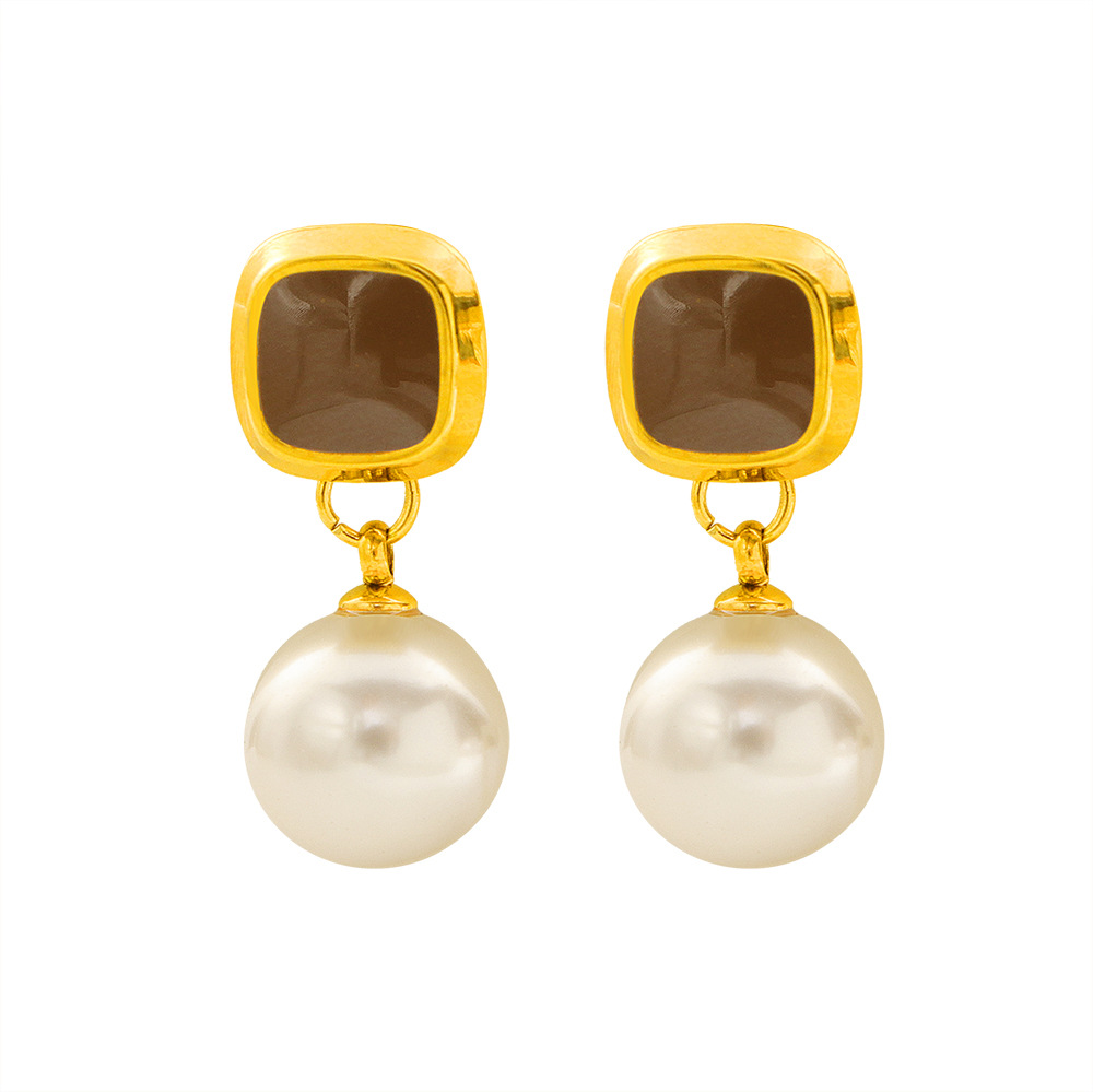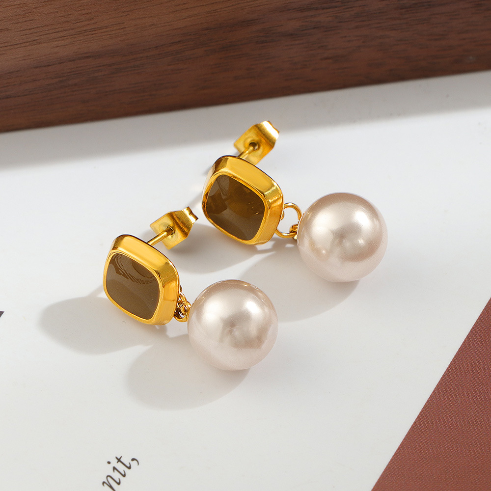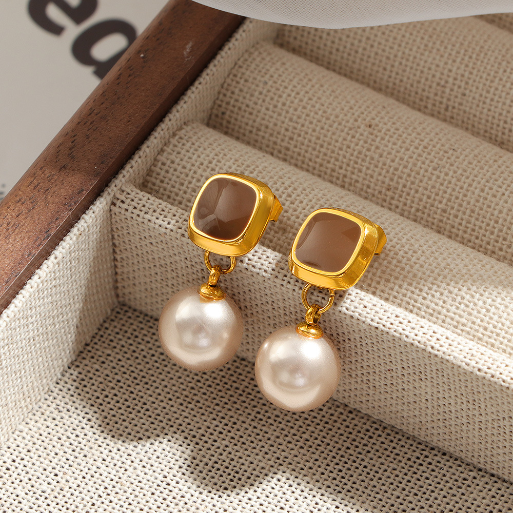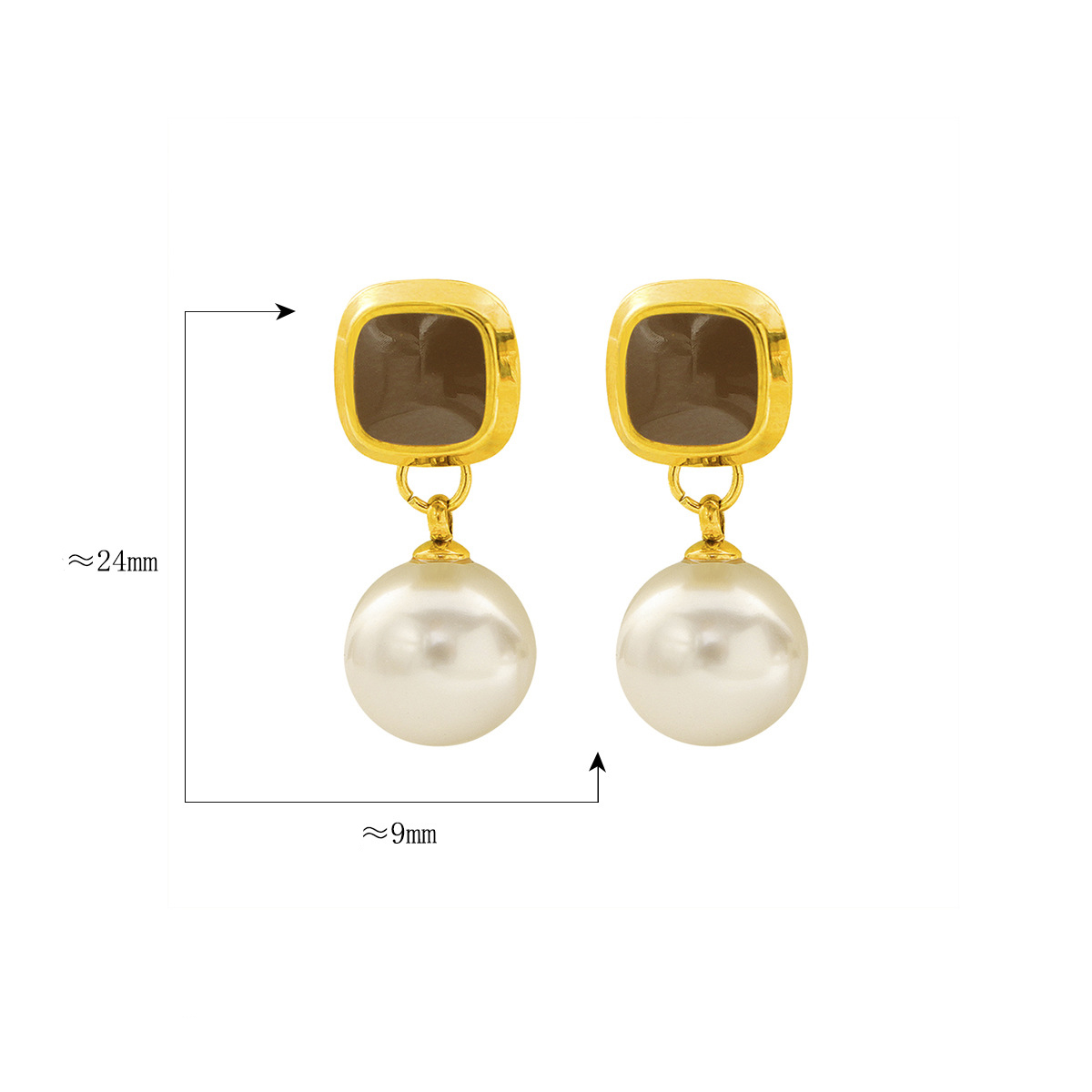 304 rustfrit stål Drop Earring, med Plastic Pearl, guldfarve belagt, for kvinde & epoxy sticker, 9x24mm, Solgt af par