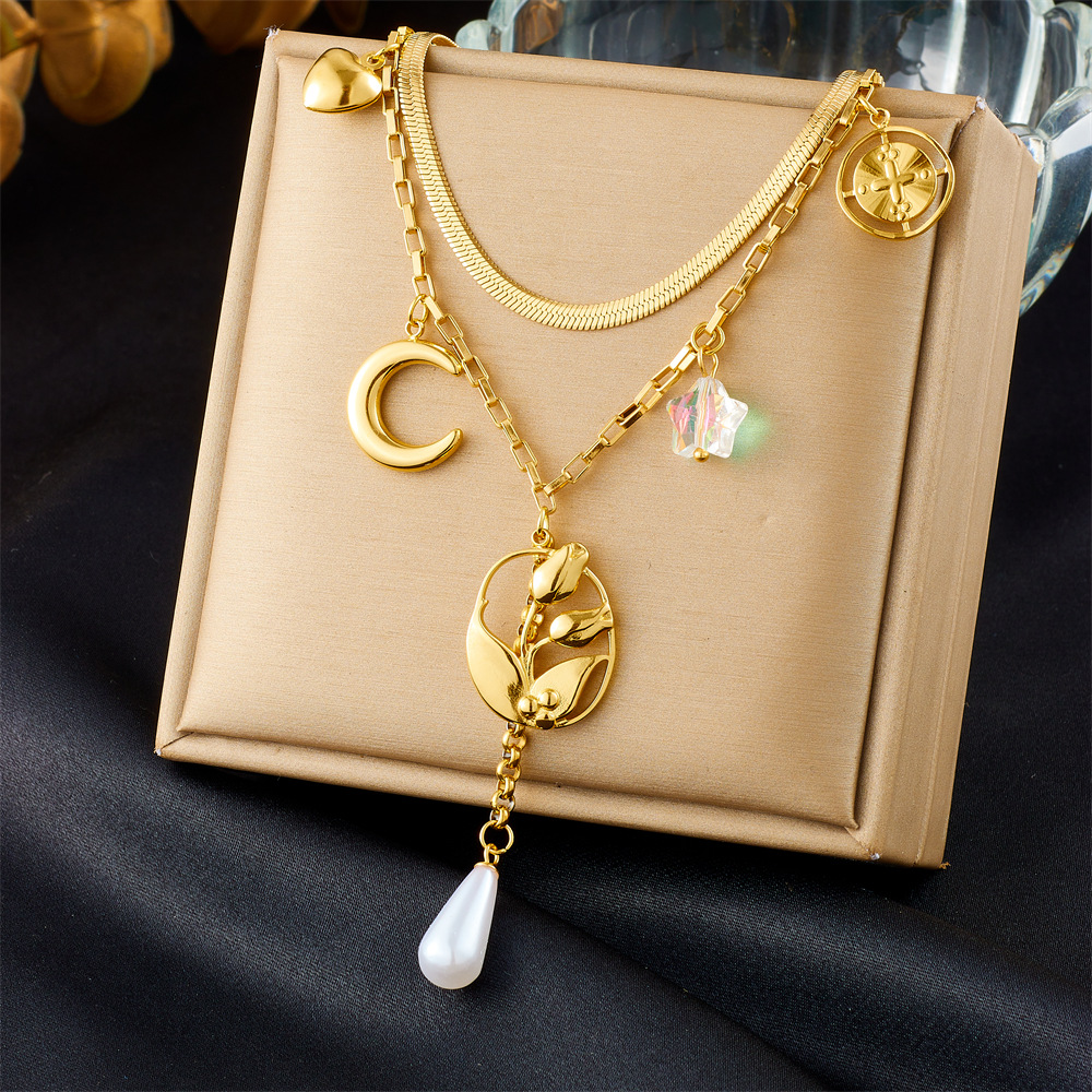 Rustfrit stål smykker halskæde, 304 rustfrit stål, med Plastic & Plastic Pearl, guldfarve belagt, Dobbelt lag & mode smykker & for kvinde, Solgt af PC