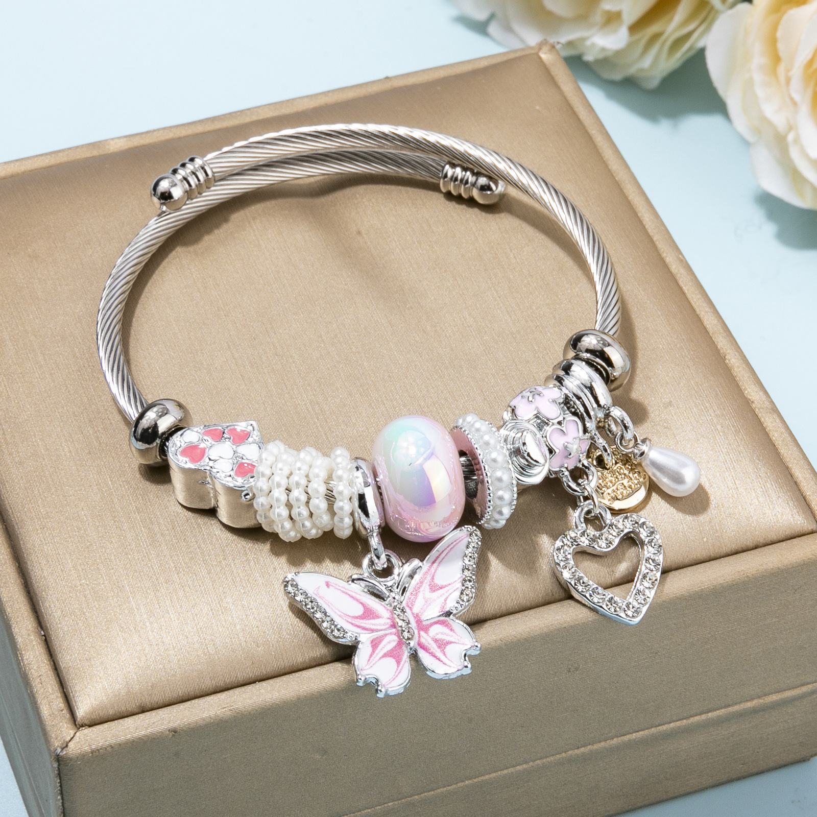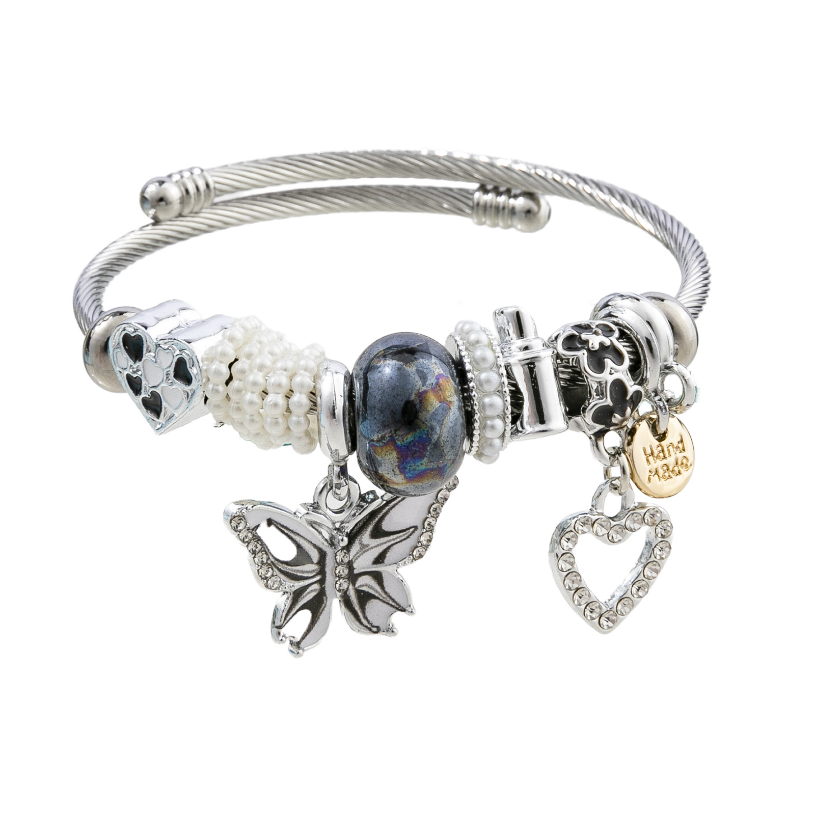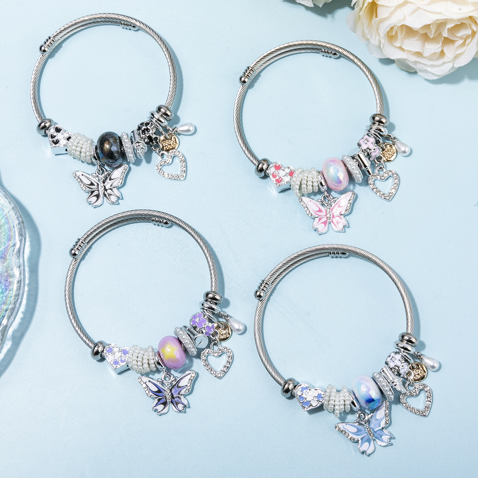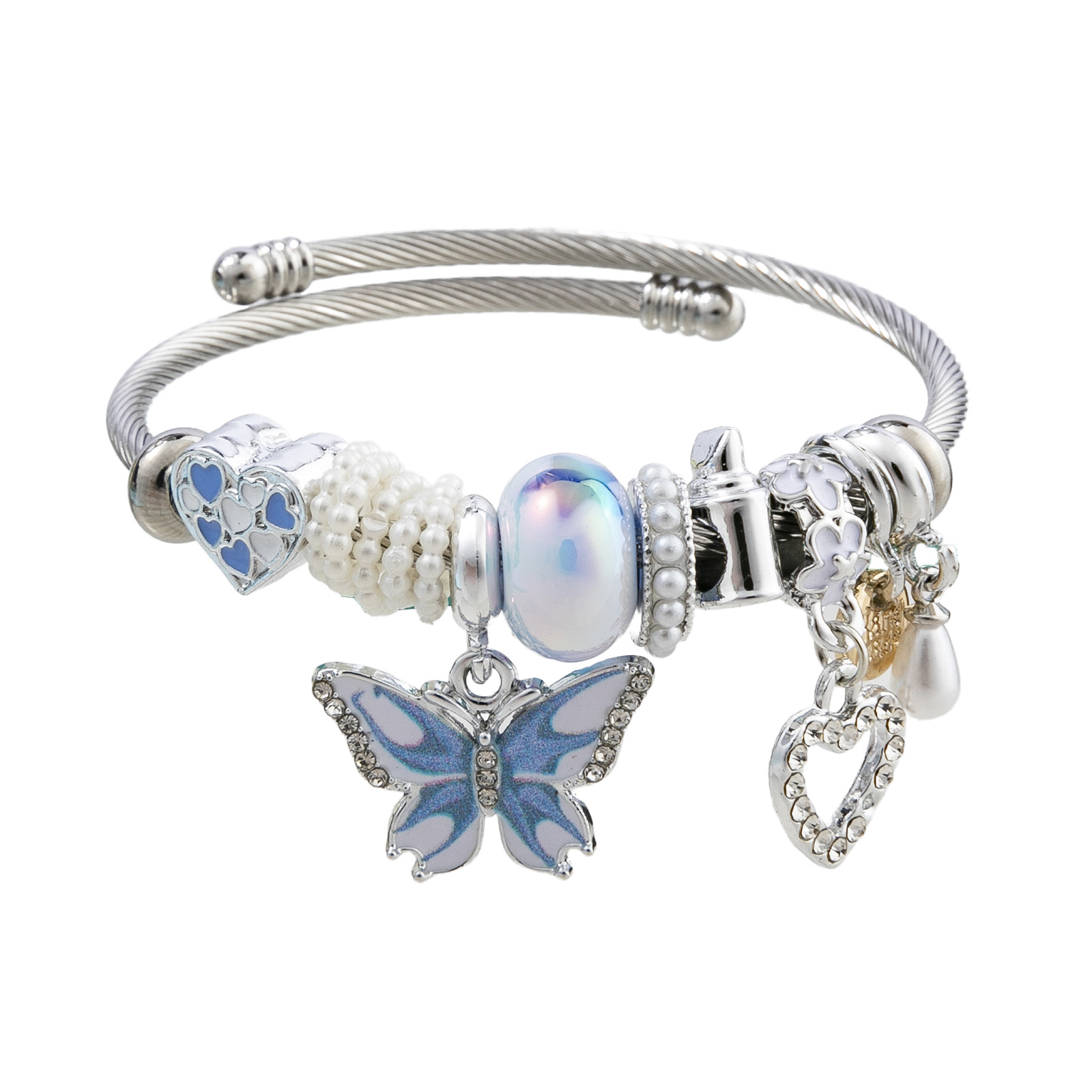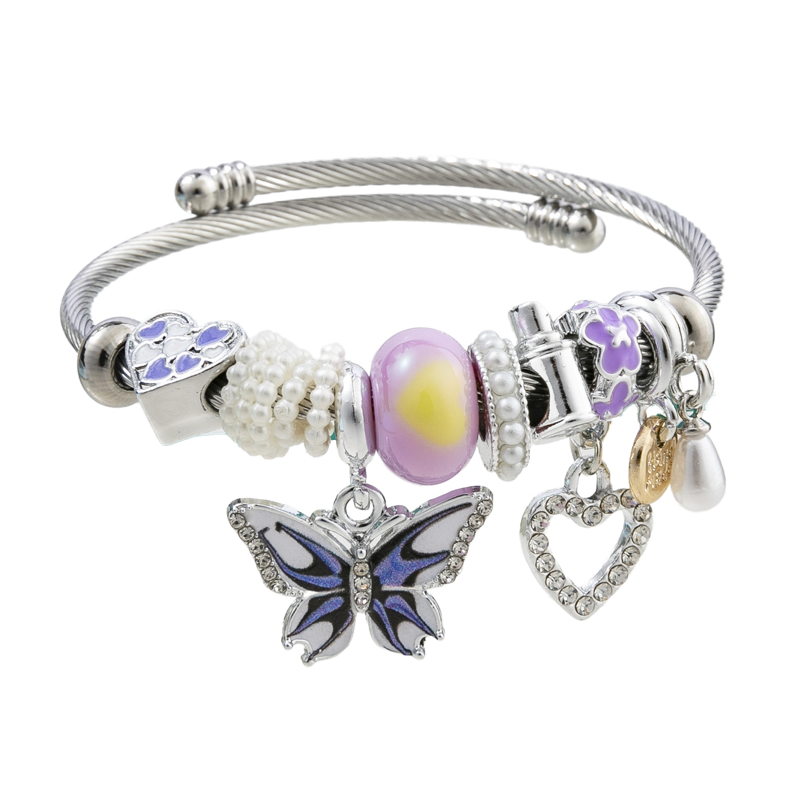 European Armbånd, 304 rustfrit stål, med Plastic Pearl & Zinc Alloy, Butterfly, forgyldt, Justerbar & mode smykker & for kvinde & emalje & med rhinestone, flere farver til valg, diameter about:5.5cm, Solgt af PC