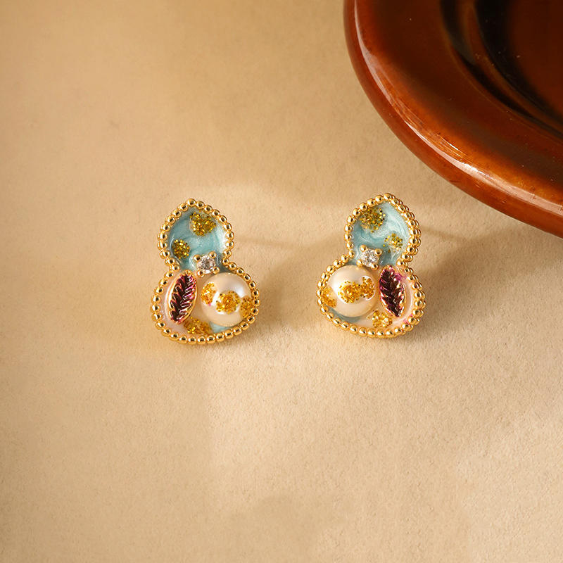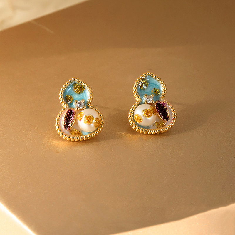 Messing Stud ørering, med Plastic Pearl, Calabash, guldfarve belagt, for kvinde & emalje, flerfarvede, 13x16mm, Solgt af par