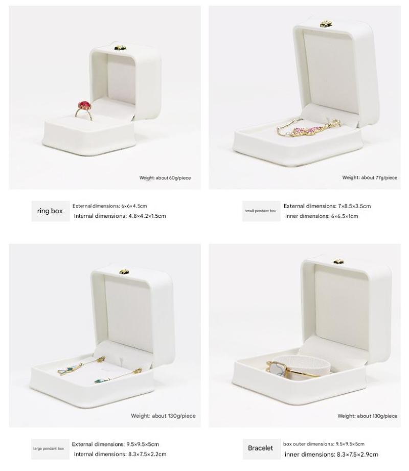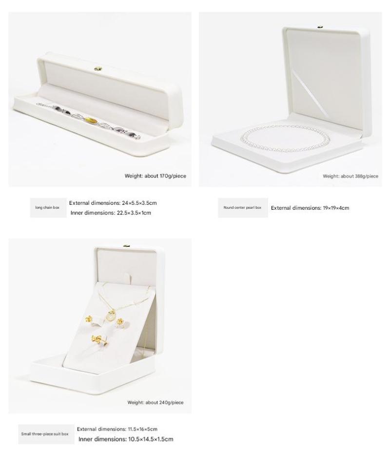 ring box 6×6×4.5cmpendant box 7×8.5×3.5cmpendant box 9.5×9.5×5cmbangle box 9.5×9.5×5cmnecklace box 24×5.5×3.5cmjewelry set box 11.5×16×5cmpearl necklace box19×19×4cm