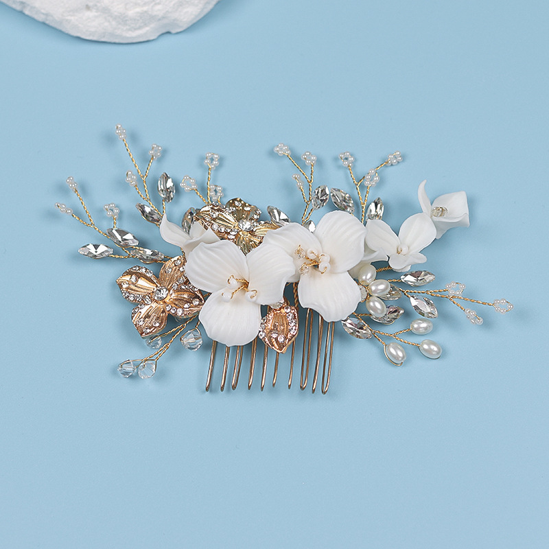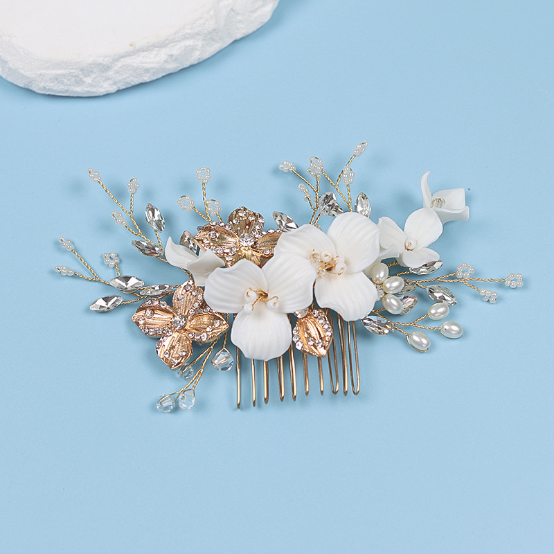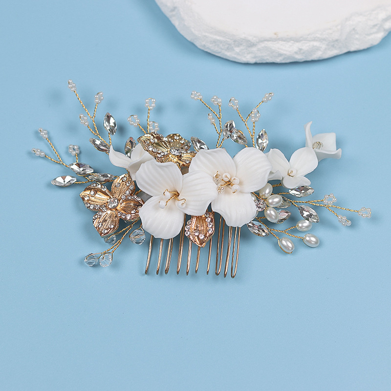 Dekorative Hårkamme, Zinc Alloy, med messingtråd & Polymer Clay & Krystal & Plastic Pearl, håndlavet, mode smykker & for kvinde & med rhinestone, gylden, Solgt af PC