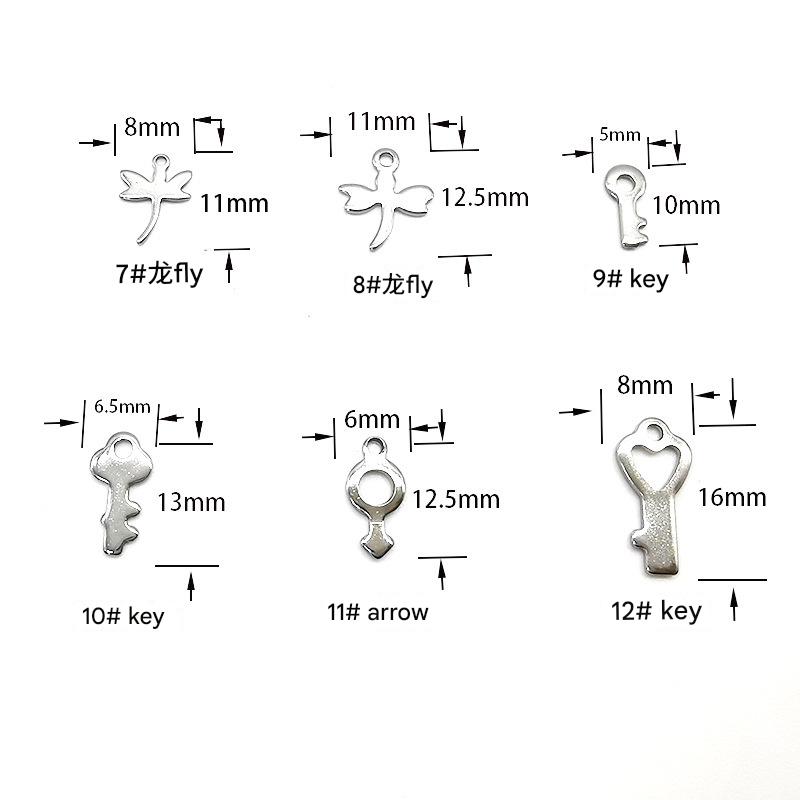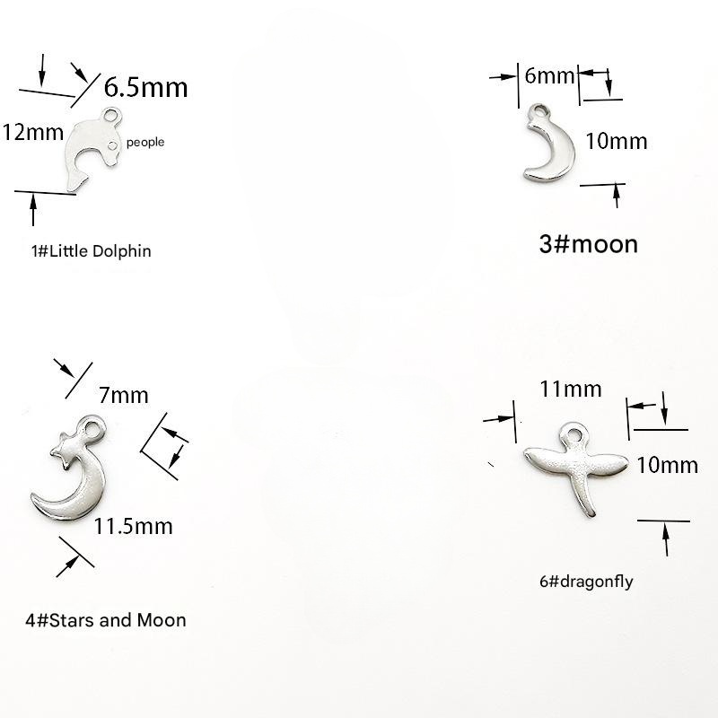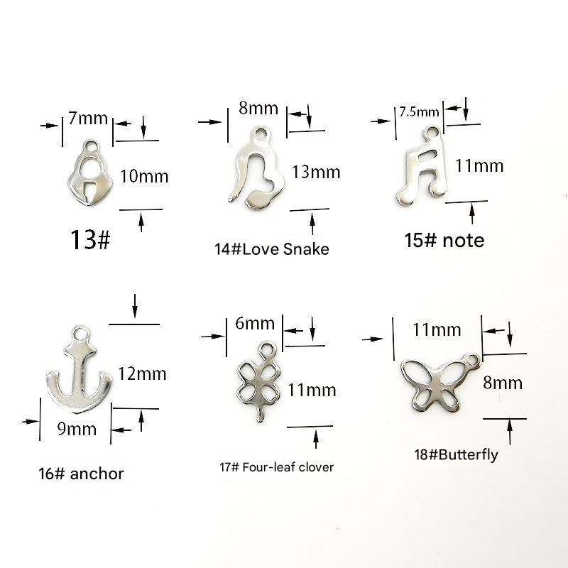 1:1# small dolphin 6.5*12mm2:2# Moon 6*10mm3:3# Star 7*11.5mm5:5# Dragonfly 11*12.5mm6:6# key 6.5*13mm7:7# Arrow 6*12.5mm9:9# 7*10mm10:10# love snake 8*13mm11:11# note 7.5*11mm12:12# anchor 9*12mm13:13# four-leaf clover 6*11mm15:15# butterfly 8*11mm16:16# Dragonfly 11*12mm17:17# butterfly 9*10mm18:18# solid five-pointed star 8mm19:19# five-pointed star 8mm