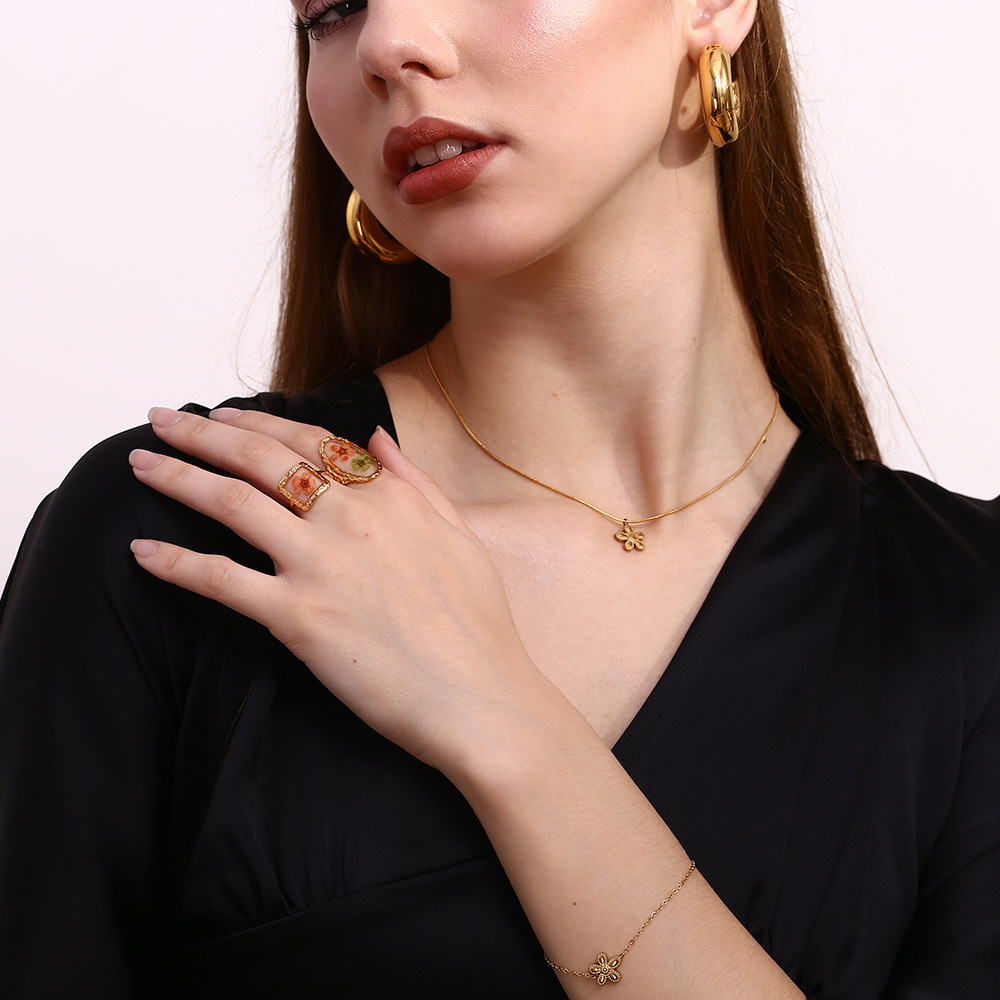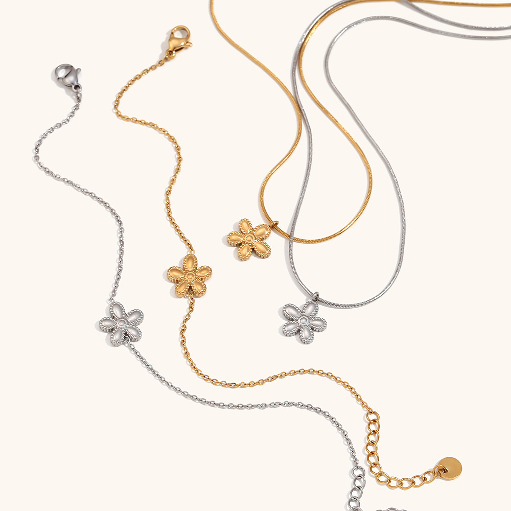 1:Fine Snake Chain Flower Bracelet-Gold2:Fine Snake Chain Flower Bracelet-Steel Color3:Thin Snake Chain Flower Pendant Necklace-Gold4:Thin Snake Chain Flower Pendant Necklace-Steel Color