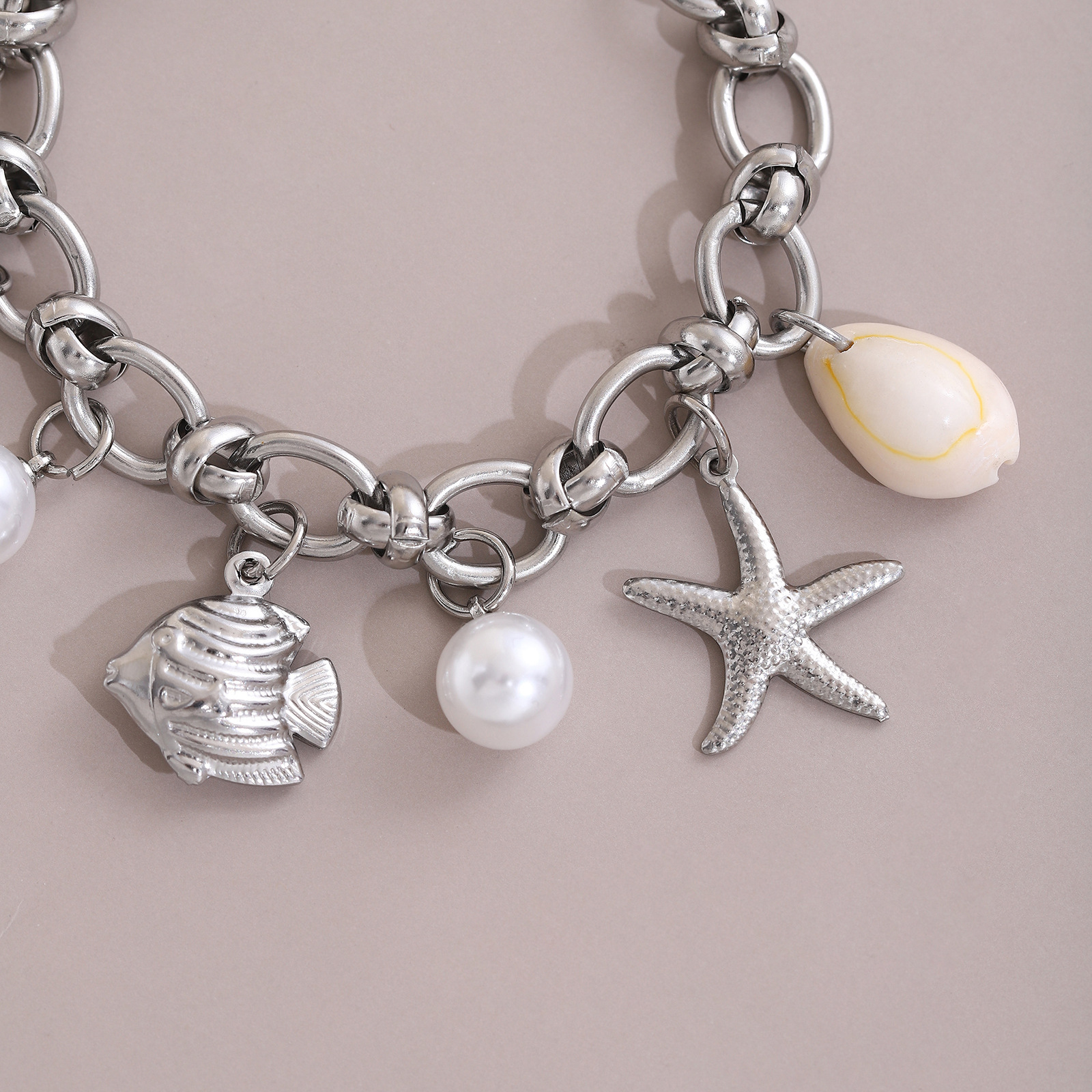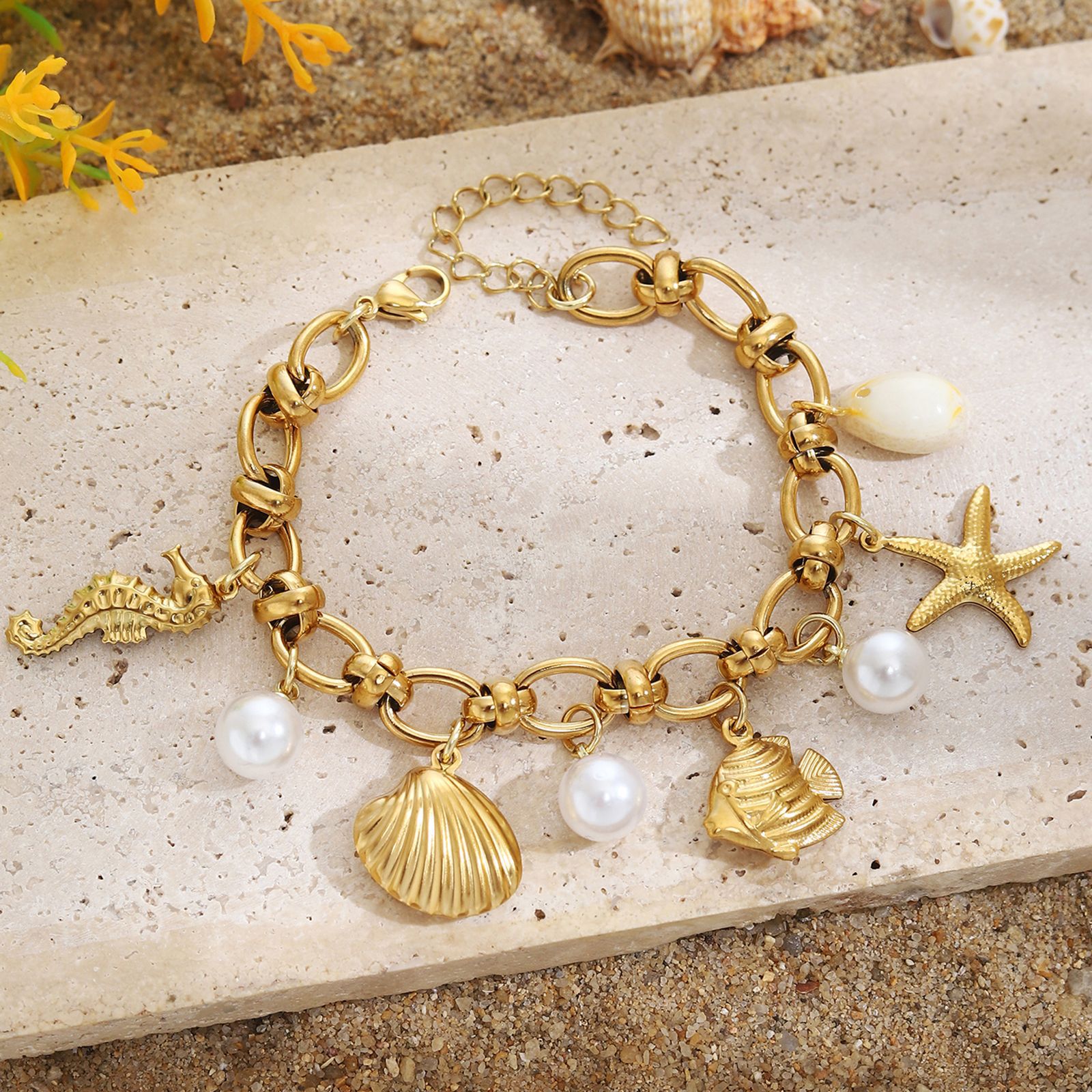 1:seahorse shell starfish fish conch pearl bracelet silver2:seahorse shell starfish fish conch pearl bracelet gold3:double stainless steel bracelet