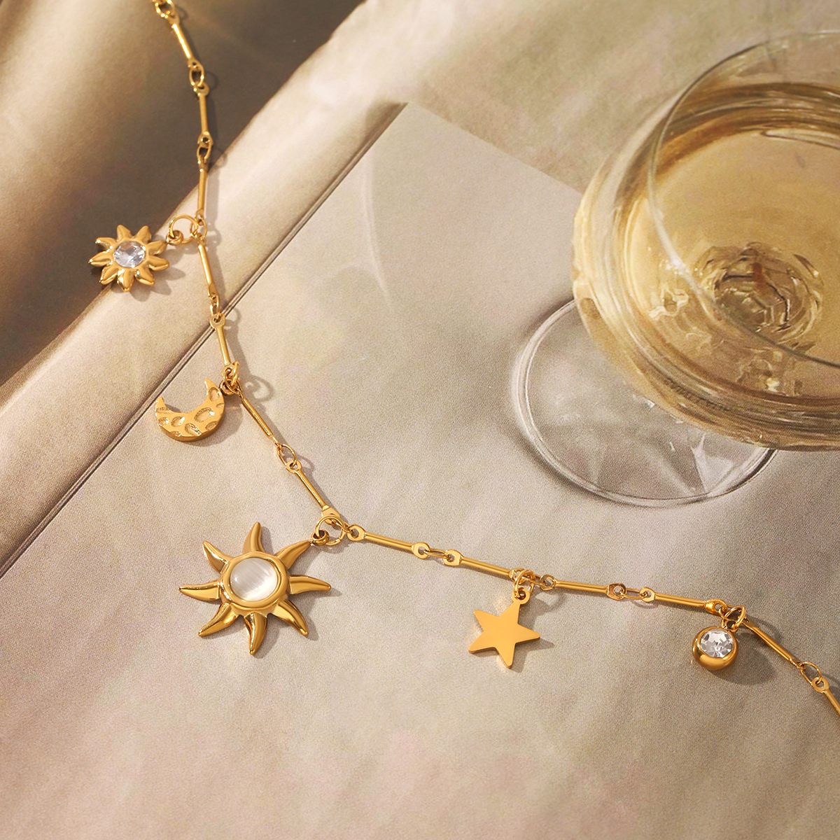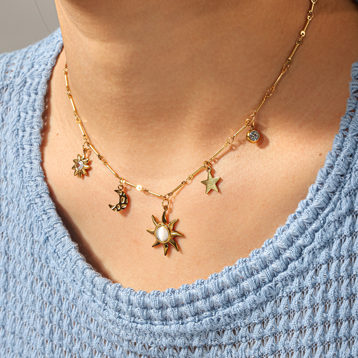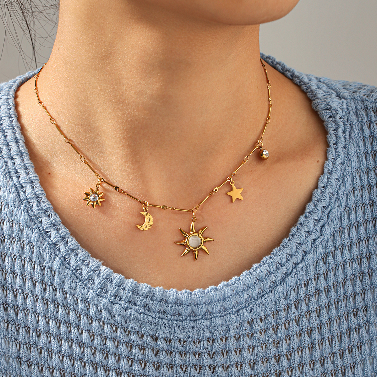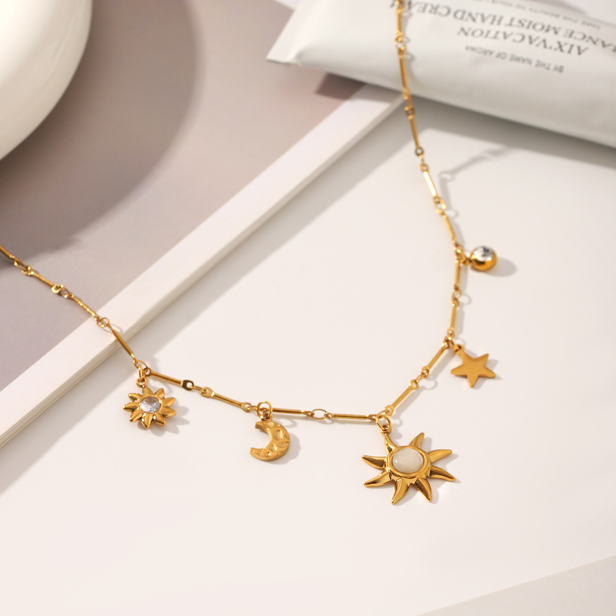 304 Edelstahl Halskette, mit Mondstein, mit Verlängerungskettchen von 5cm, Mond und Sterne, goldfarben plattiert, für Frau & mit Strass, Länge ca. 40 cm, verkauft von PC
