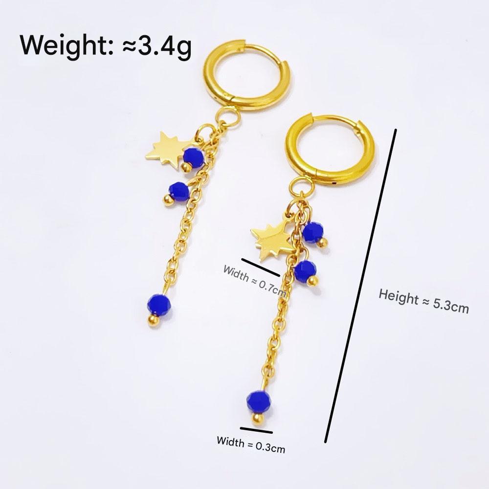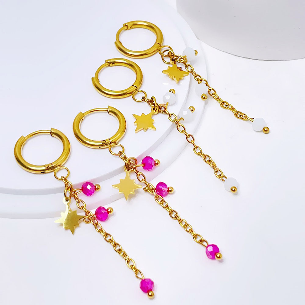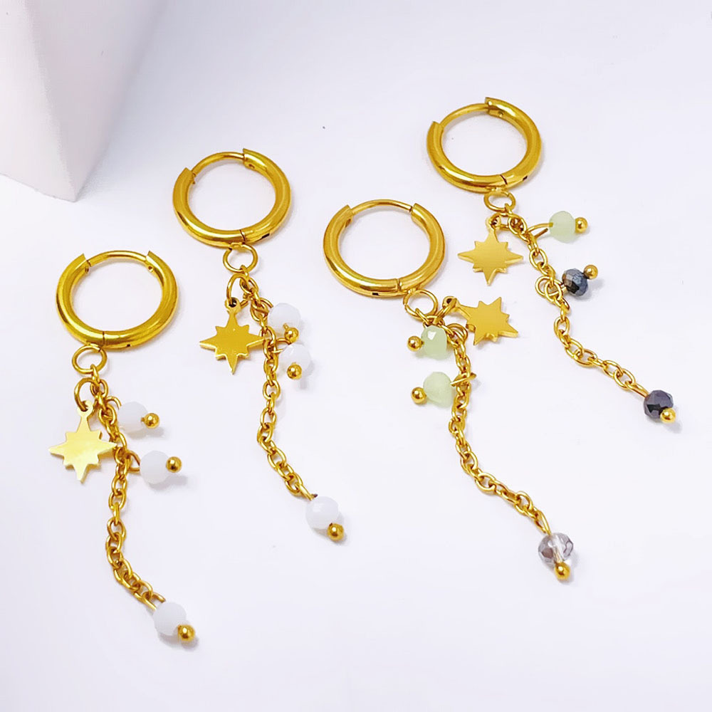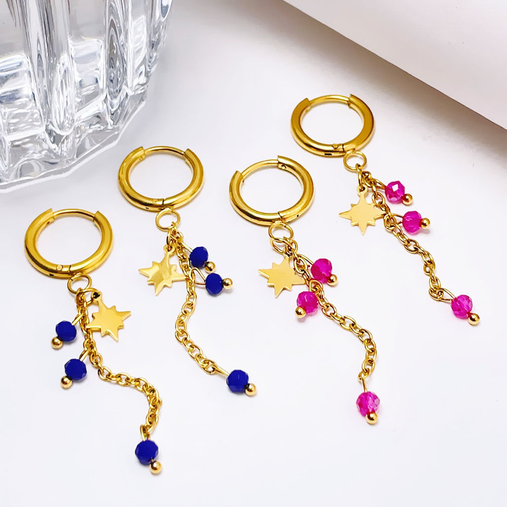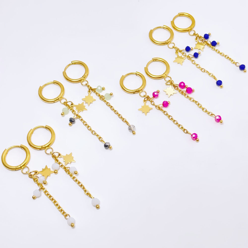 1:Stars Hanging Blue Bead Earrings Gold2:Star Danger Pink Bead Earrings Gold3:Star Hanging White Bead Earrings Gold4:Star hanging gray bead earrings gold