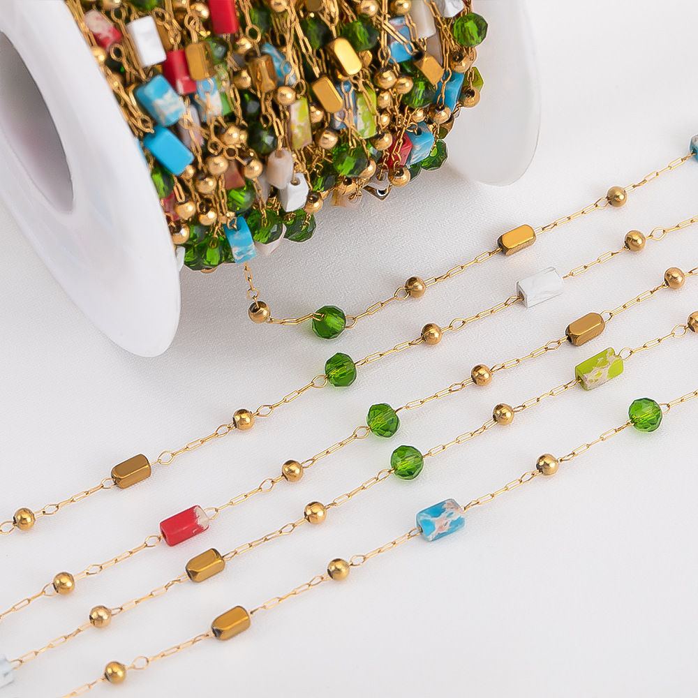 Edelstein Perlen Kette, 304 Edelstahl, mit Impression Jaspis & Kristall, plattiert, DIY, goldfarben, 1m/Tasche, verkauft von Tasche