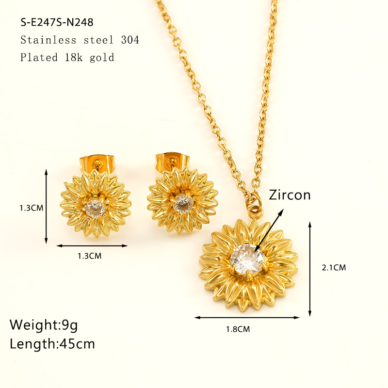 Zirkonia Edelstahl Schmuck Sets, Stud Ohrring & Halskette, 304 Edelstahl, Sonnenblume, 18K vergoldet, 2 Stück & Micro pave Zirkonia & für Frau, verkauft von setzen