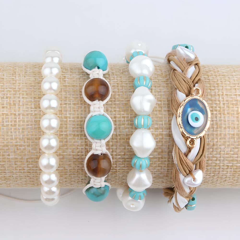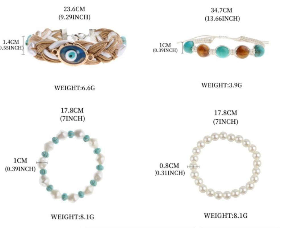 1:Devil's Eye Bracelet2:Round-Beaded Hand-Woven Adjustable Bracelet3:Off-White Beaded Bracelet4:Green Bead Bracelet5:4 Piece Set