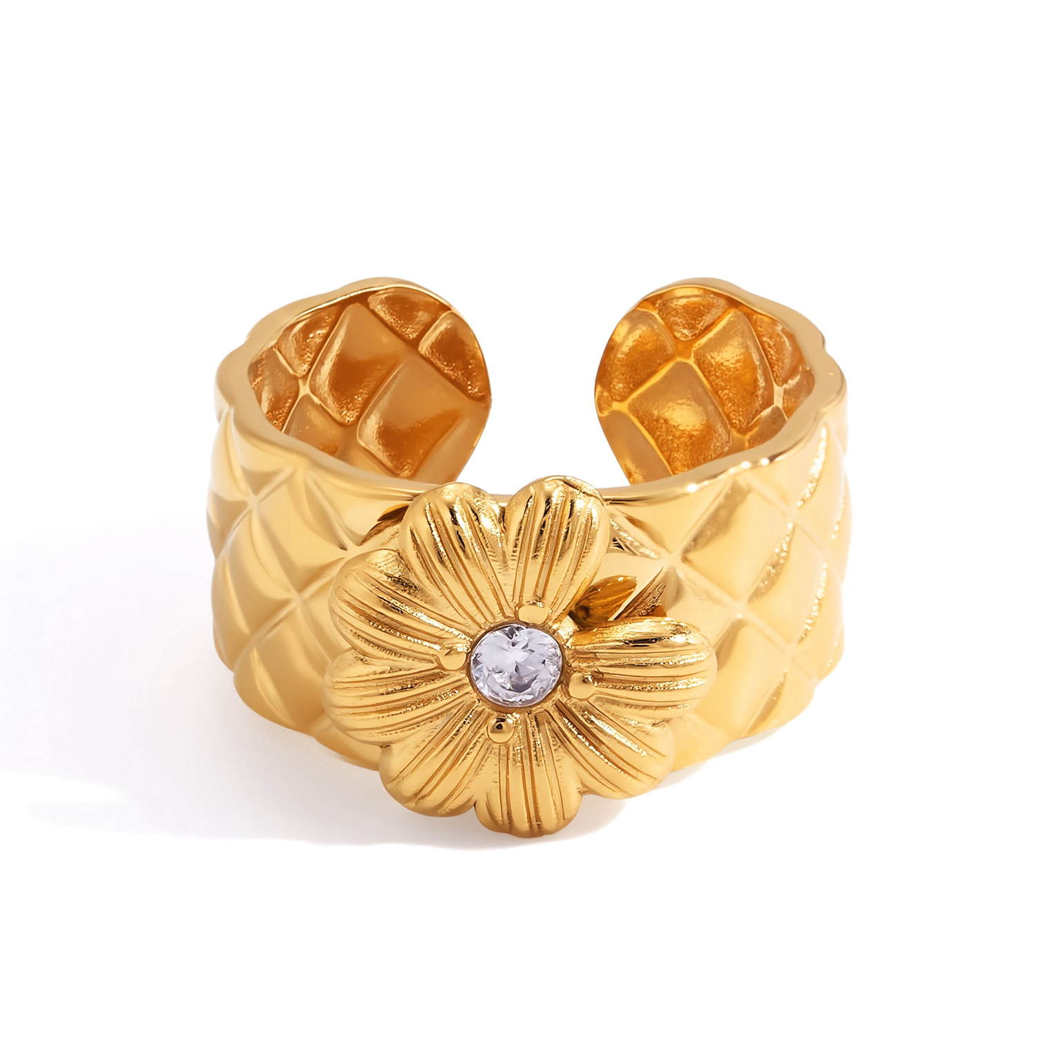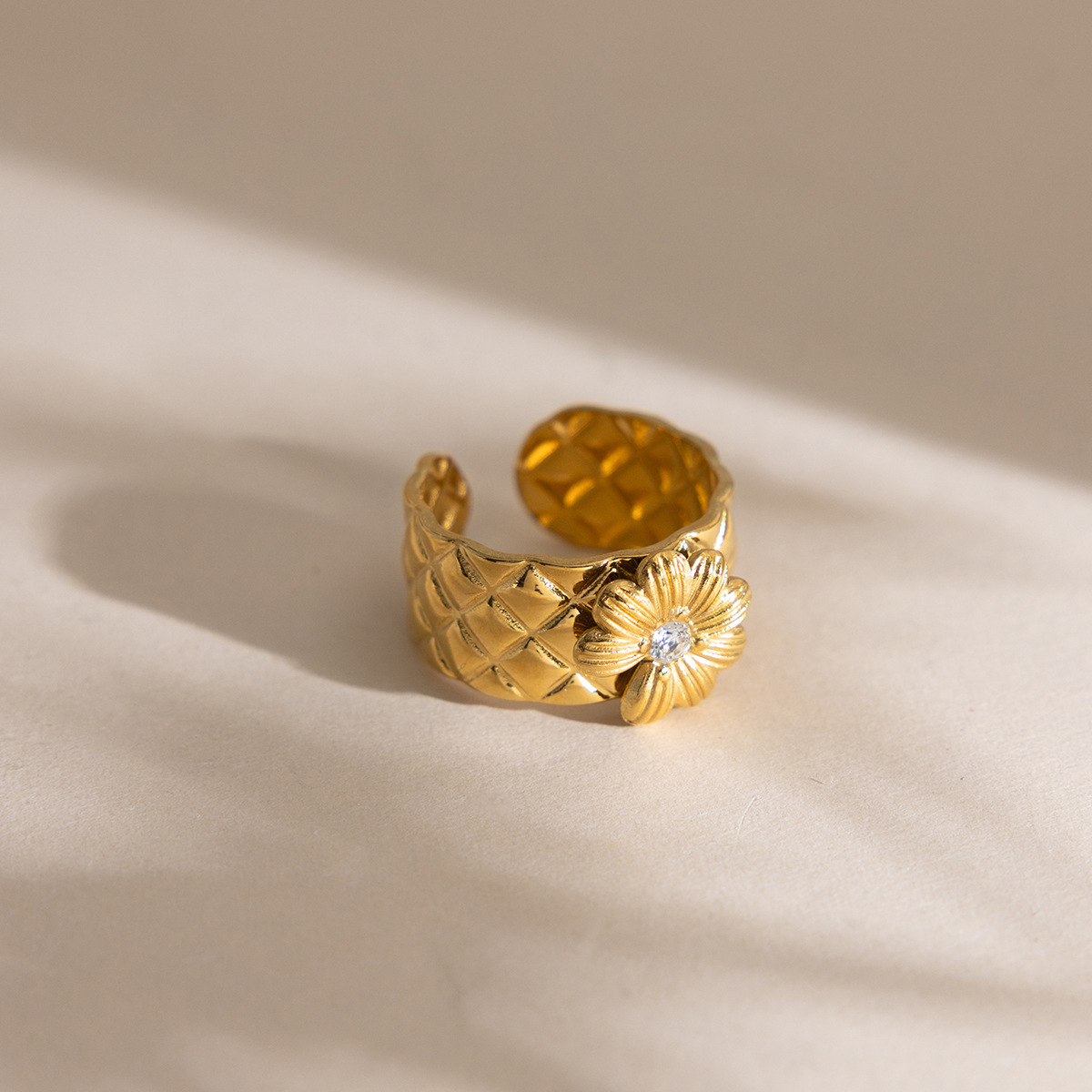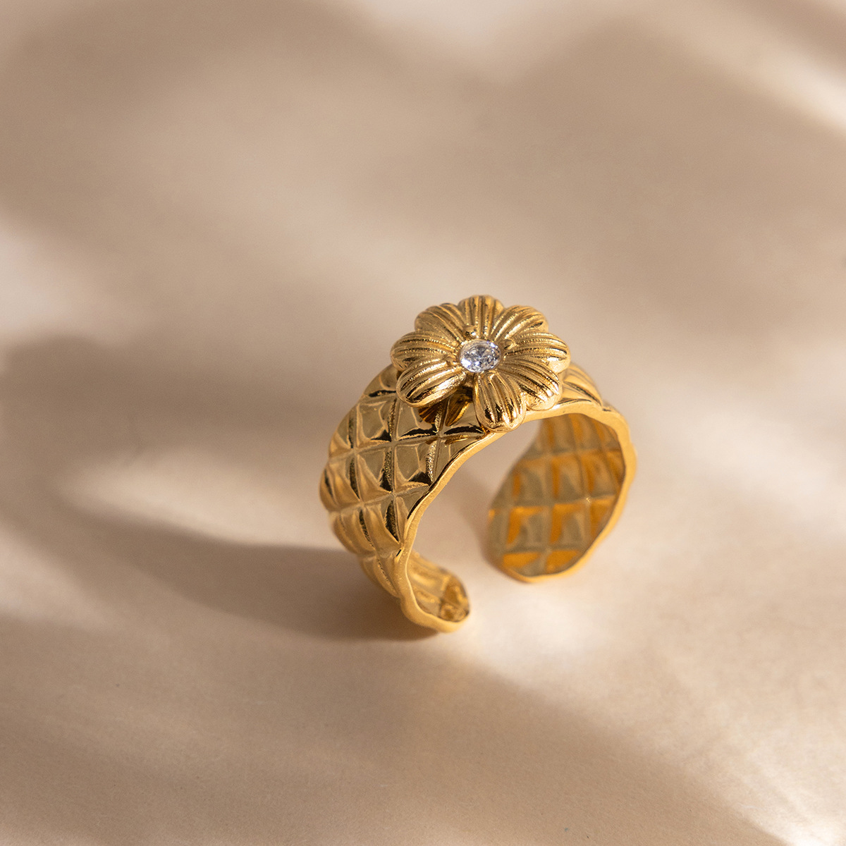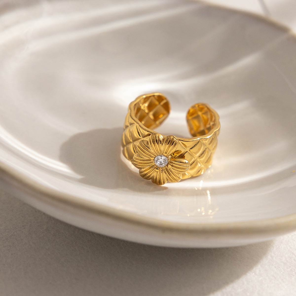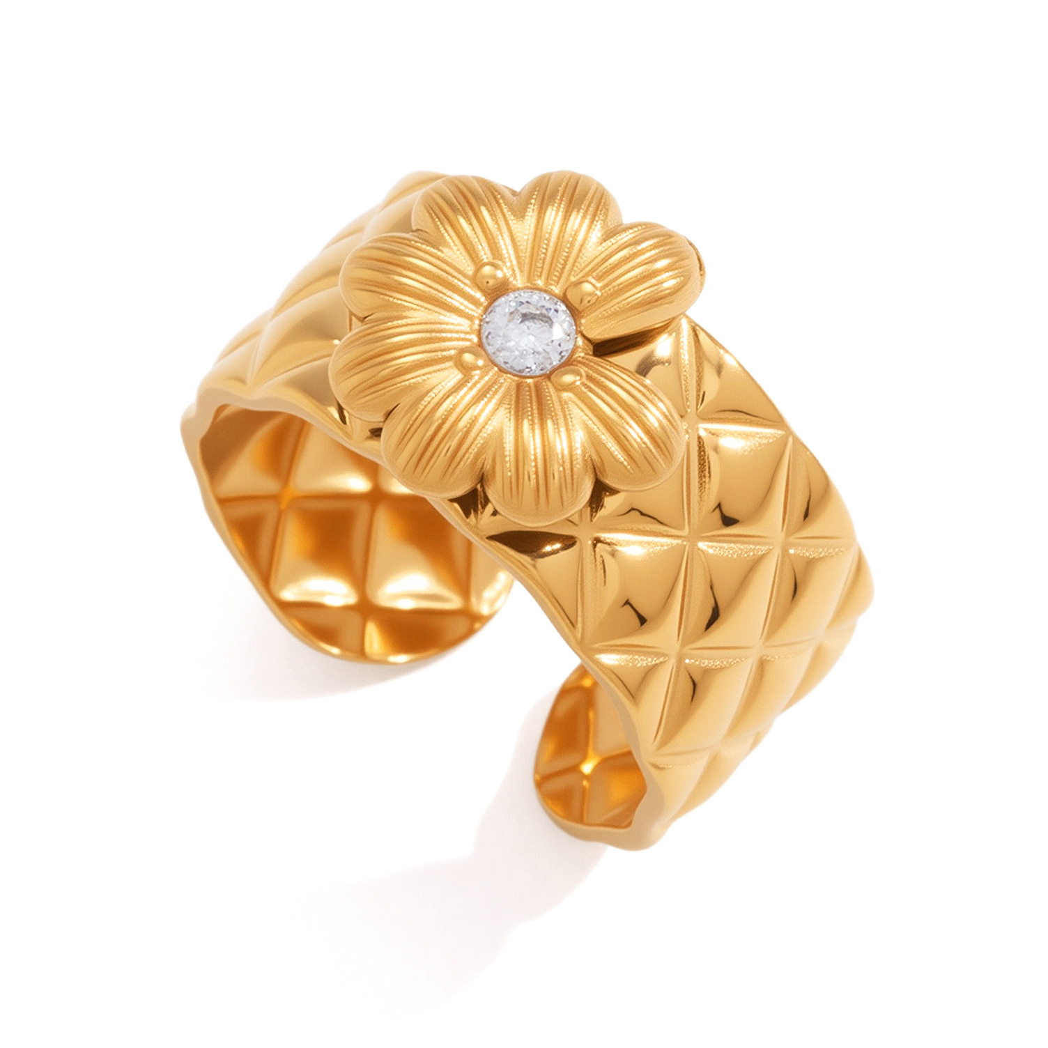 Rhinestone-Edelstahl -Finger-Ring, Edelstahl, gänseblümchenMargerite, goldfarben plattiert, für Frau & mit Strass, 12.30mm, Größe:8, verkauft von PC