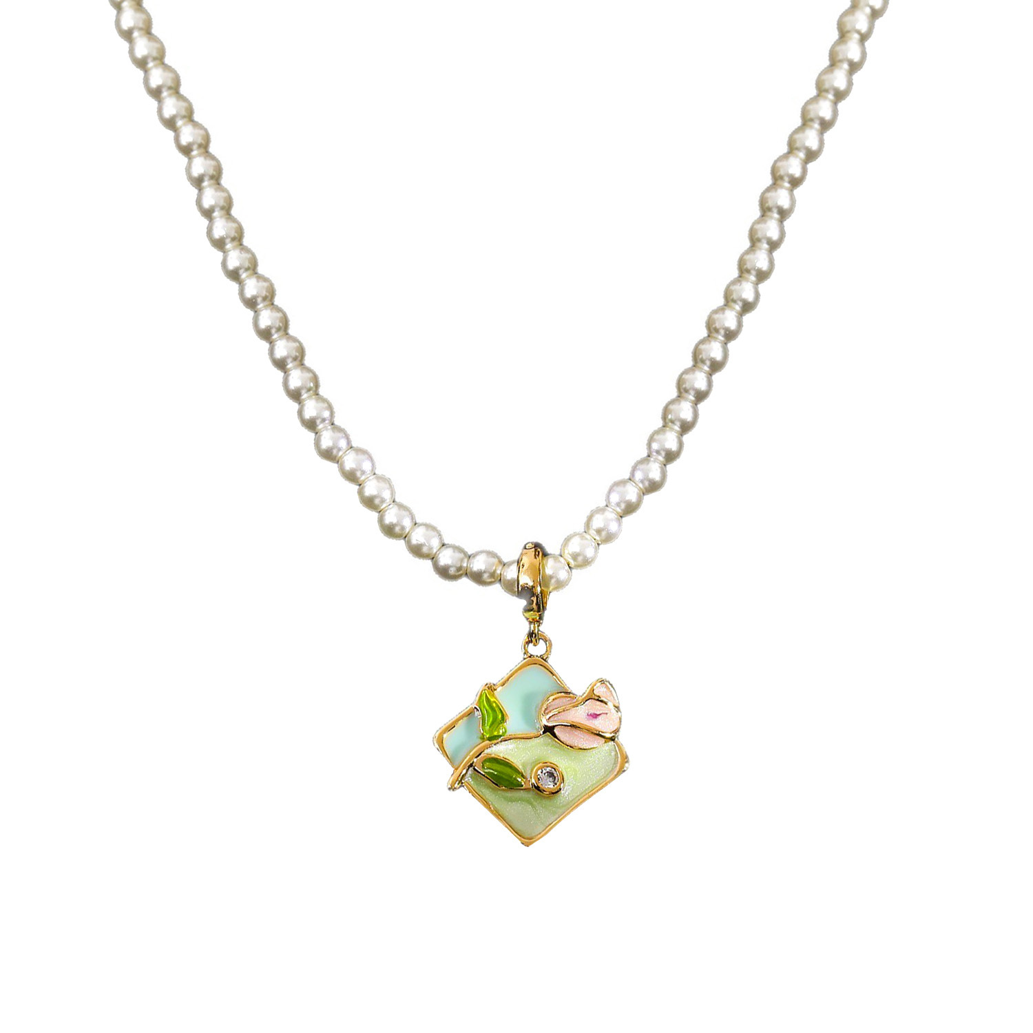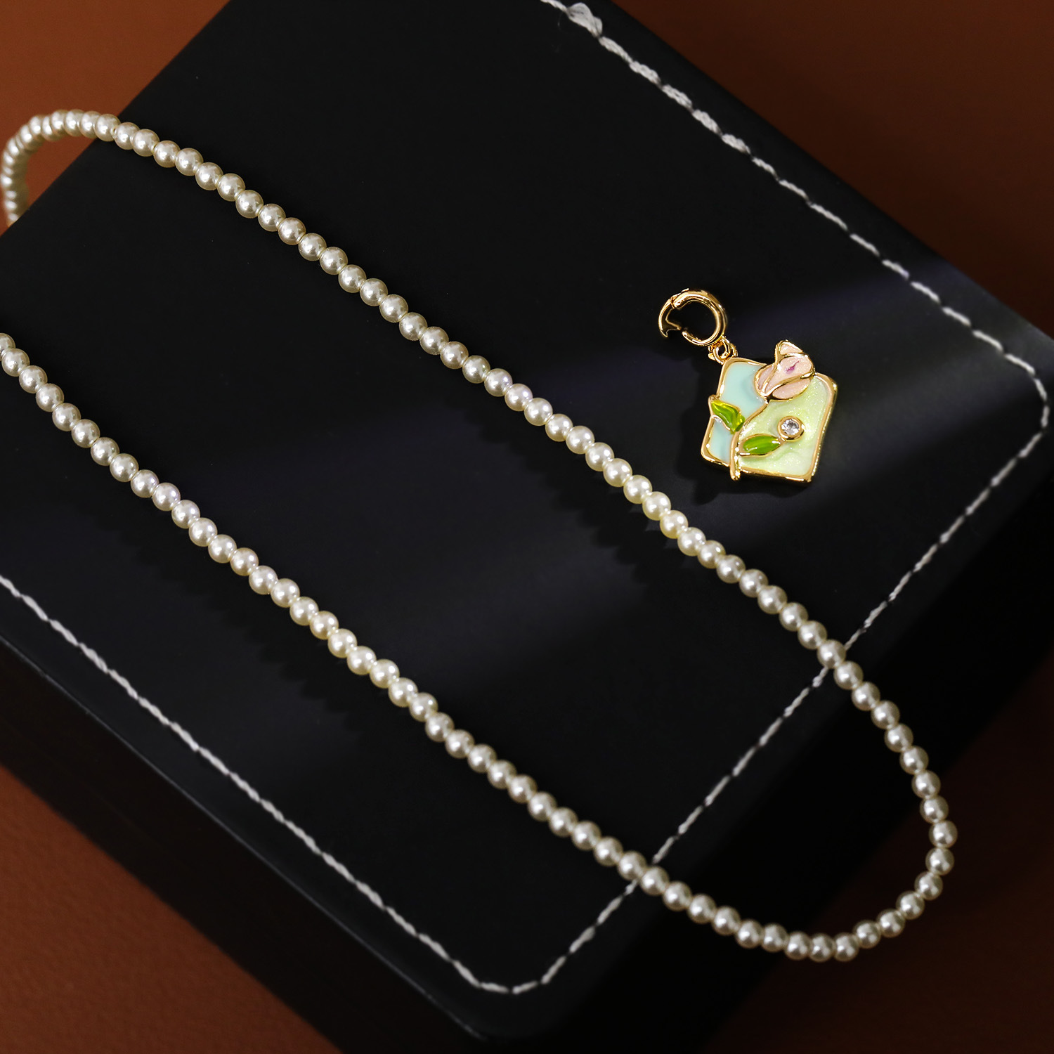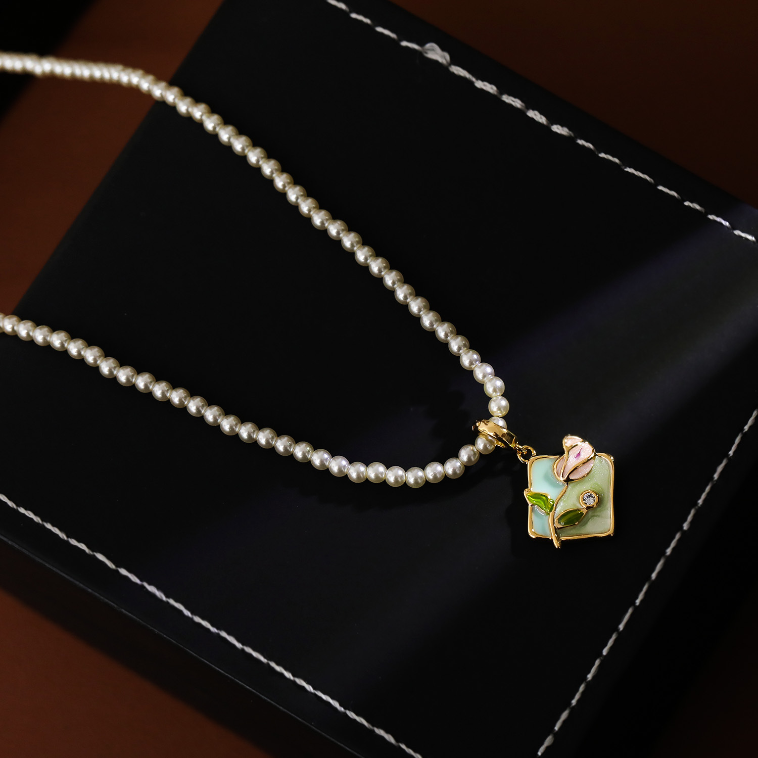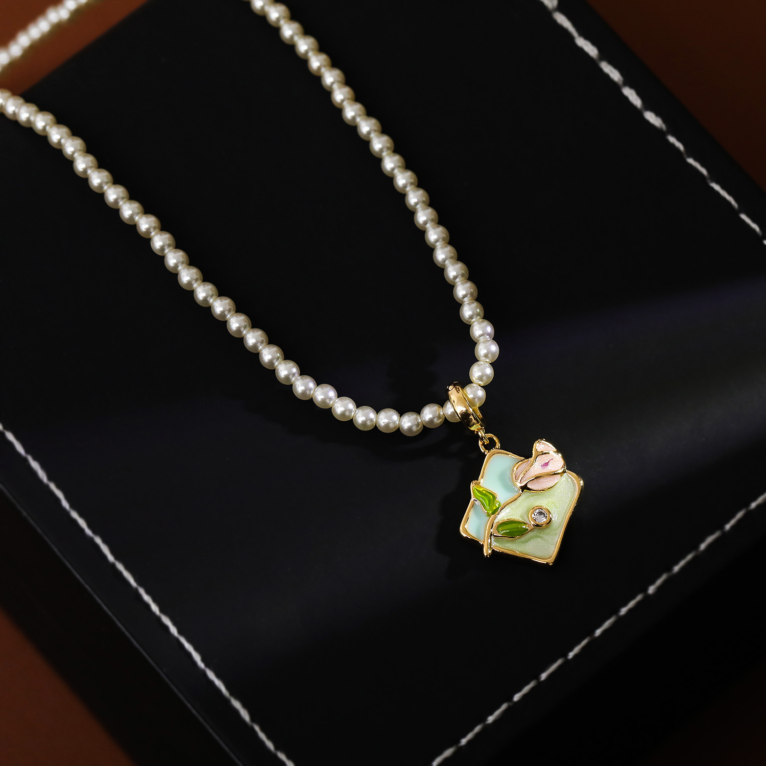 Γυάλινες χάντρες Κολιέ, Ορείχαλκος, με Χάντρες από γυαλί, με 6cm επεκτατικού αλυσίδας, Τουλίπα, επιχρυσωμένο, μικρο ανοίξει κυβικά ζιρκονία & για τη γυναίκα & σμάλτο, The pendant is 2.7cm long and 1.7cm wide, Μήκος 39 cm, Sold Με PC