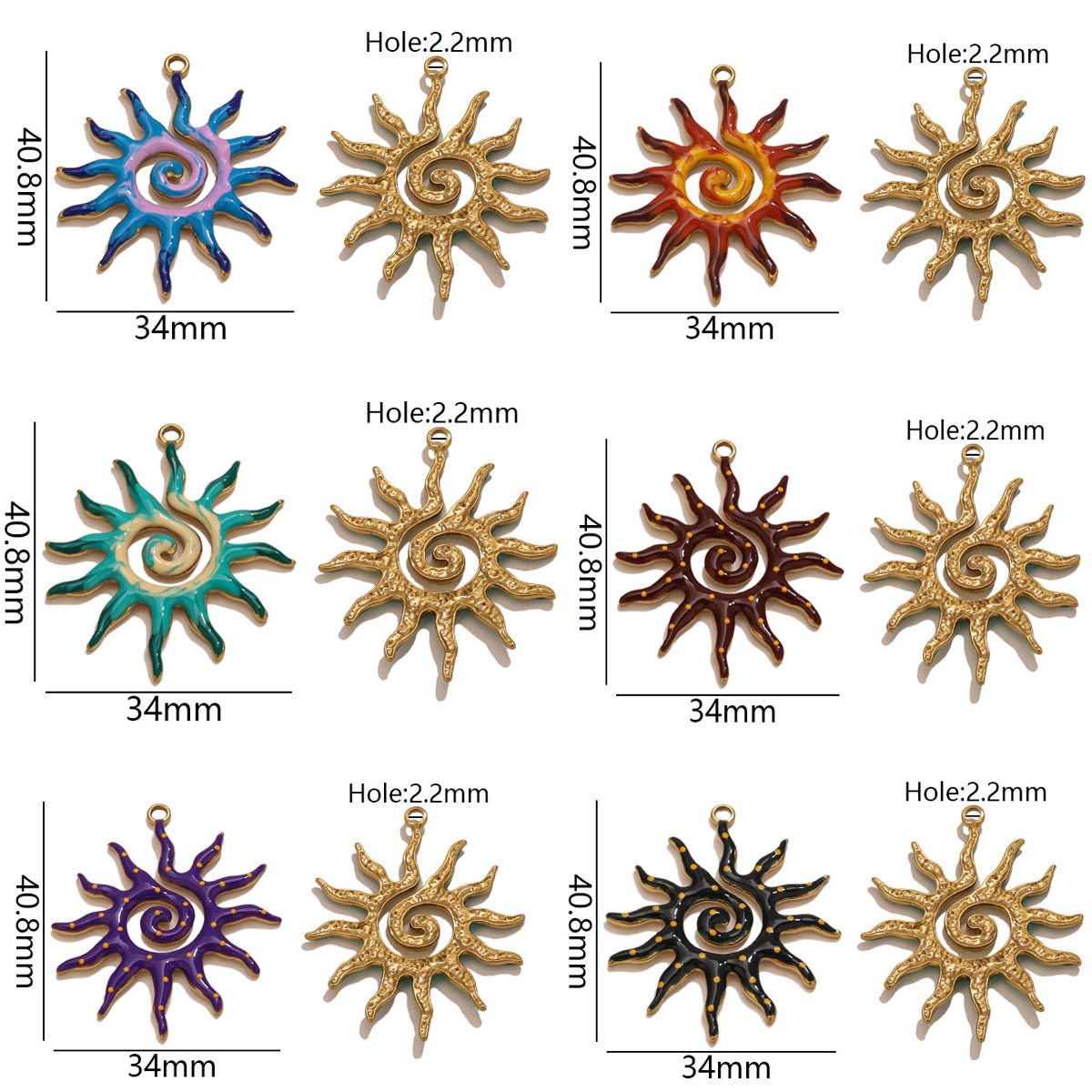 Colgantes de Acero Inoxidable, acero inoxidable 304, sol, chapado en color dorado, Bricolaje & esmalte, más colores para la opción, 34x40.80mm, agujero:aproximado 2.2mm, Vendido por UD