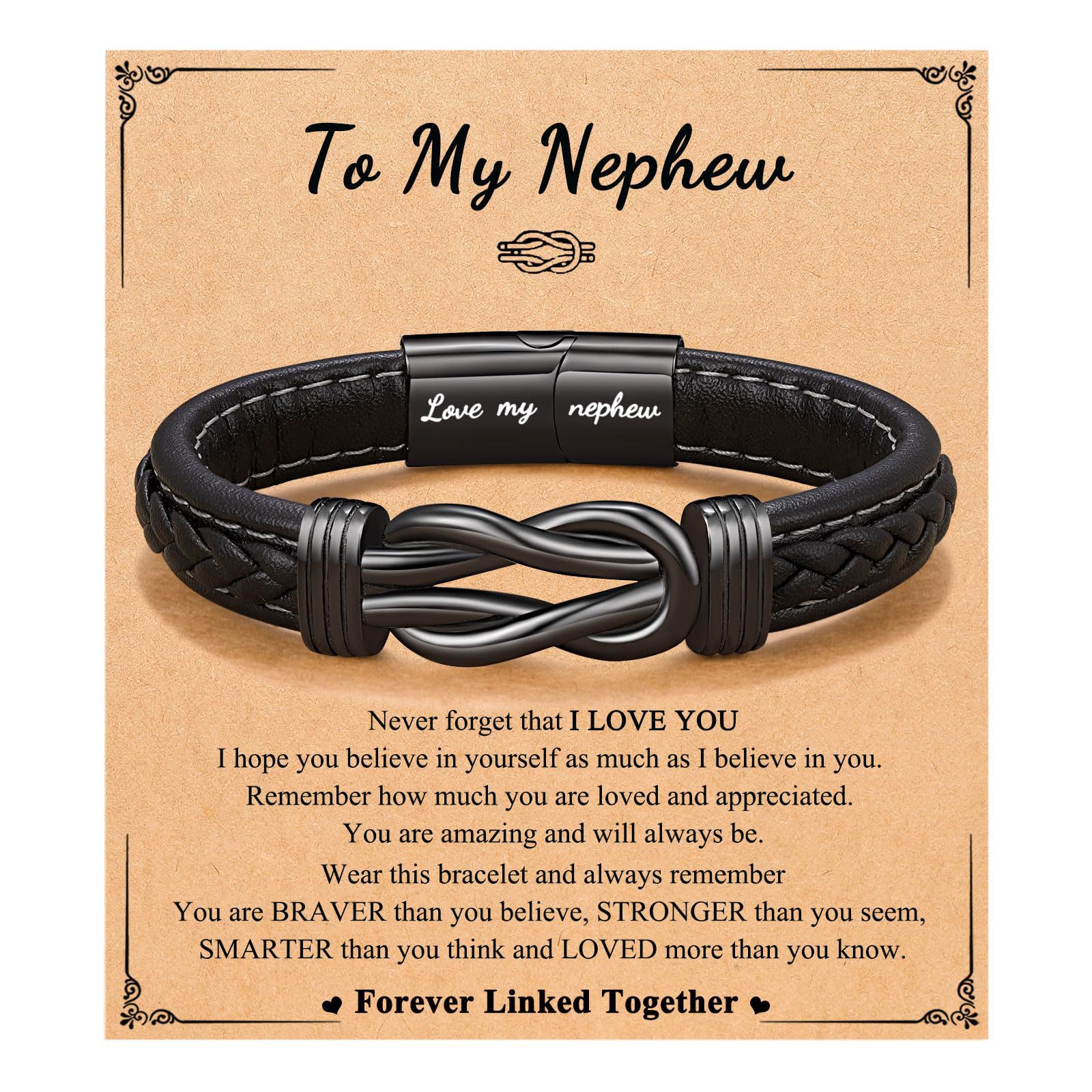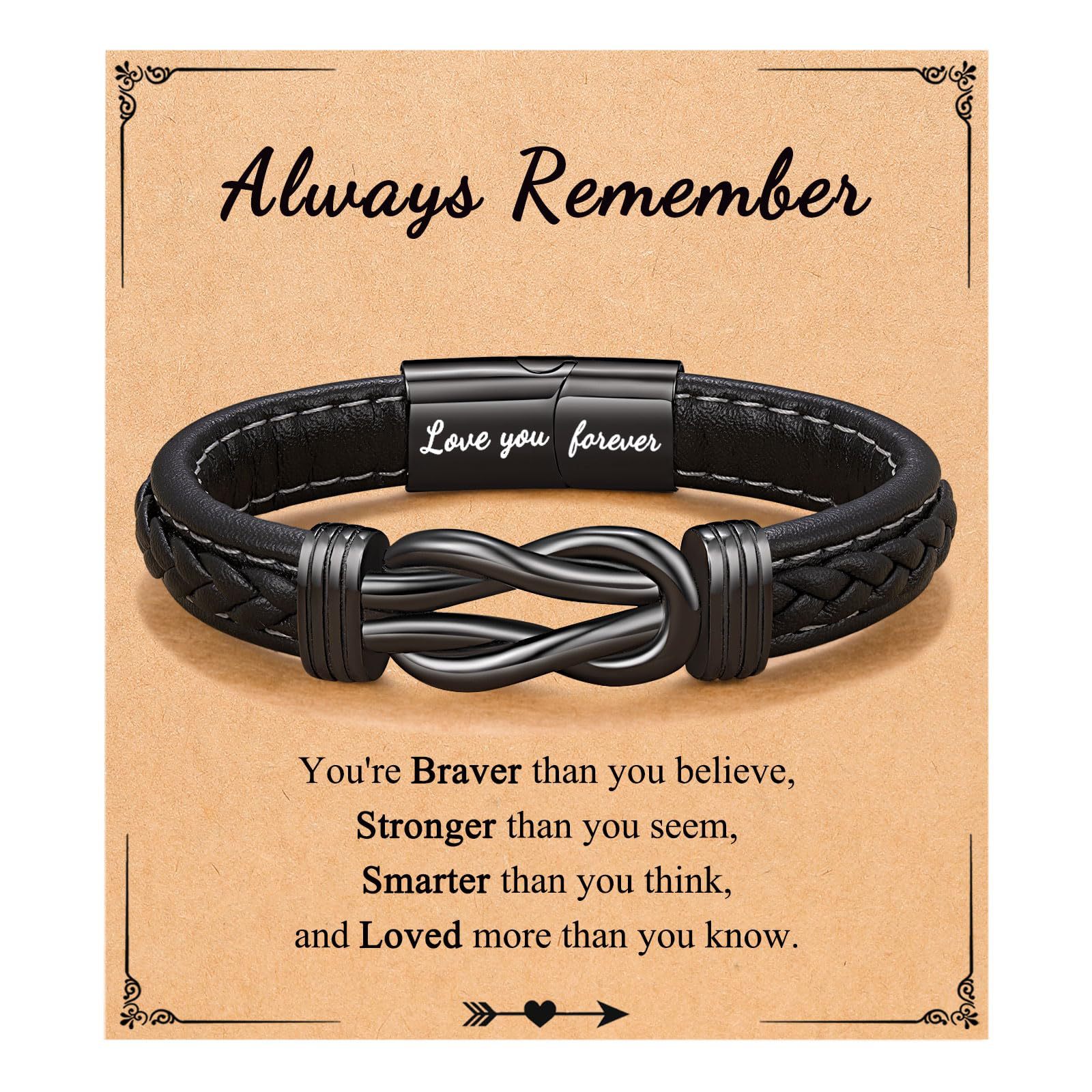 1:Black leather bracelet Graduate lettering Graduation card2:Black leather bracelet   Love you forever engraving   Husband card3:Black leather bracelet   Love my Nephew engraving   Nephew card4:Black leather bracelet   Love My Grandson engraving   Grandson card5:Black leather bracelet   Love you forever engraving   Always card6:Black leather bracelet   Love you forever engraving   Brother card7:Black leather bracelet   Love you forever engraving   Man card 18:Black leather bracelet   Love you forever engraving   Man card 29:Black leather bracelet   Love My Son engraved   Son card 110:Black leather bracelet   Love you forever engraving   Son card 211:Brown leather bracelet   Love My Son engraved   Son card 212:Brown leather bracelet   Love you forever engraving   Man card 213:Brown leather bracelet   Love my Nephew engraving   Nephew card14:Brown leather bracelet   Love you forever engraving   Husband card15:Brown leather bracelet   Love My Grandson engraved   Grandson card16:Brown leather bracelet   to my dad card