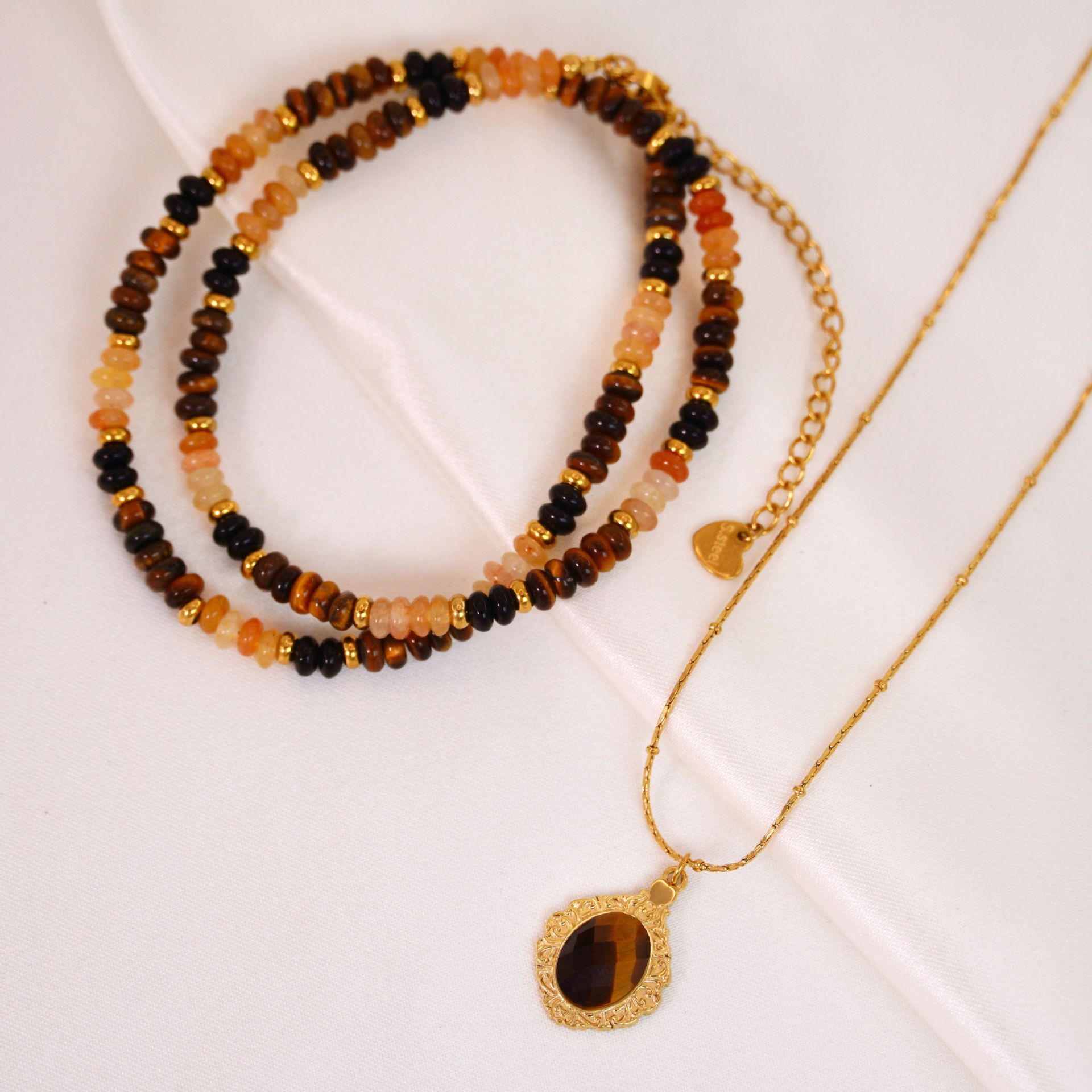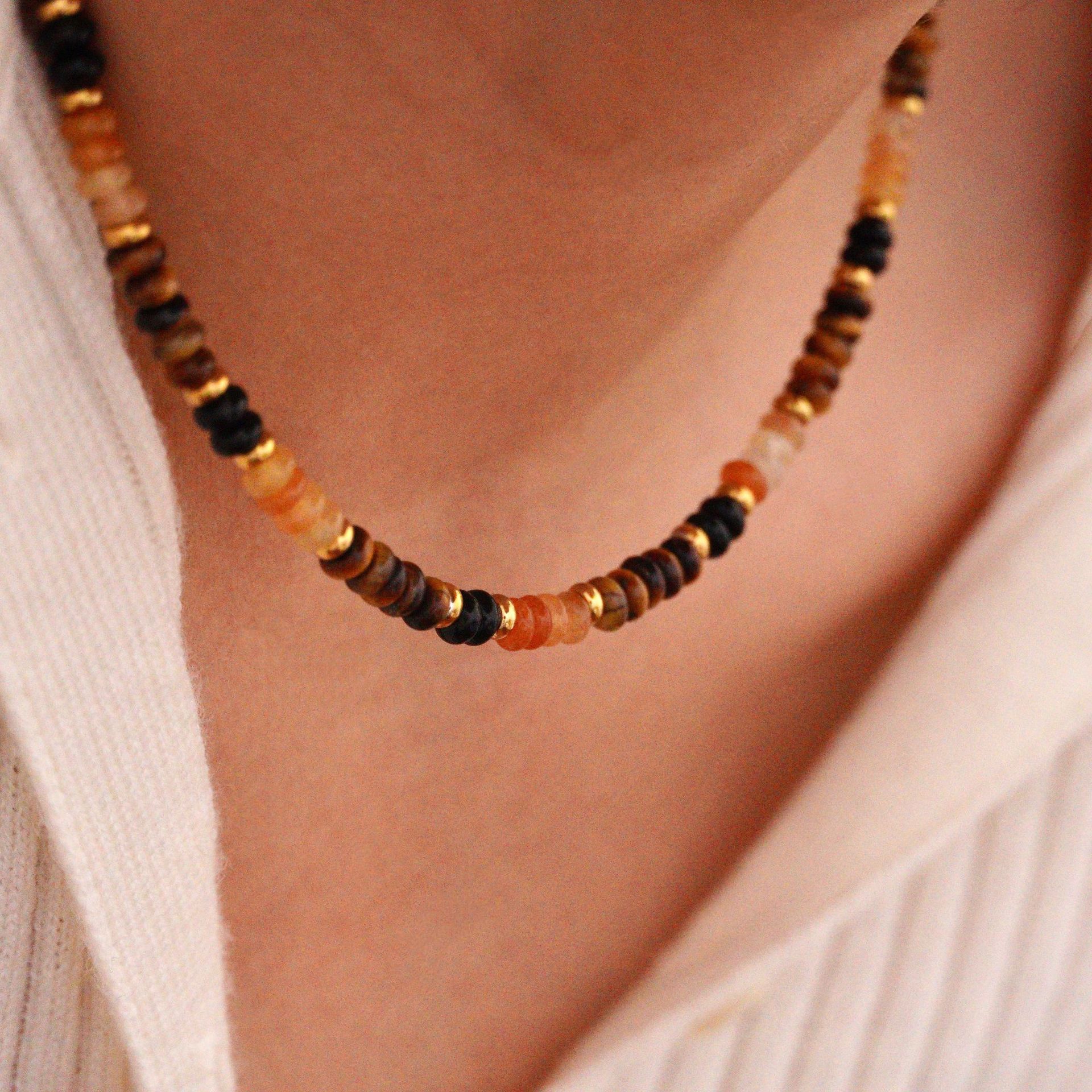 1:Yellow tiger stone beaded necklace2:French retro yellow tiger stone necklace