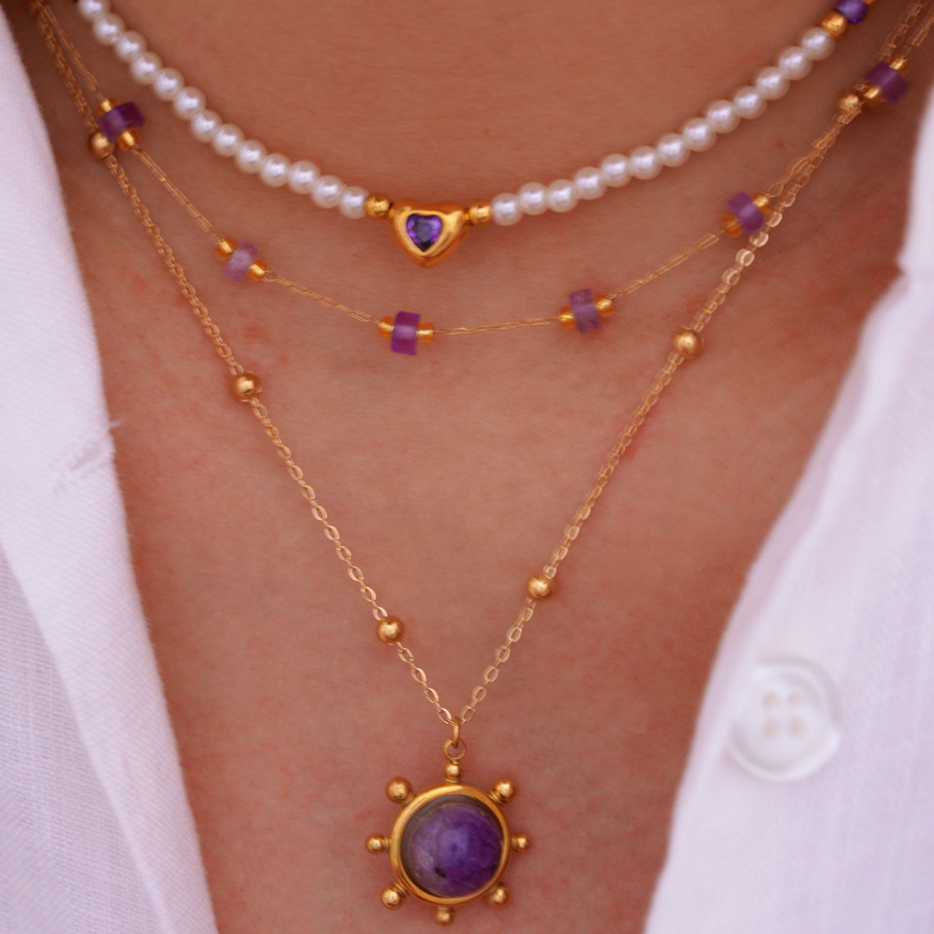 Acier titane collier, avec améthyste & perle de plastique, Placage de couleur d'or, styles différents pour le choix & pour femme, Vendu par PC