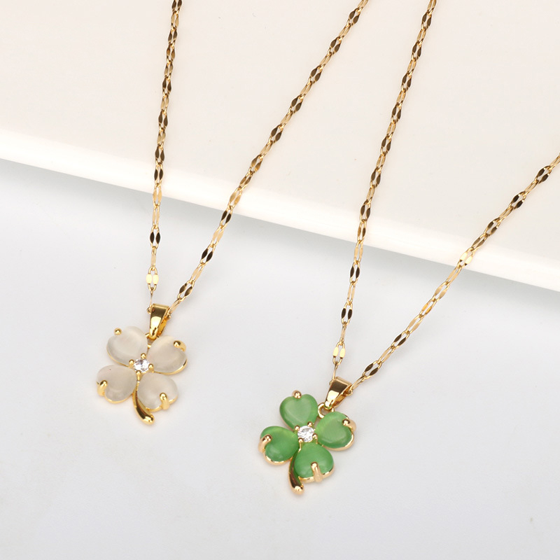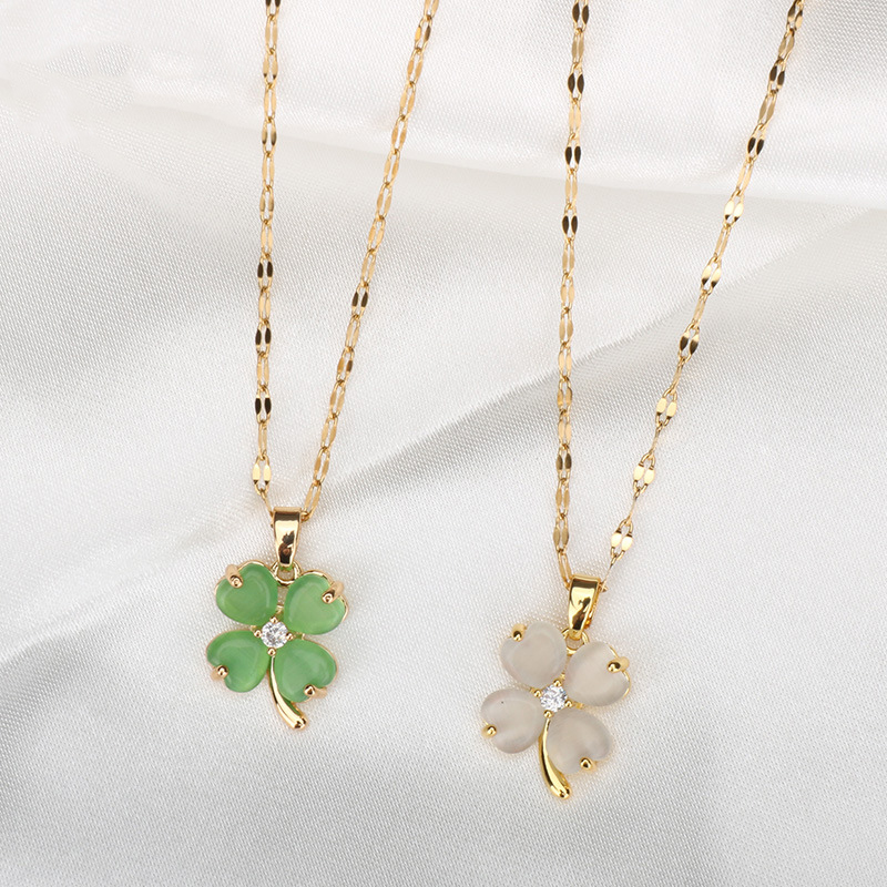 Acier titane collier, avec Jade, Trèfle à quatre feuilles, Placage de couleur d'or, différents matériaux pour le choix & pour femme, Longueur Environ 16-20 pouce, Vendu par PC