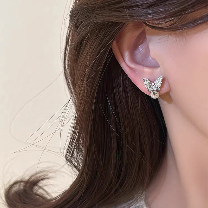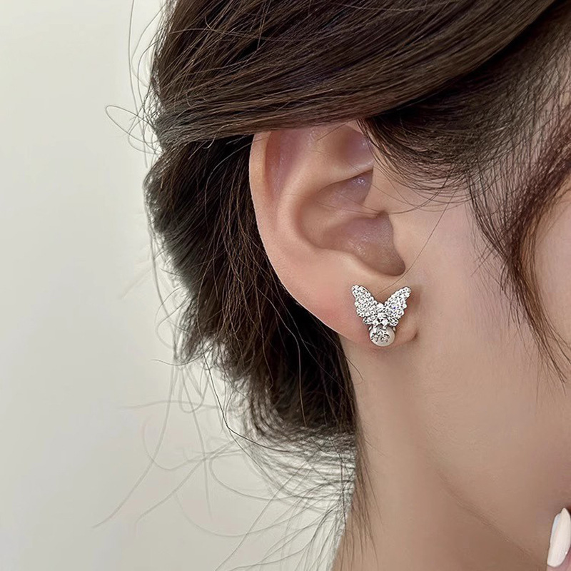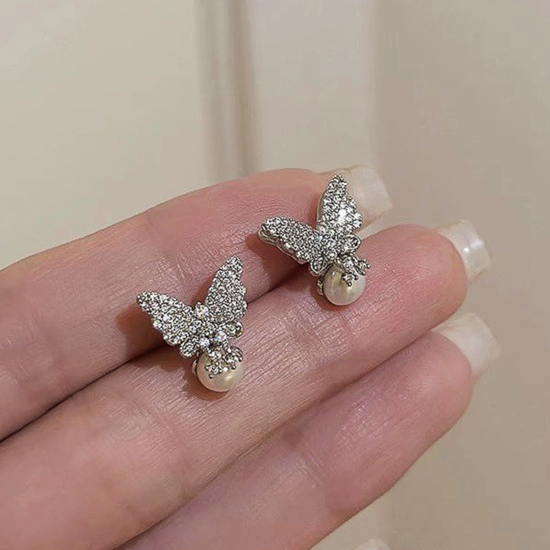 Boucles d'oreilles en laiton zircon cubique pavent, avec perle de plastique, papillon, Placage, bijoux de mode & pavé de micro zircon & pour femme, Vendu par paire