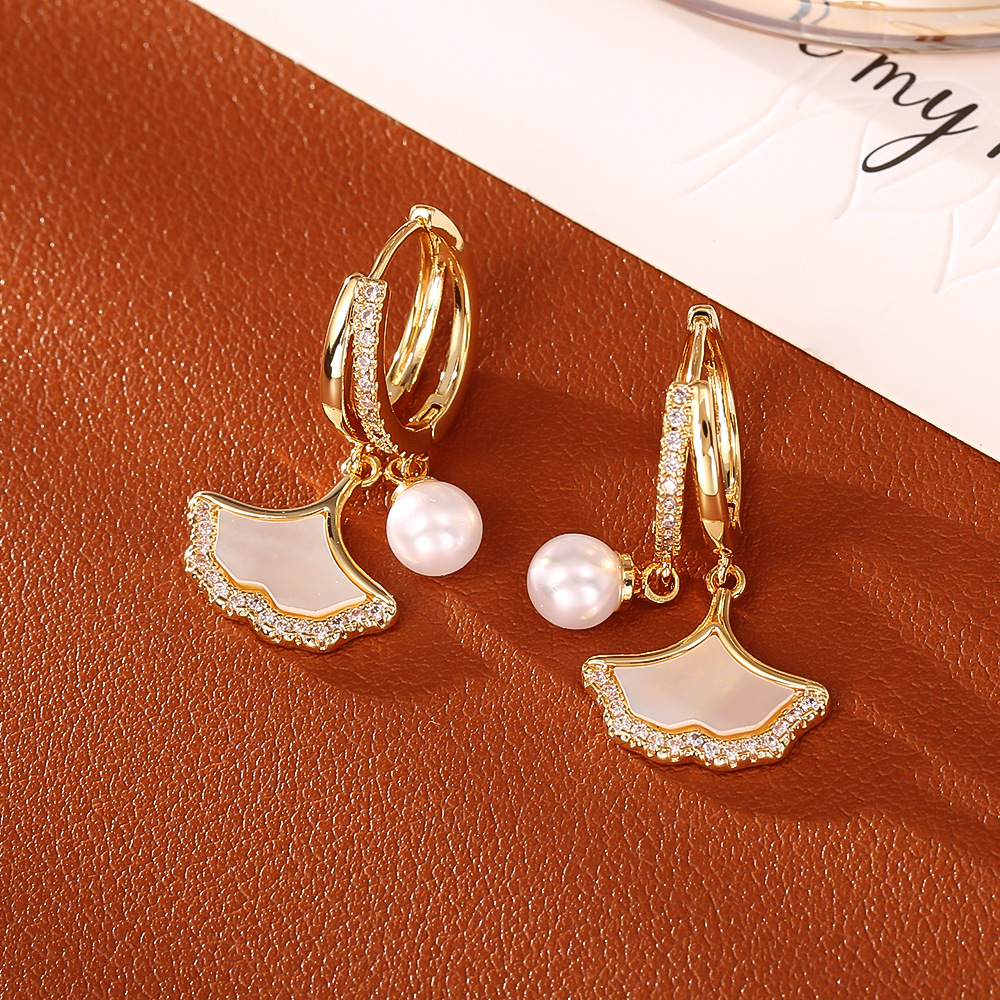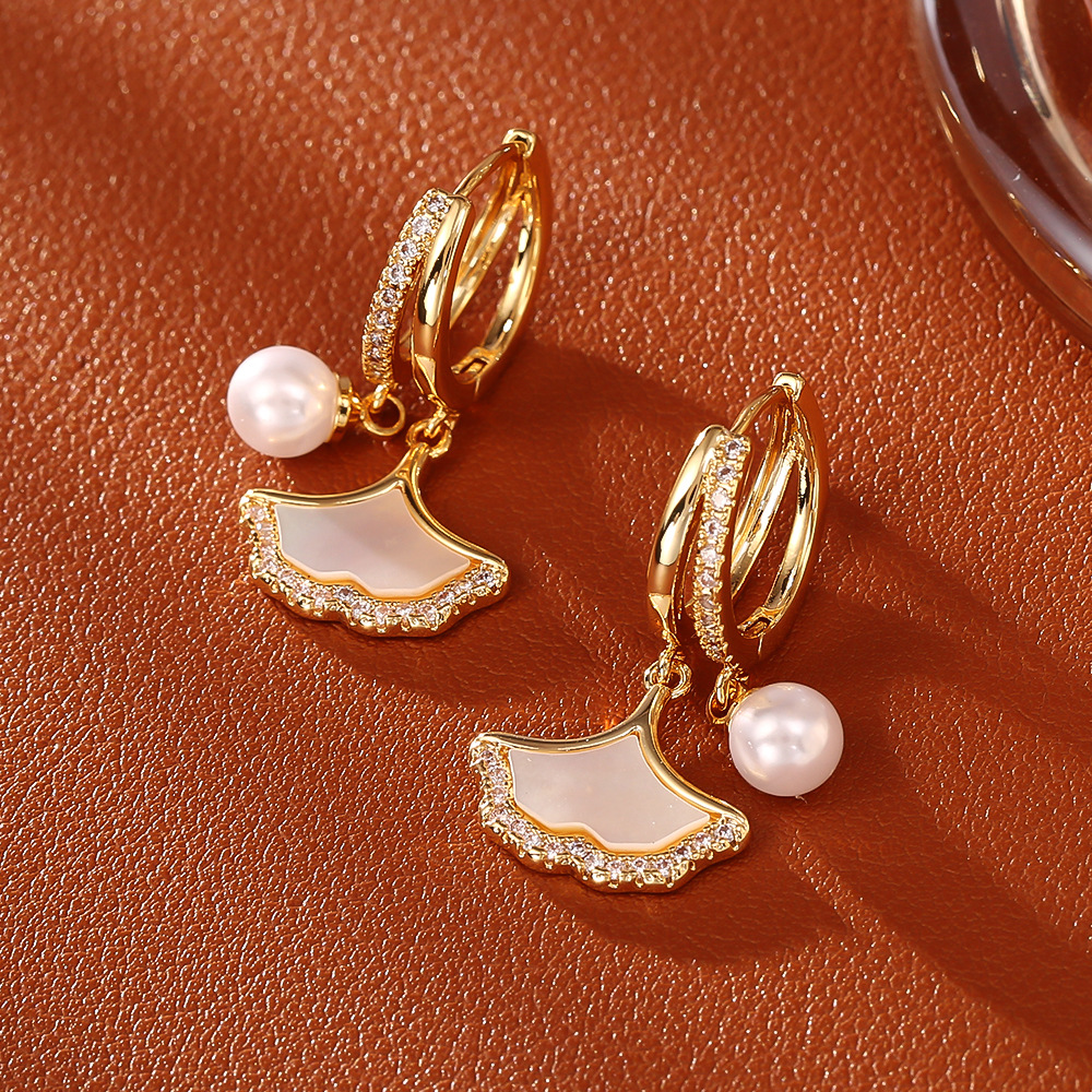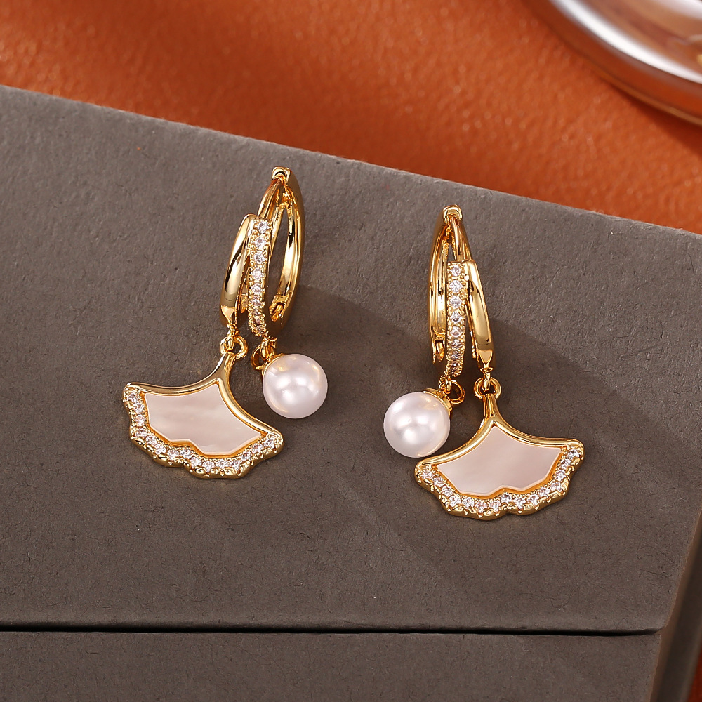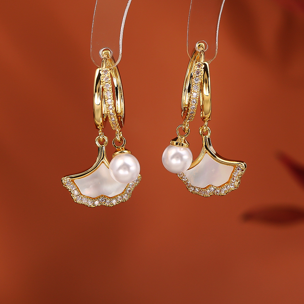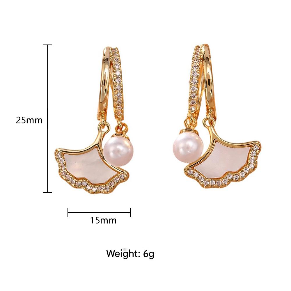 Boucles d'oreilles en laiton zircon cubique pavent, avec perle de plastique, Ginkgo Feuille, Plaqué d'or, bijoux de mode & pavé de micro zircon & pour femme, Vendu par paire