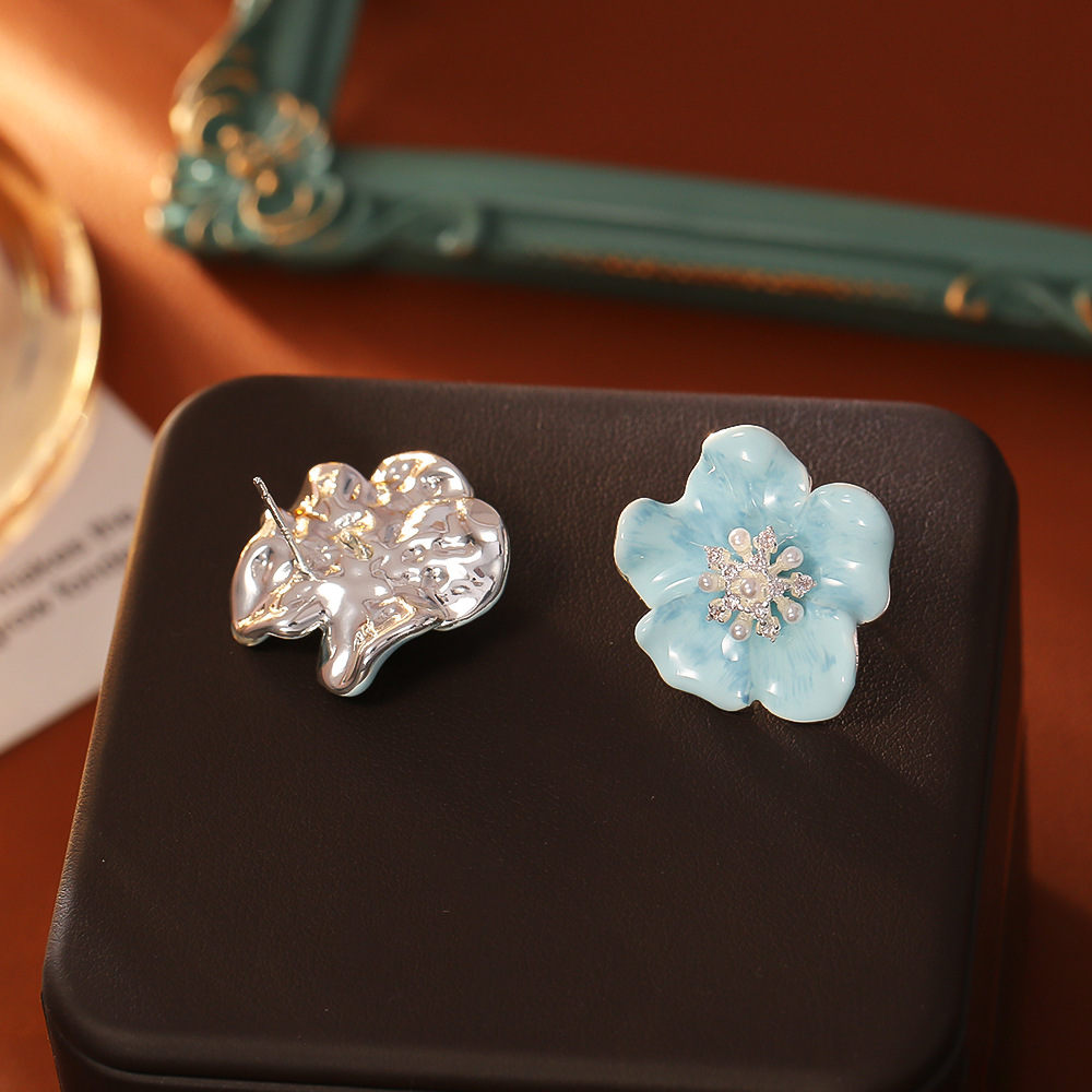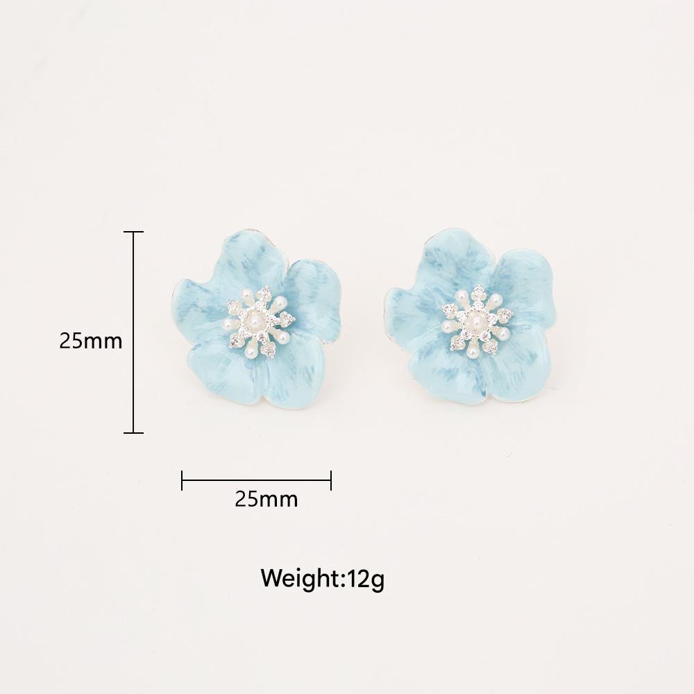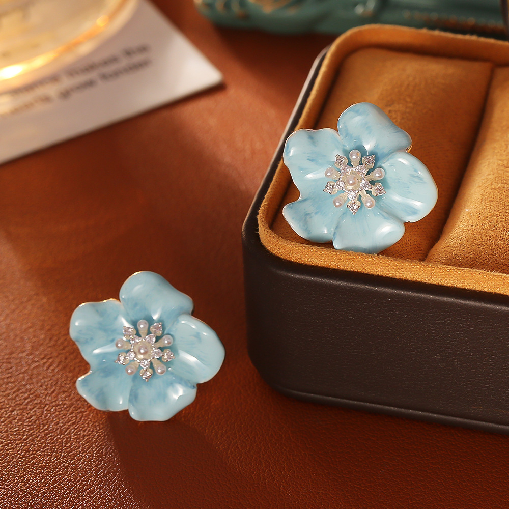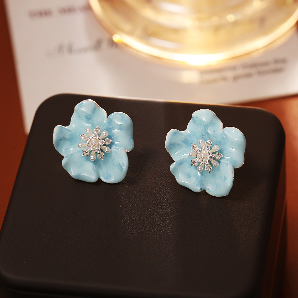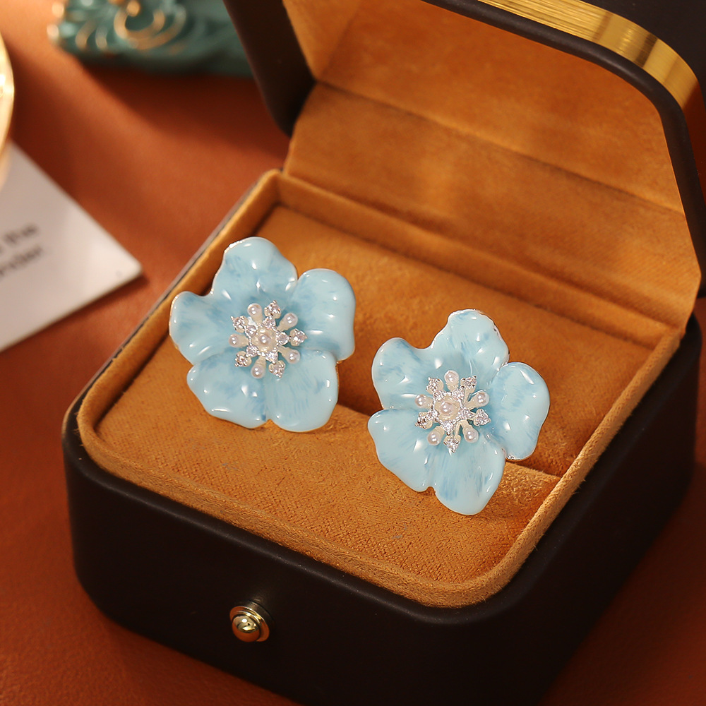 Boucles d'oreilles en laiton zircon cubique pavent, avec perle de plastique, fleur, Placage, pavé de micro zircon & pour femme & émail, bleu, Vendu par paire