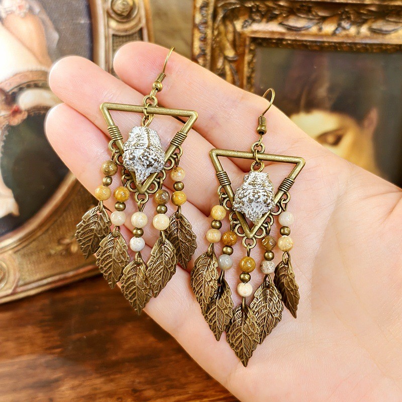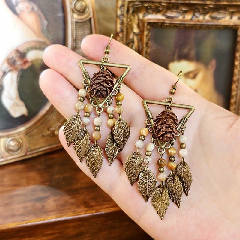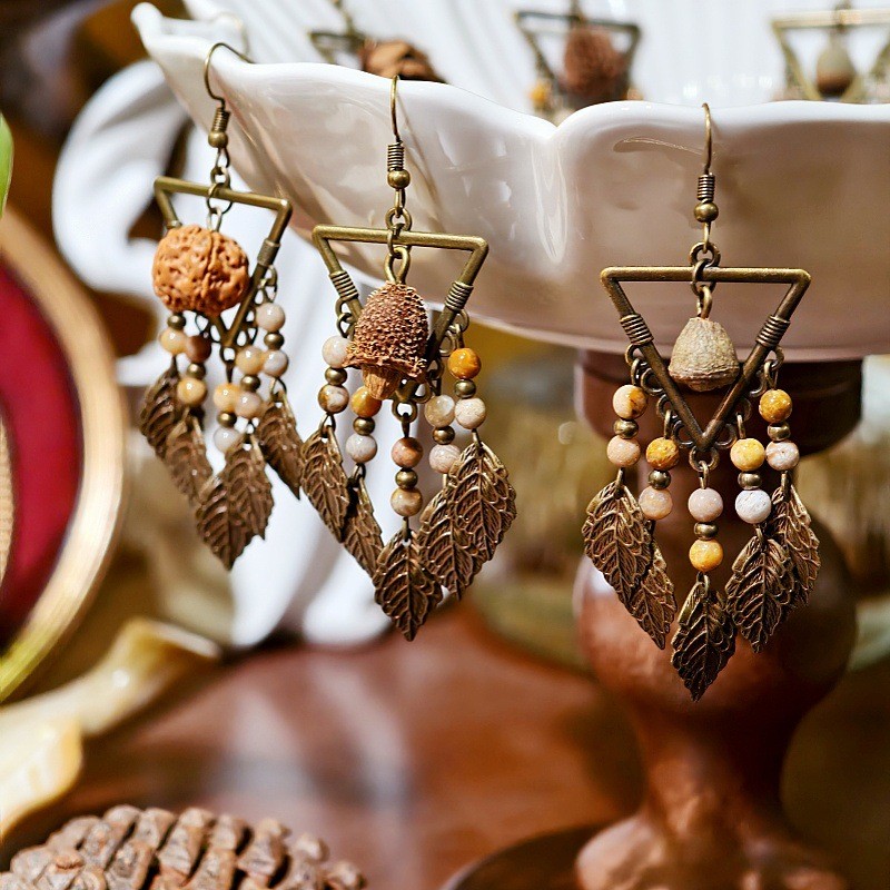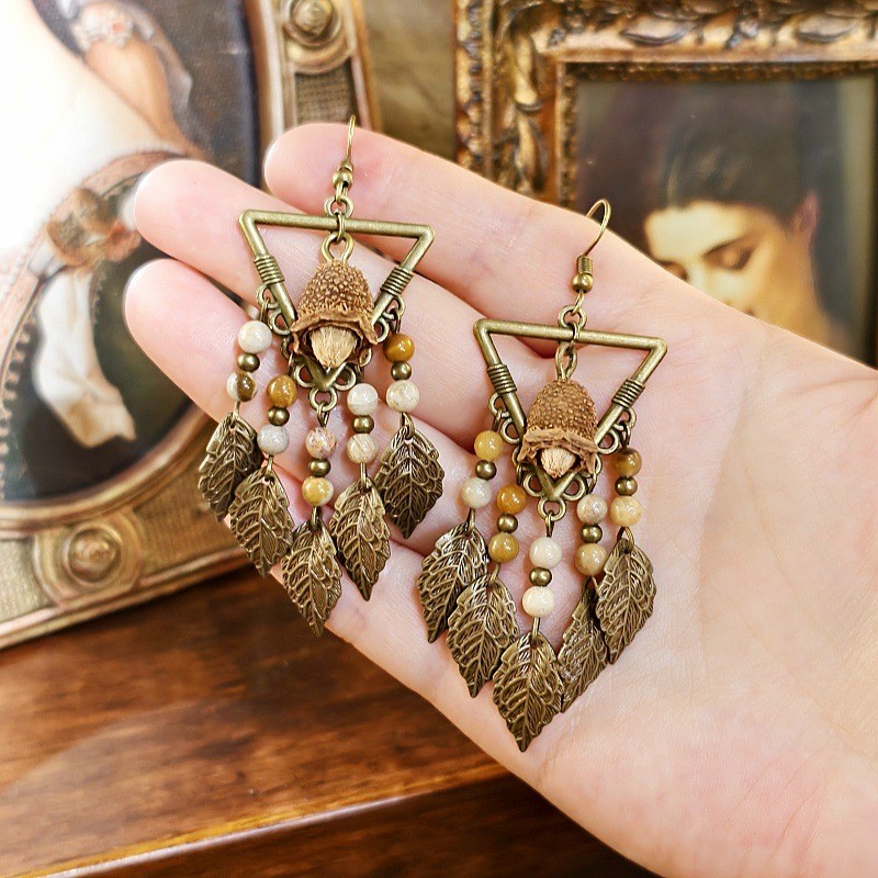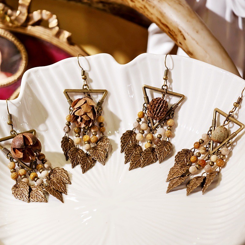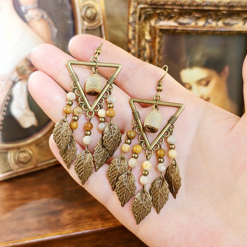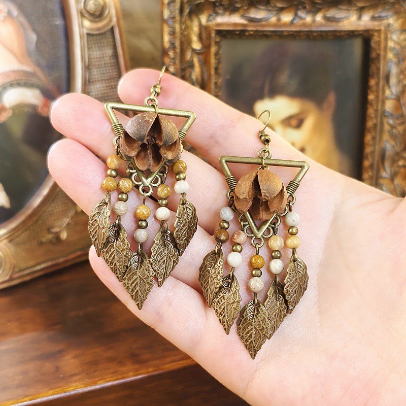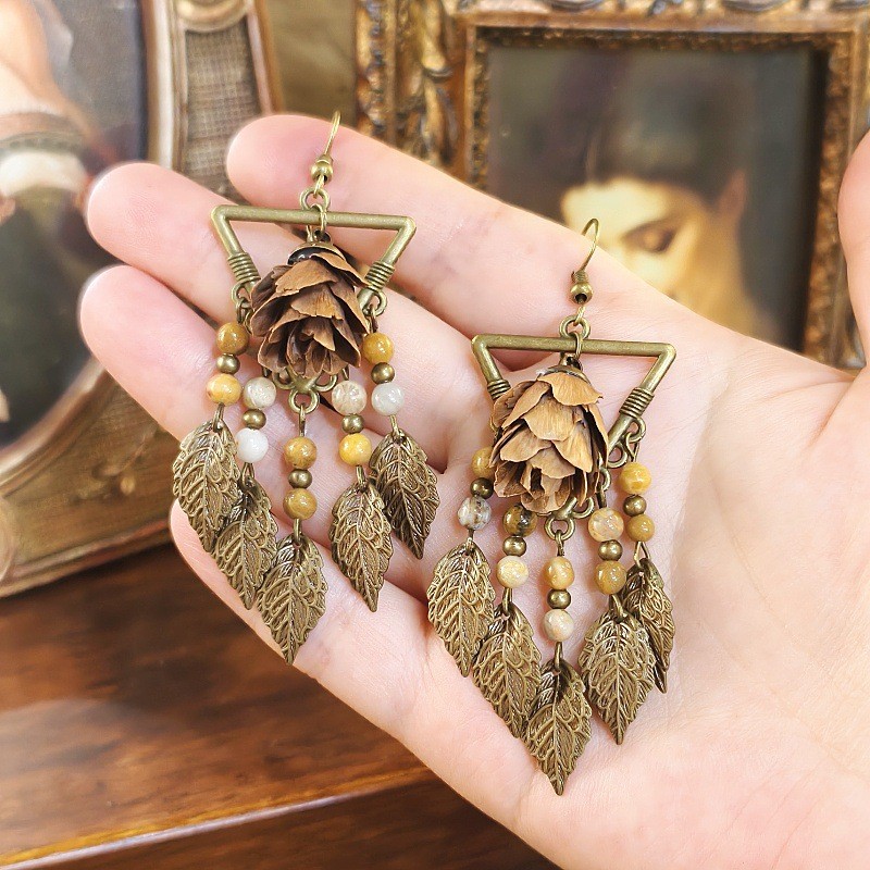 Boucles d'oreilles pendantes en laiton, avec Gemme synthétique & bois, fait à la main, bijoux de mode & pour femme, Longueur Environ 9 cm, Vendu par PC