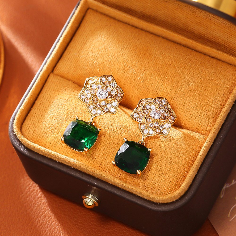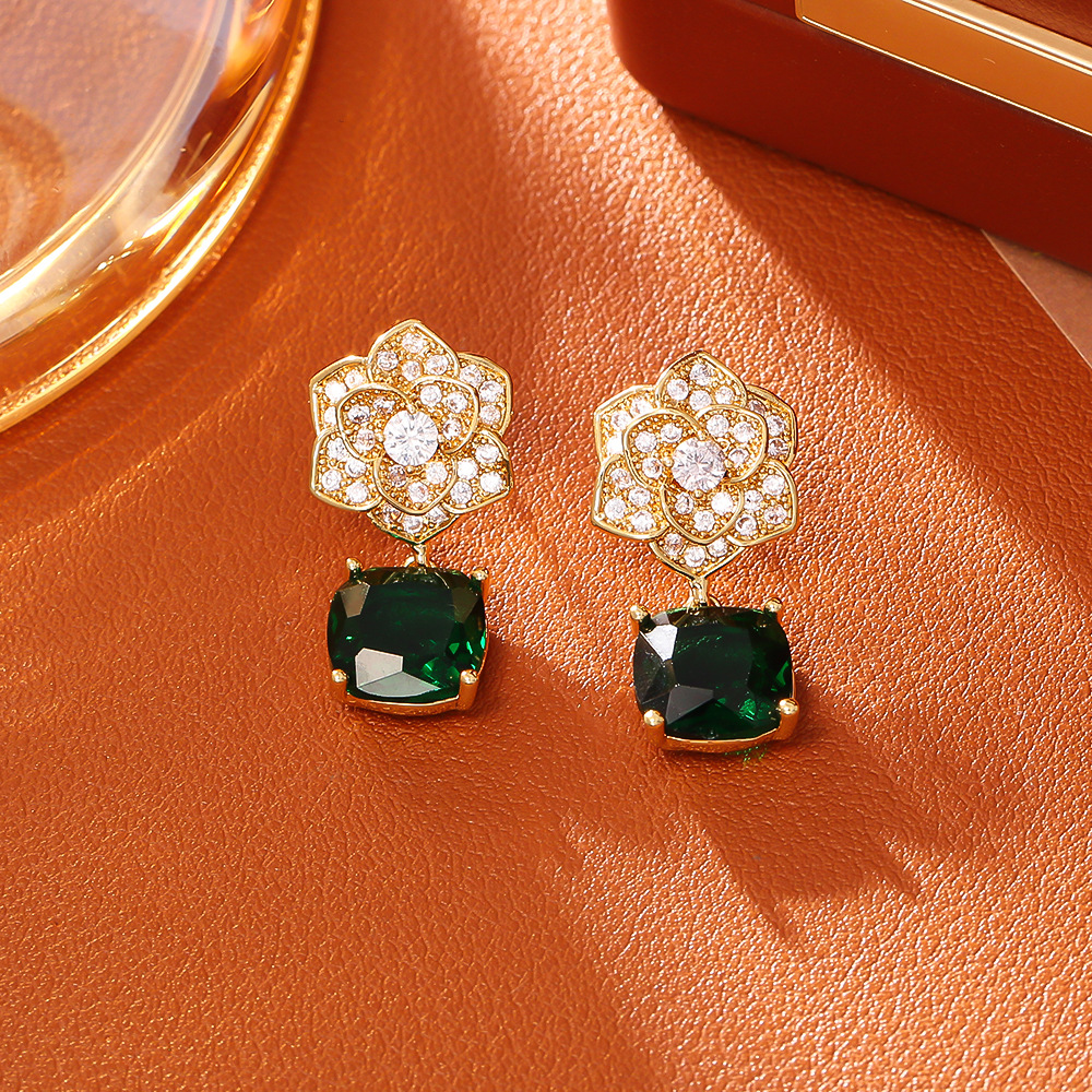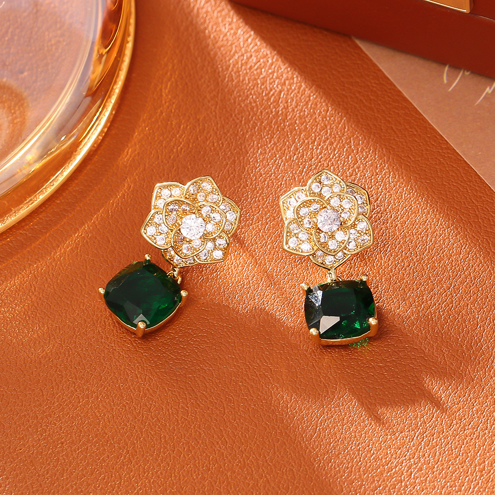 Boucles d'oreilles pendantes en laiton, avec zircon cubique, fleur, Plaqué d'or, bijoux de mode & pour femme & avec strass, Vendu par paire