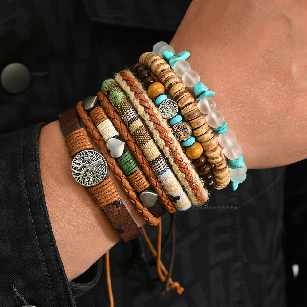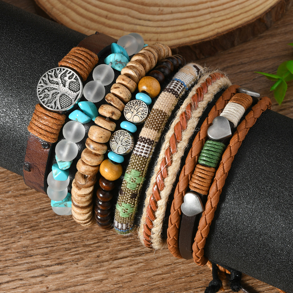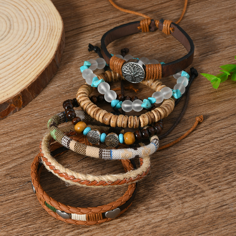 Bracelet châle , alliage de zinc, avec turquoise & cuir PU & bois, fait à la main, 7 pièces & bijoux de mode & unisexe, Inner diameter :5.5-6.5cm., Vendu par fixé