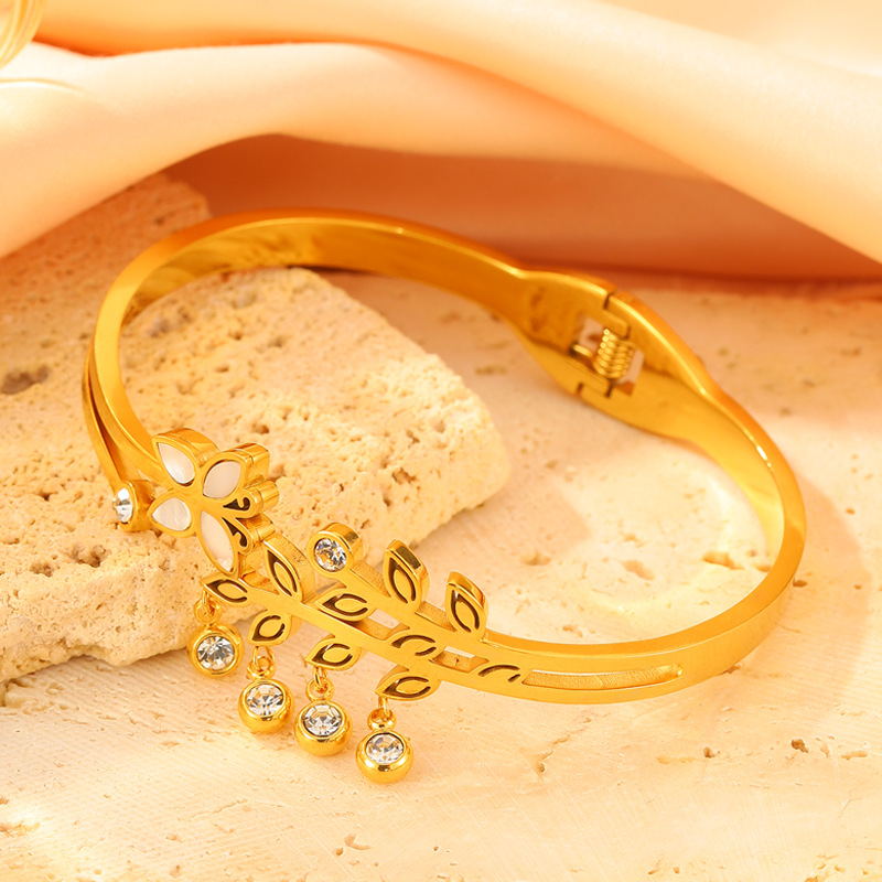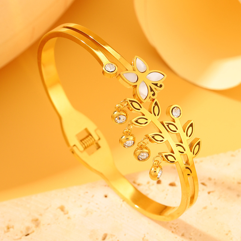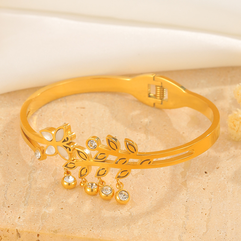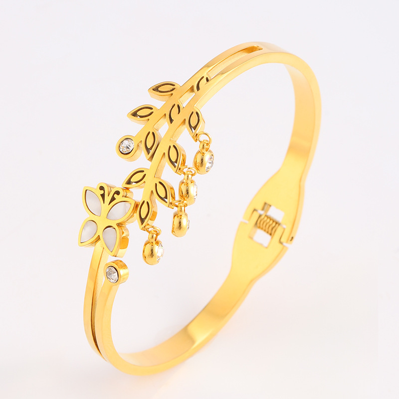 Bracelet en acier inoxydable, Acier inoxydable 304, avec coquille blanche, Placage, pour femme & avec strass & creux, doré, Vendu par PC