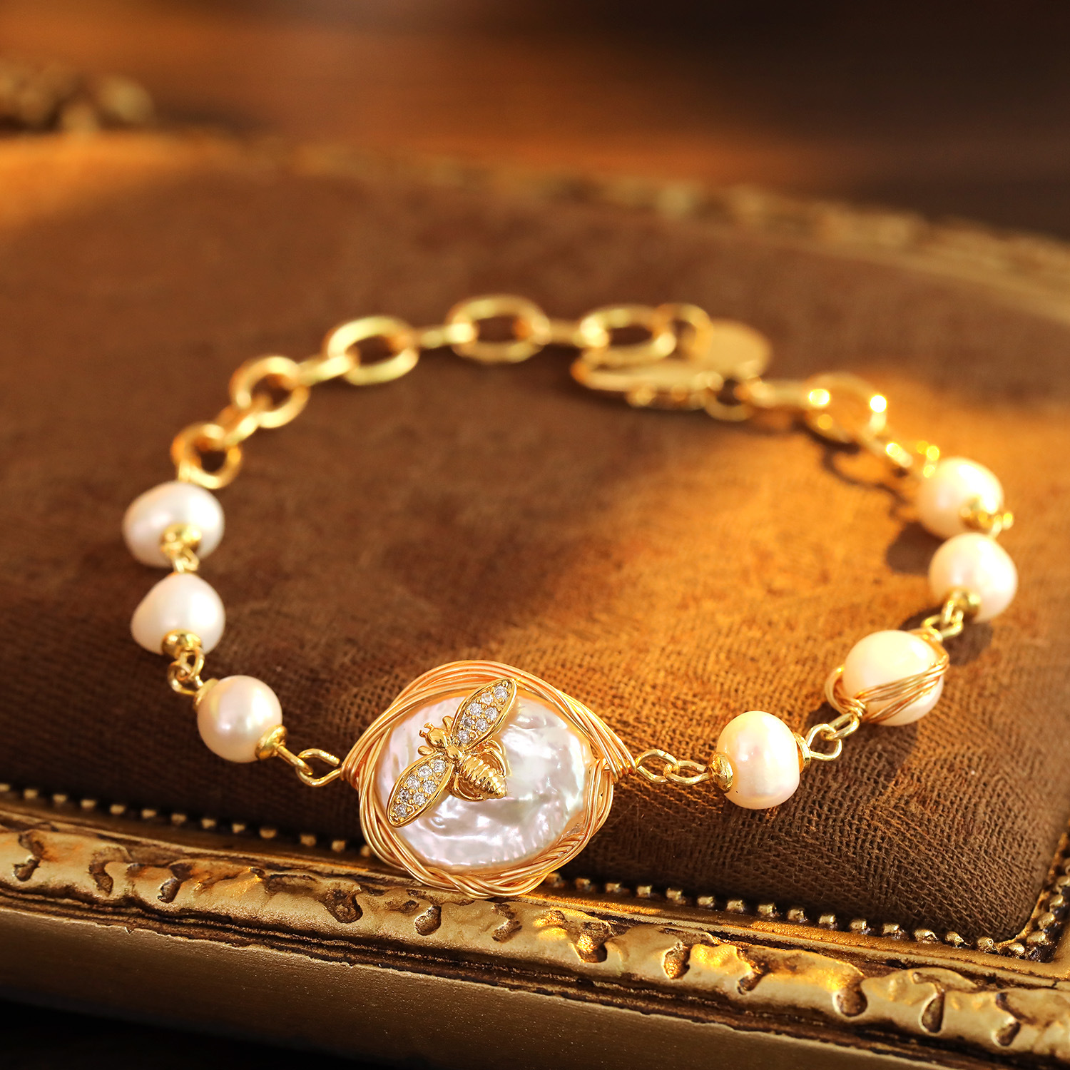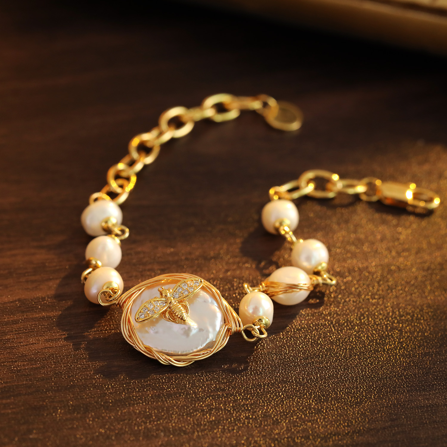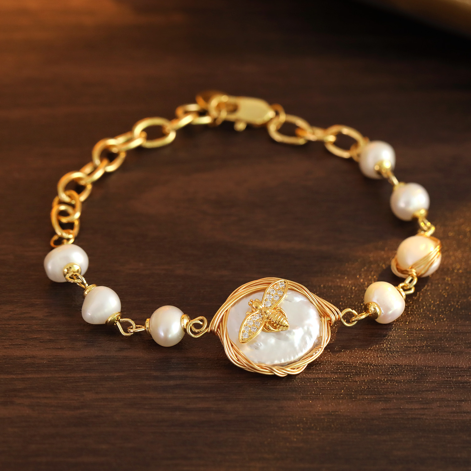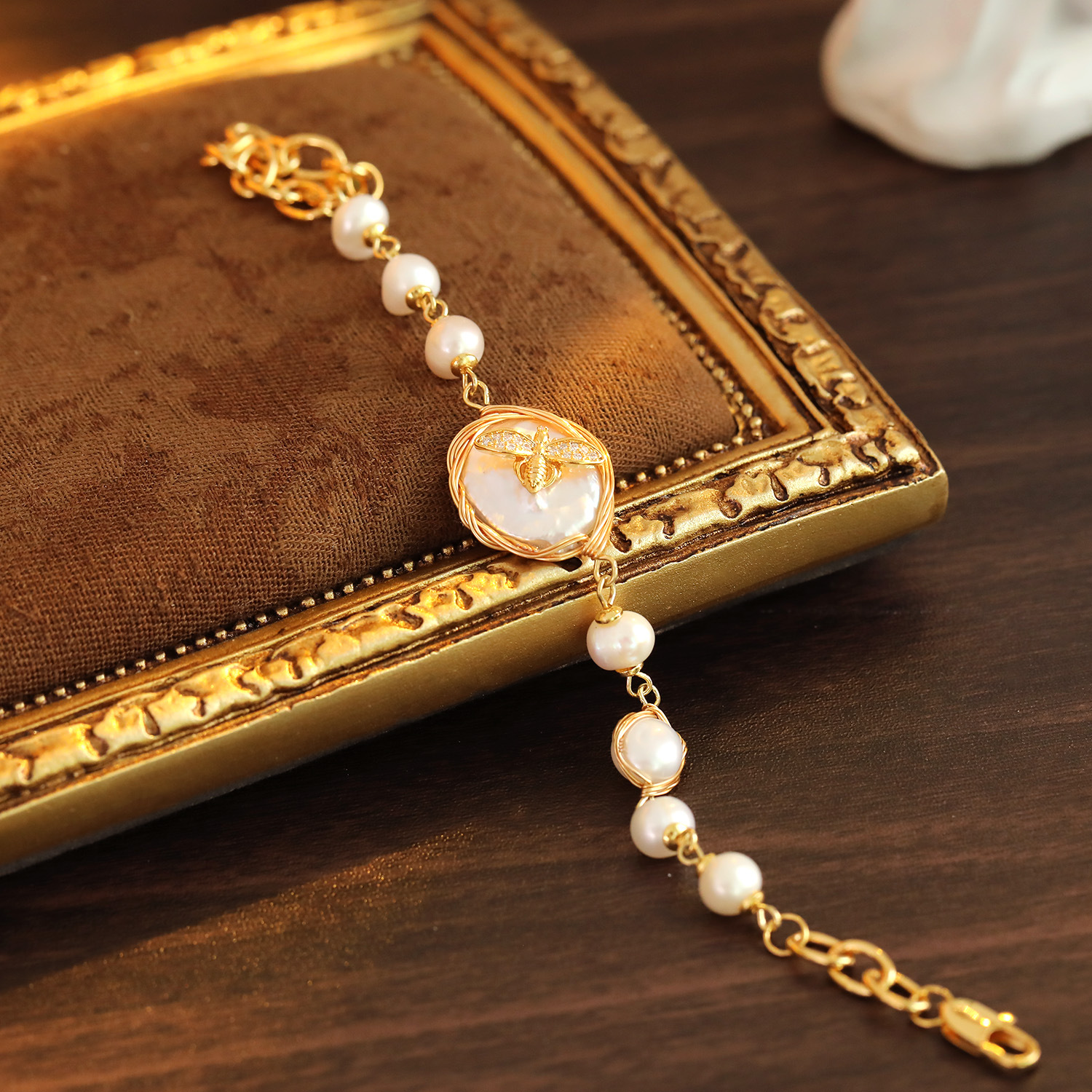 Bracelet en perles de culture d'eau douce, laiton, avec perle d'eau douce cultivée, avec 5cm chaînes de rallonge, abeille, Plaqué or 18K, bijoux de mode & pavé de micro zircon & pour femme, Pearl 5-6mm; The pendant is 1.9cm long and 1.7cm wide, Longueur 15.5 cm, Vendu par PC