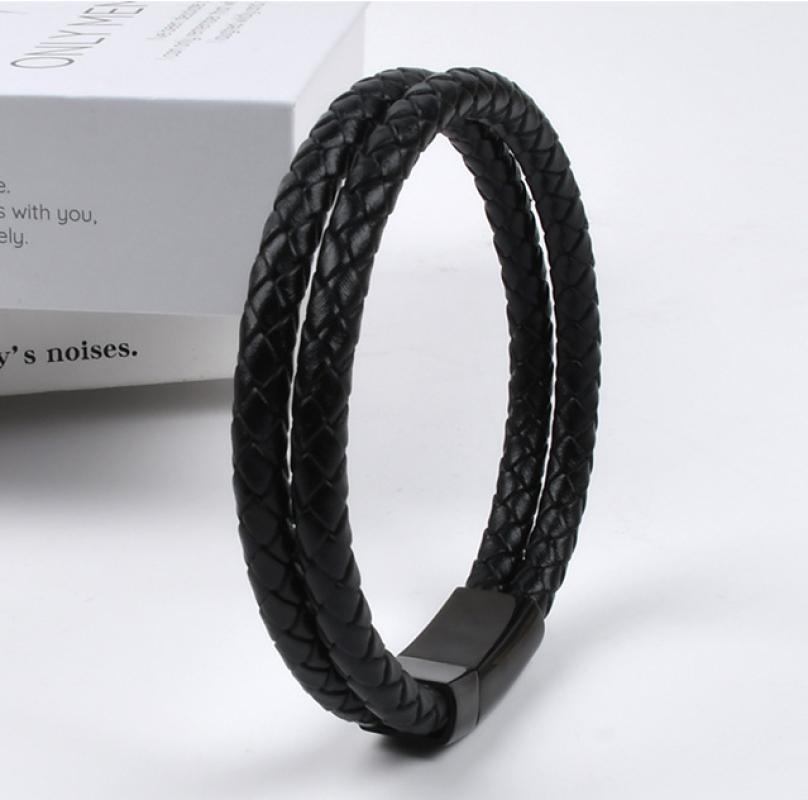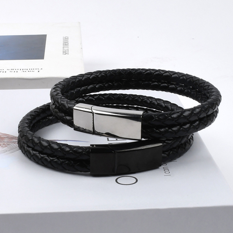 Bracelets cordon PU, Acier inoxydable 304, avec cuir PU, trois couches & longueur différente pour le choix & pour homme, noire, Vendu par PC