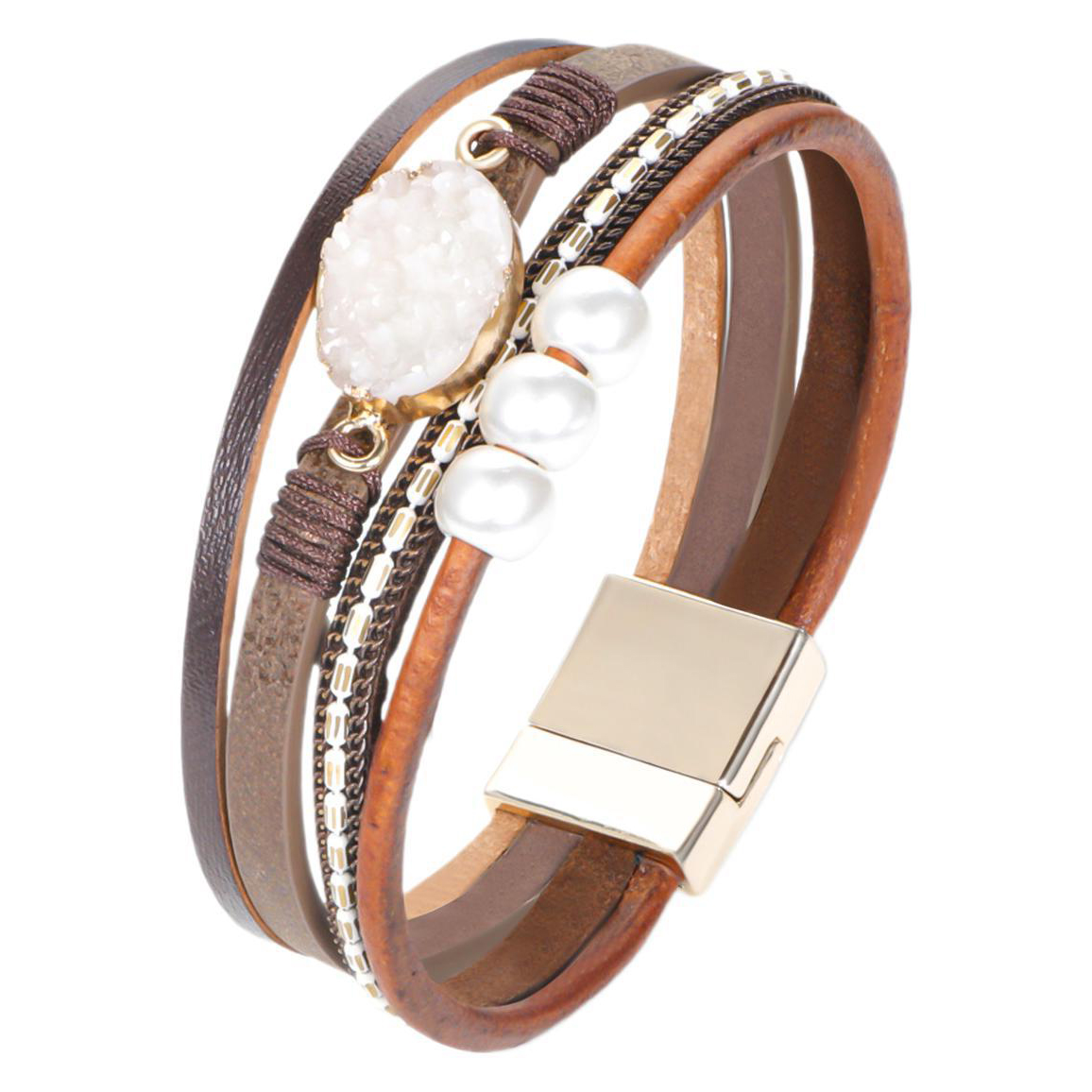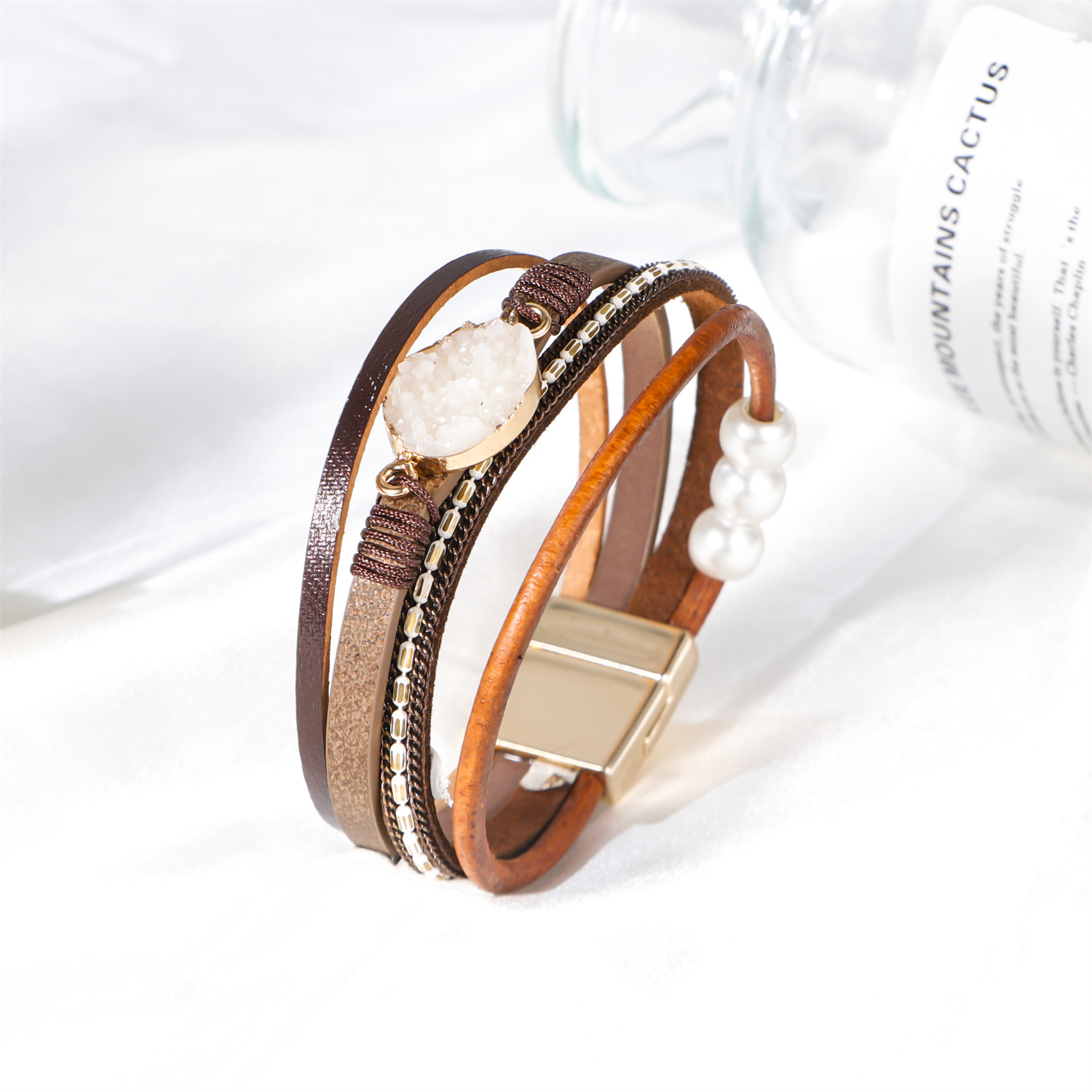 Bracelets cordon PU, cuir PU, avec quartz rose & perle de plastique & alliage de zinc, bijoux de mode & multicouche & pour femme, couleur de café, Longueur 19 cm, Vendu par PC