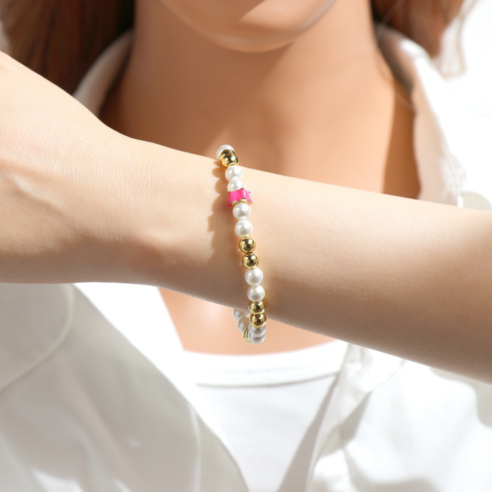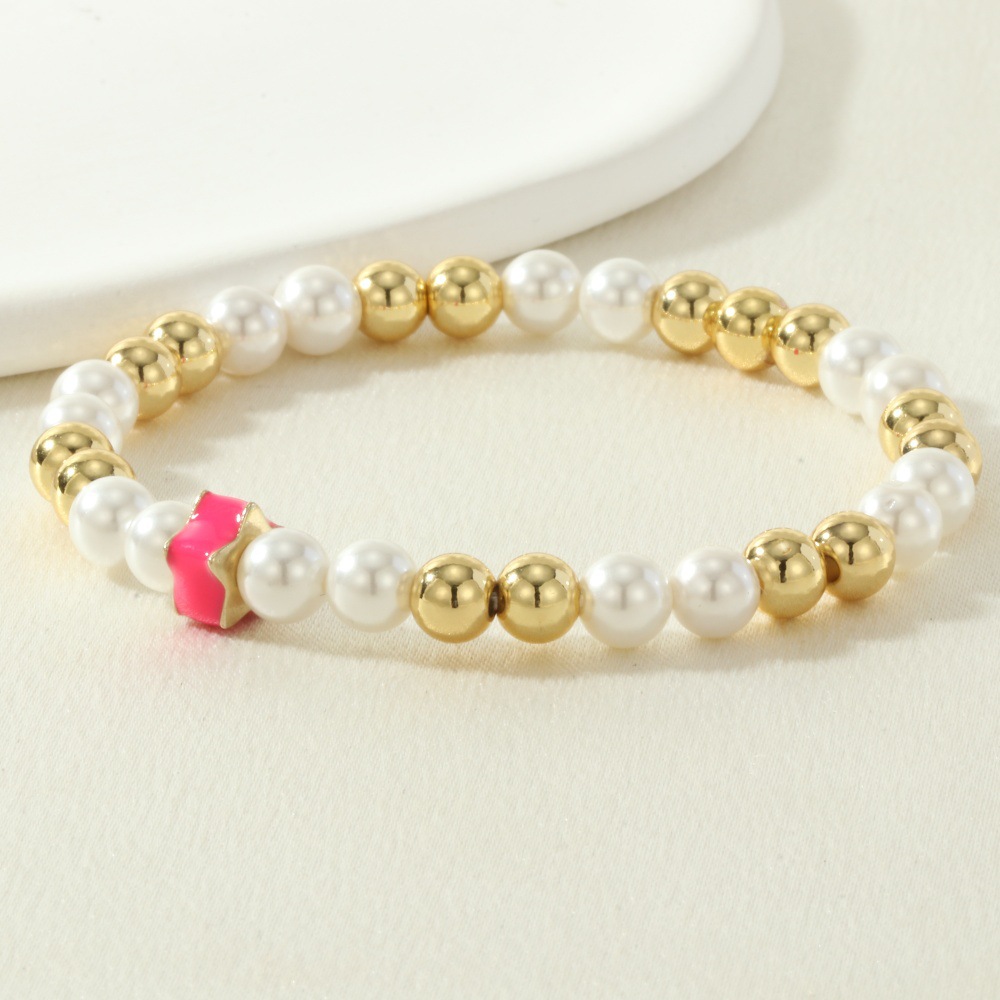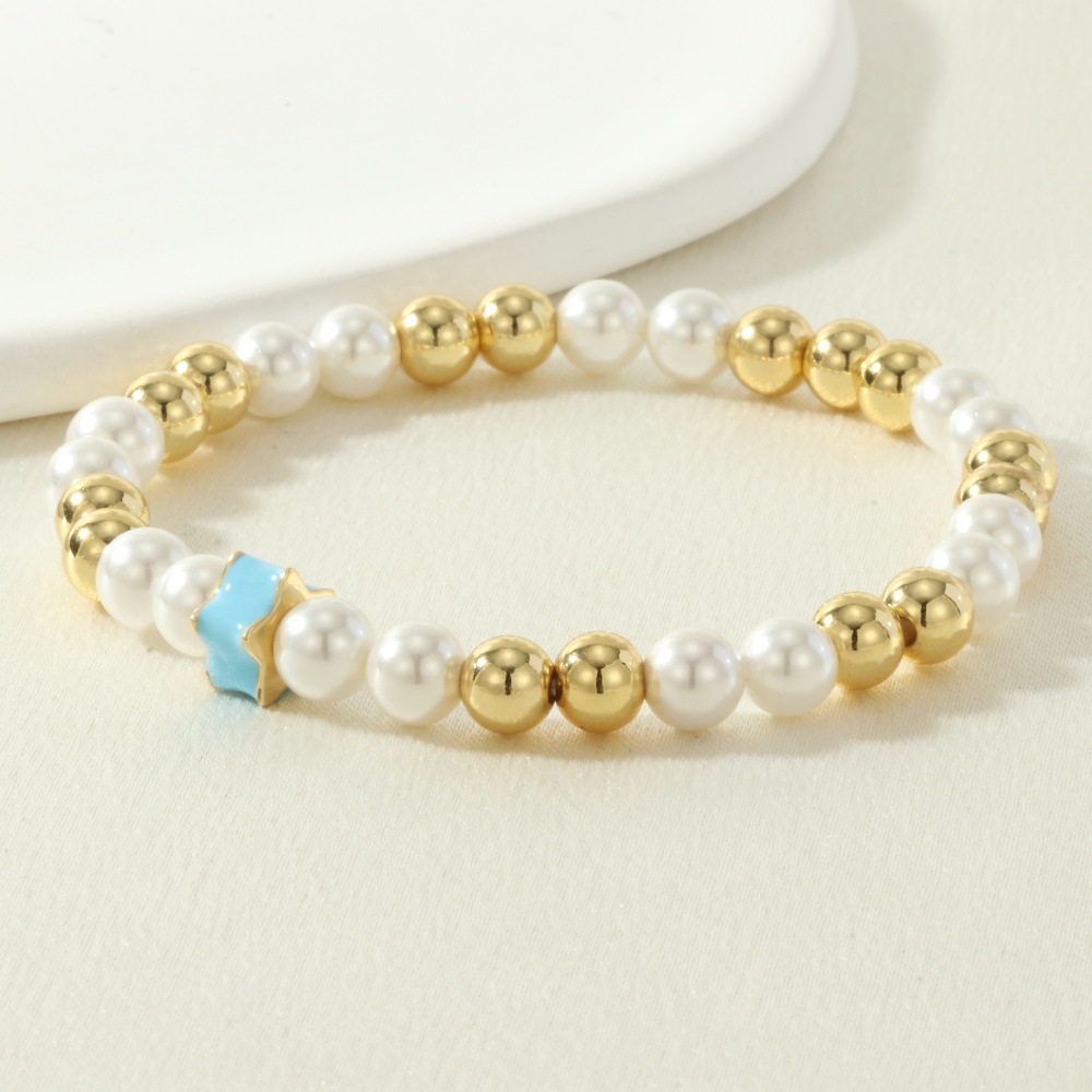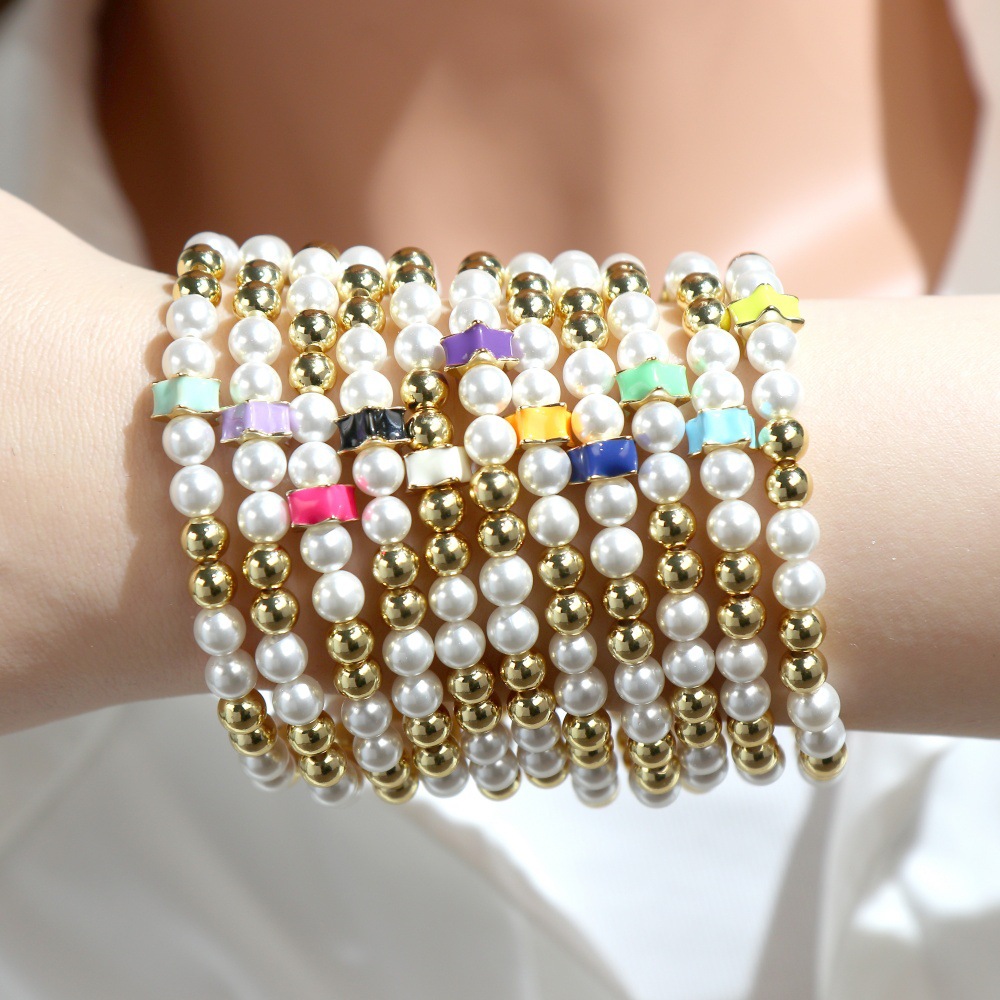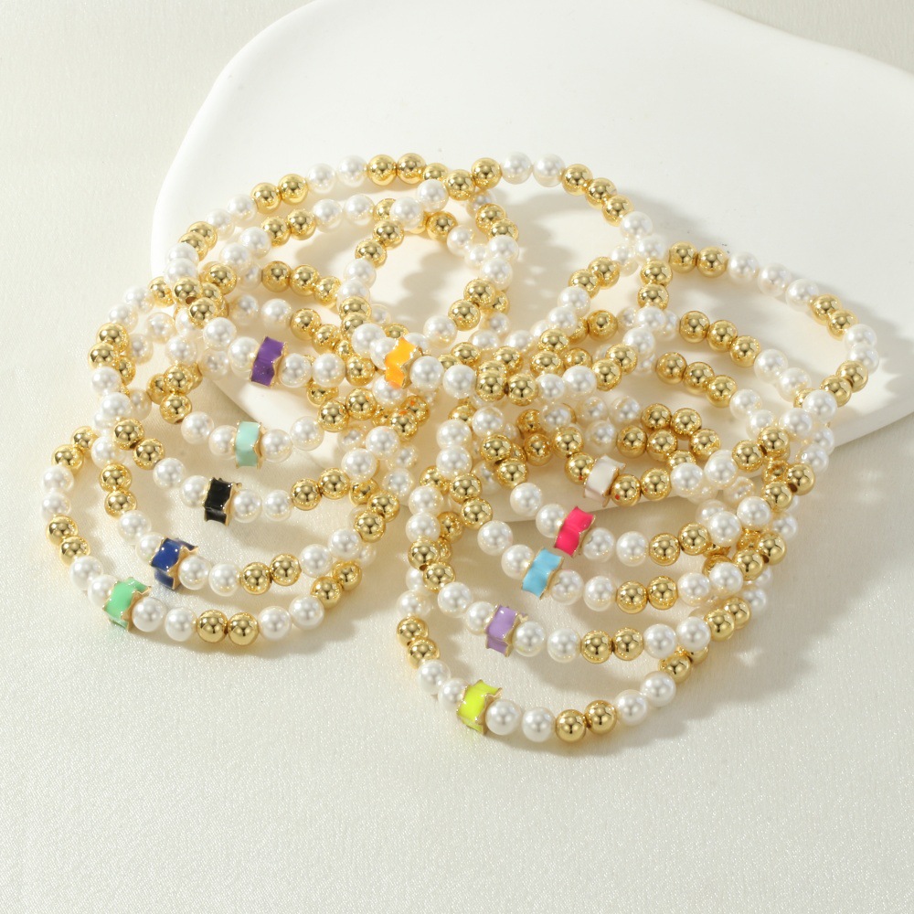 Bracelets en laiton, avec Shell Pearl & fil élastique, Placage de couleur d'or, pour femme & émail, plus de couleurs à choisir, protéger l'environnement, sans nickel, plomb et cadmium, Longueur 16-17 cm, Vendu par PC