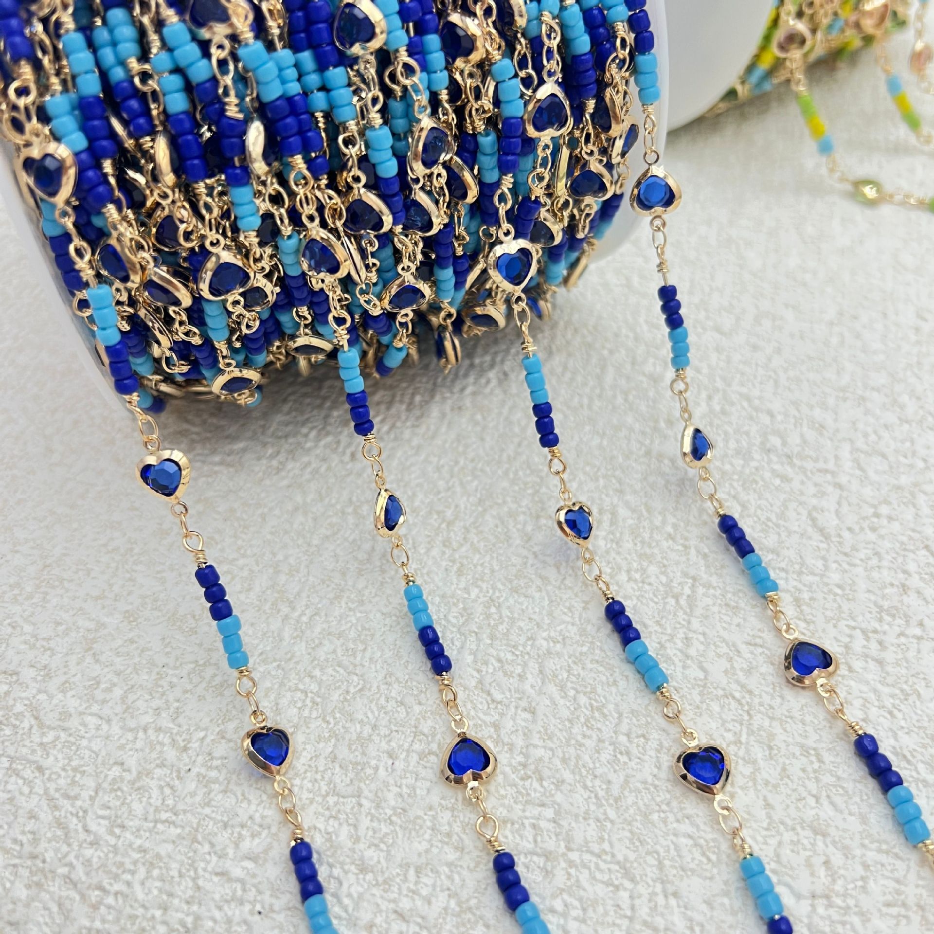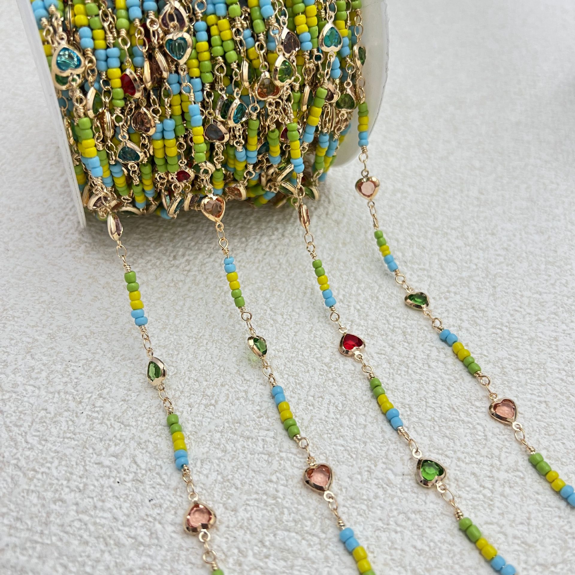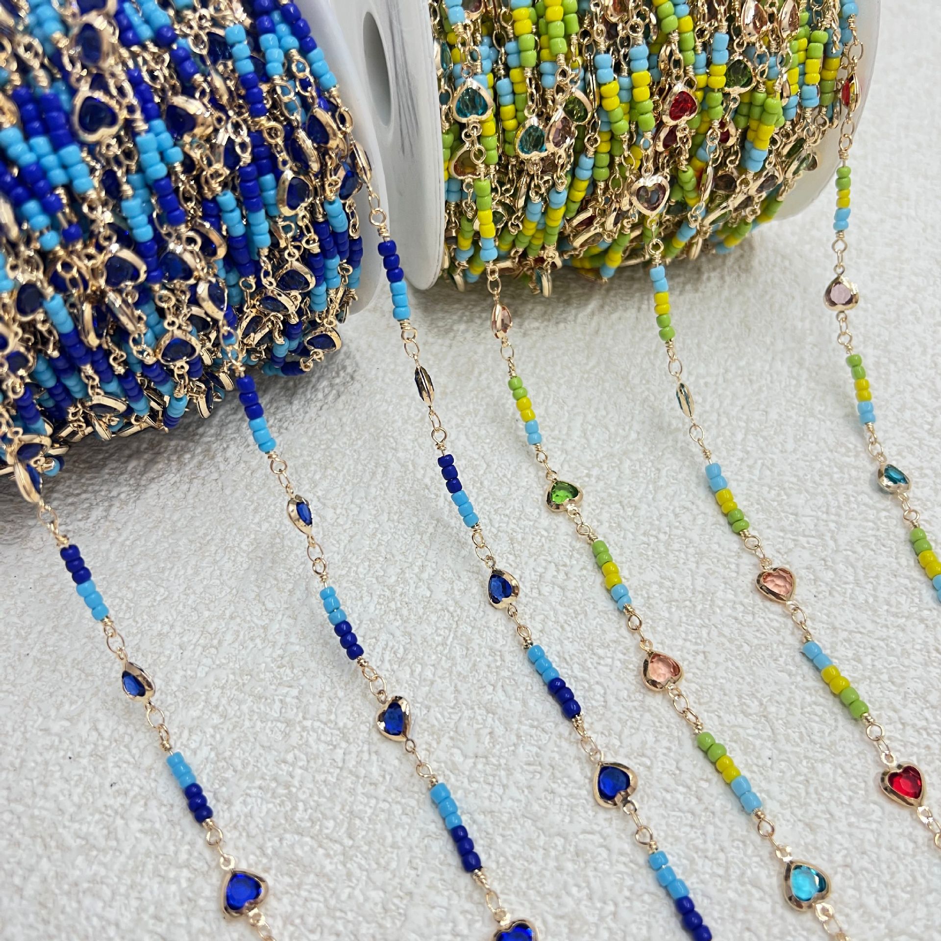 Chaîne collier en laiton, avec Seedbead & verre, coeur, Placage de couleur d'or, DIY, plus de couleurs à choisir, protéger l'environnement, sans nickel, plomb et cadmium, Longueur 1 m, Vendu par m