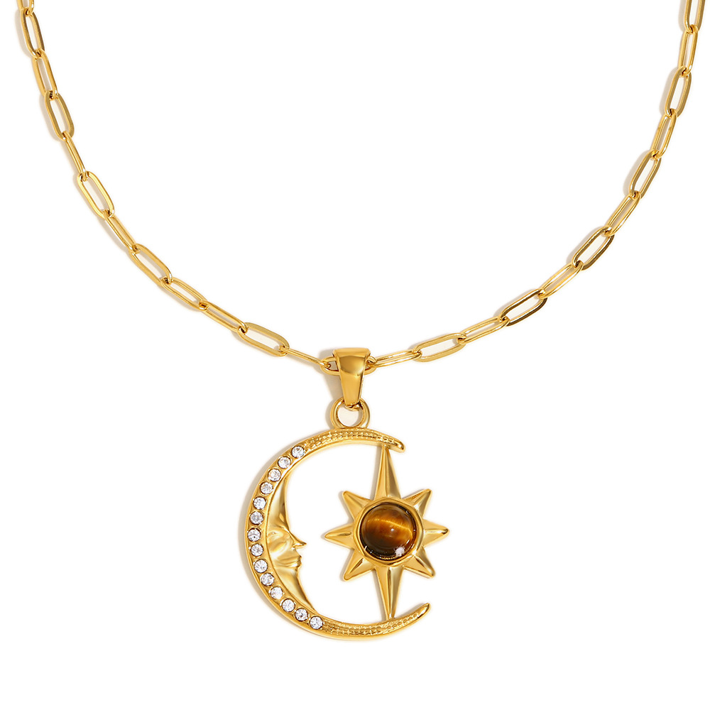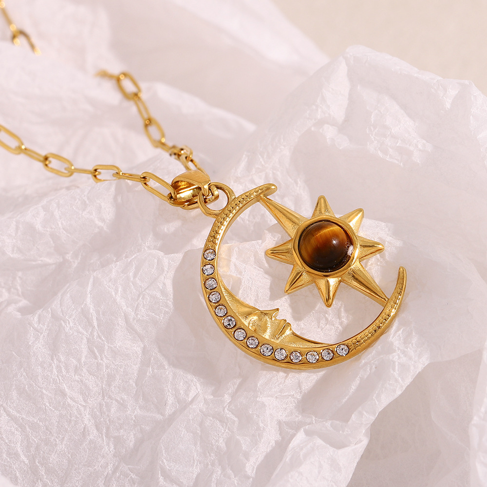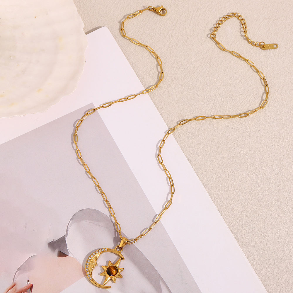 Collier bijoux de pierre gemme, Acier inoxydable 304, avec oeil de tigre, Lune et Etoile, Plaqué or 18K, pour femme & avec strass & creux, Vendu par PC