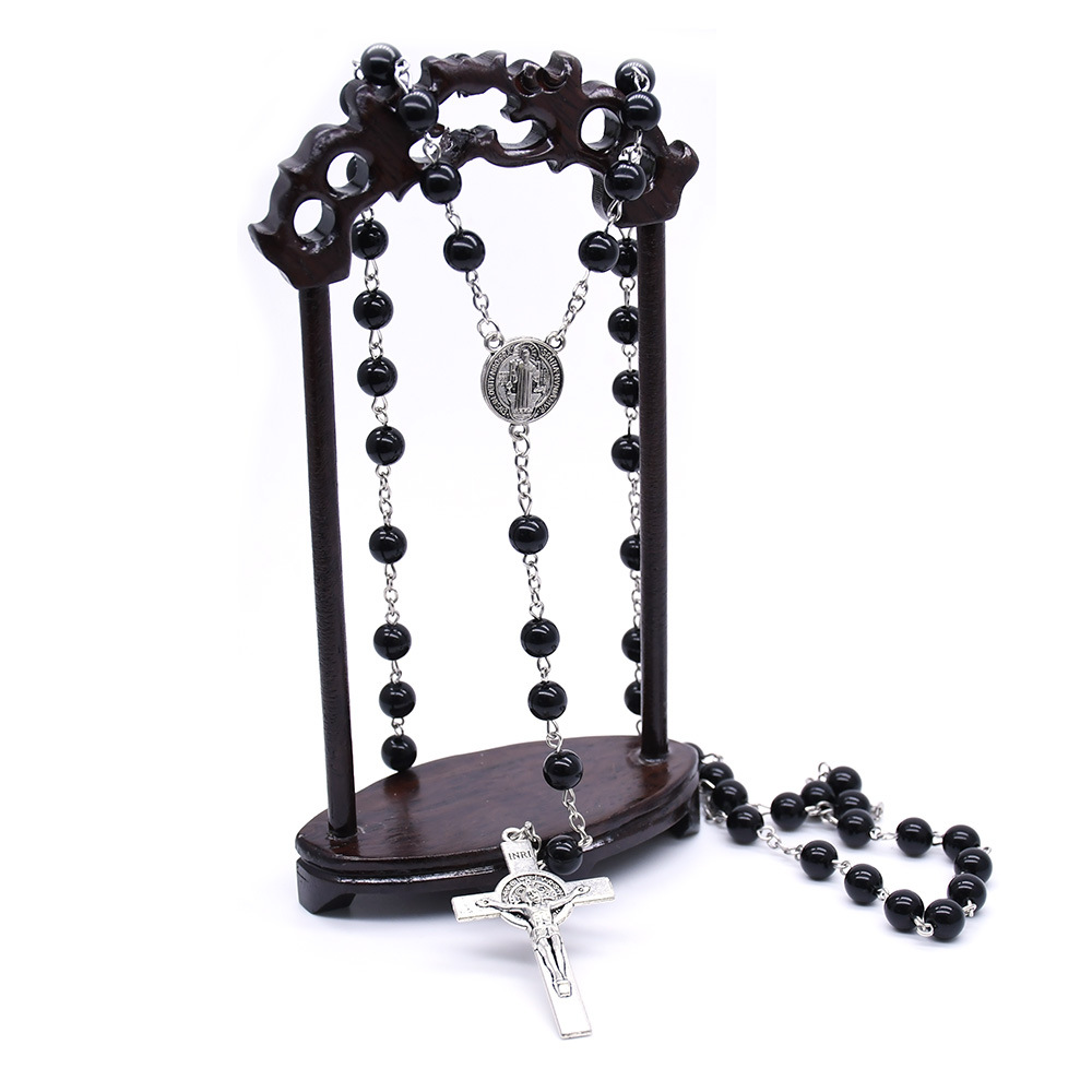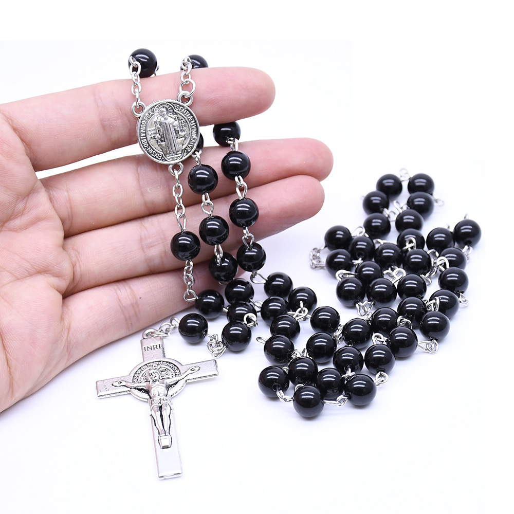 Collier de chapelet, alliage de zinc, avec Acrylique, croix, bijoux de mode, couleurs mélangées, 8mm, Longueur 58 cm, Vendu par PC