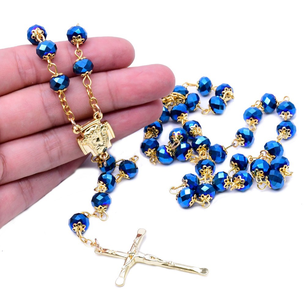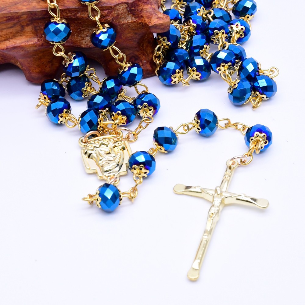 Collier de chapelet, alliage de zinc, avec cristal, croix, Placage de couleur d'or, bijoux de mode, couleurs mélangées, 6x8mm, Longueur 58 cm, Vendu par PC