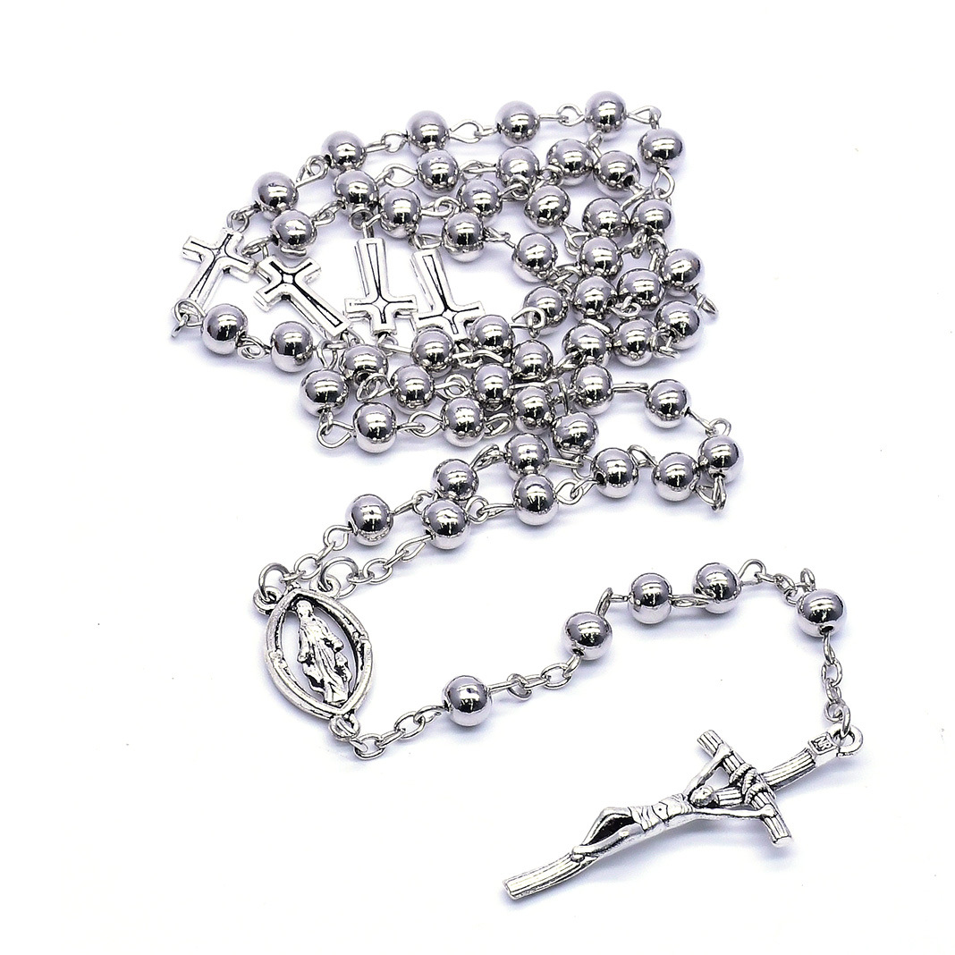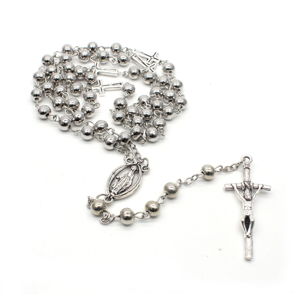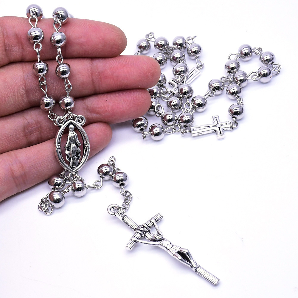 Collier de chapelet, alliage de zinc, croix, Placage de couleur argentée, bijoux de mode, argent, 6mm, Longueur 51.5 cm, Vendu par PC