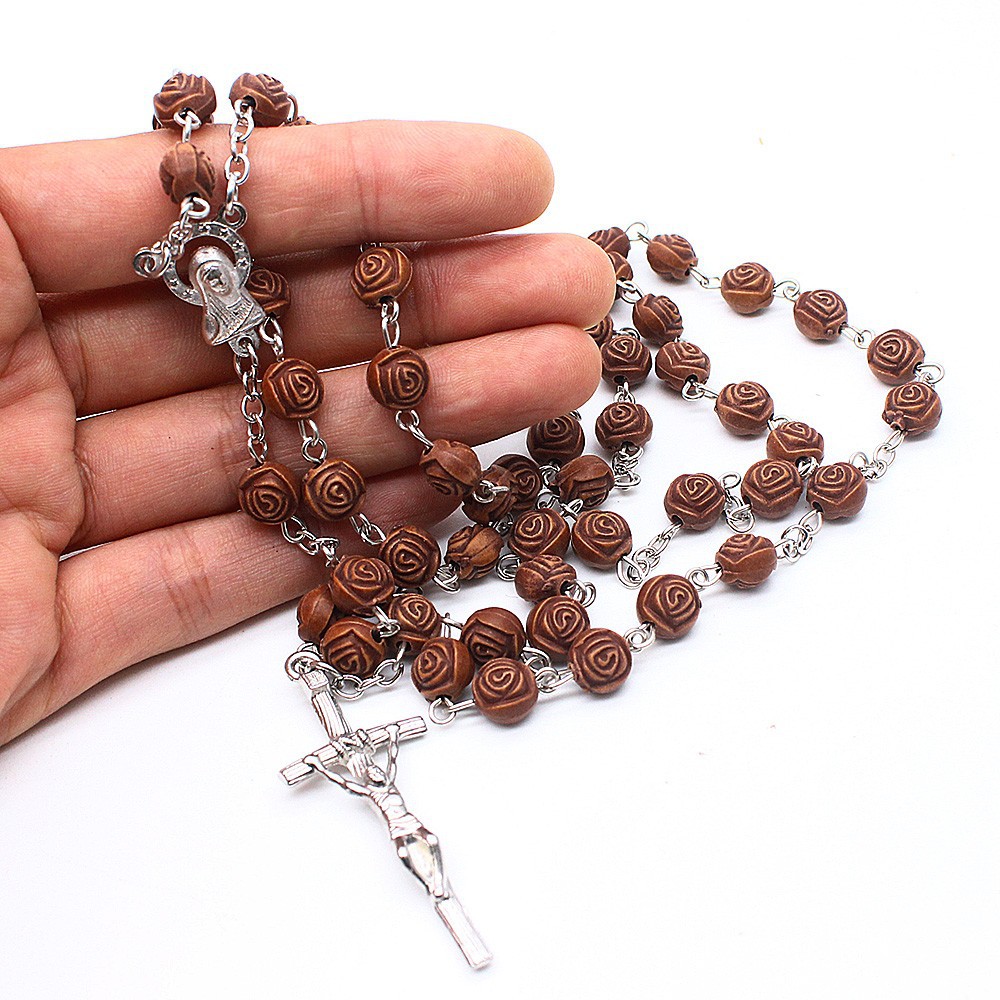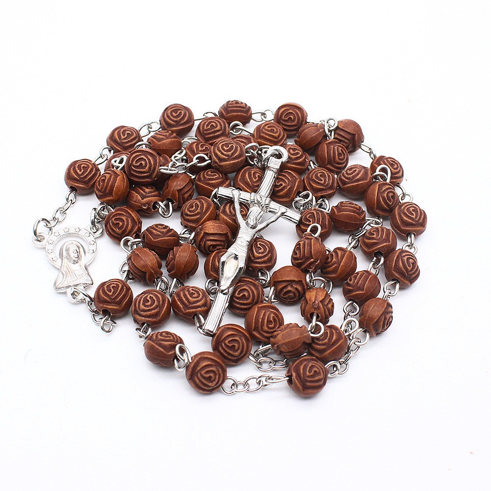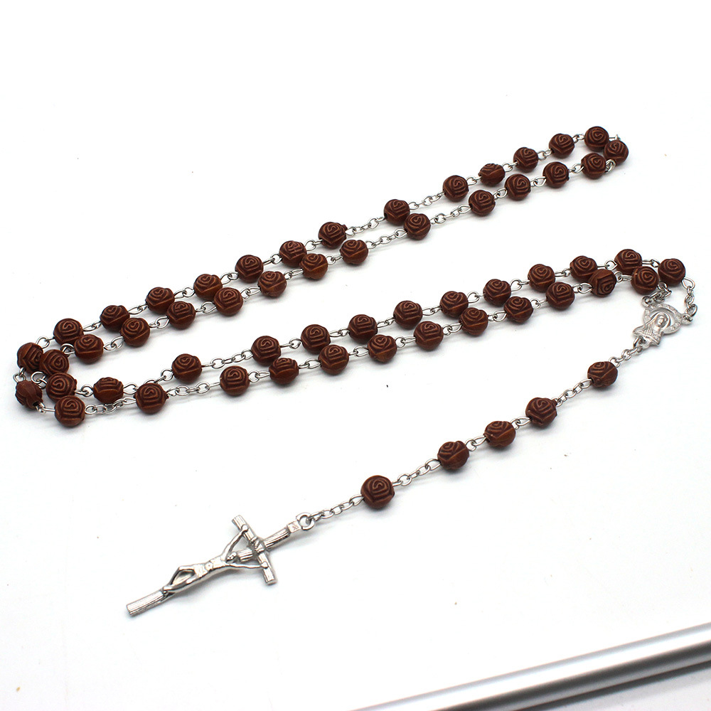 Collier de chapelet, alliage de zinc, avec bois, croix, Placage, bijoux de mode, couleurs mélangées, 8mm, Longueur 52 cm, Vendu par PC
