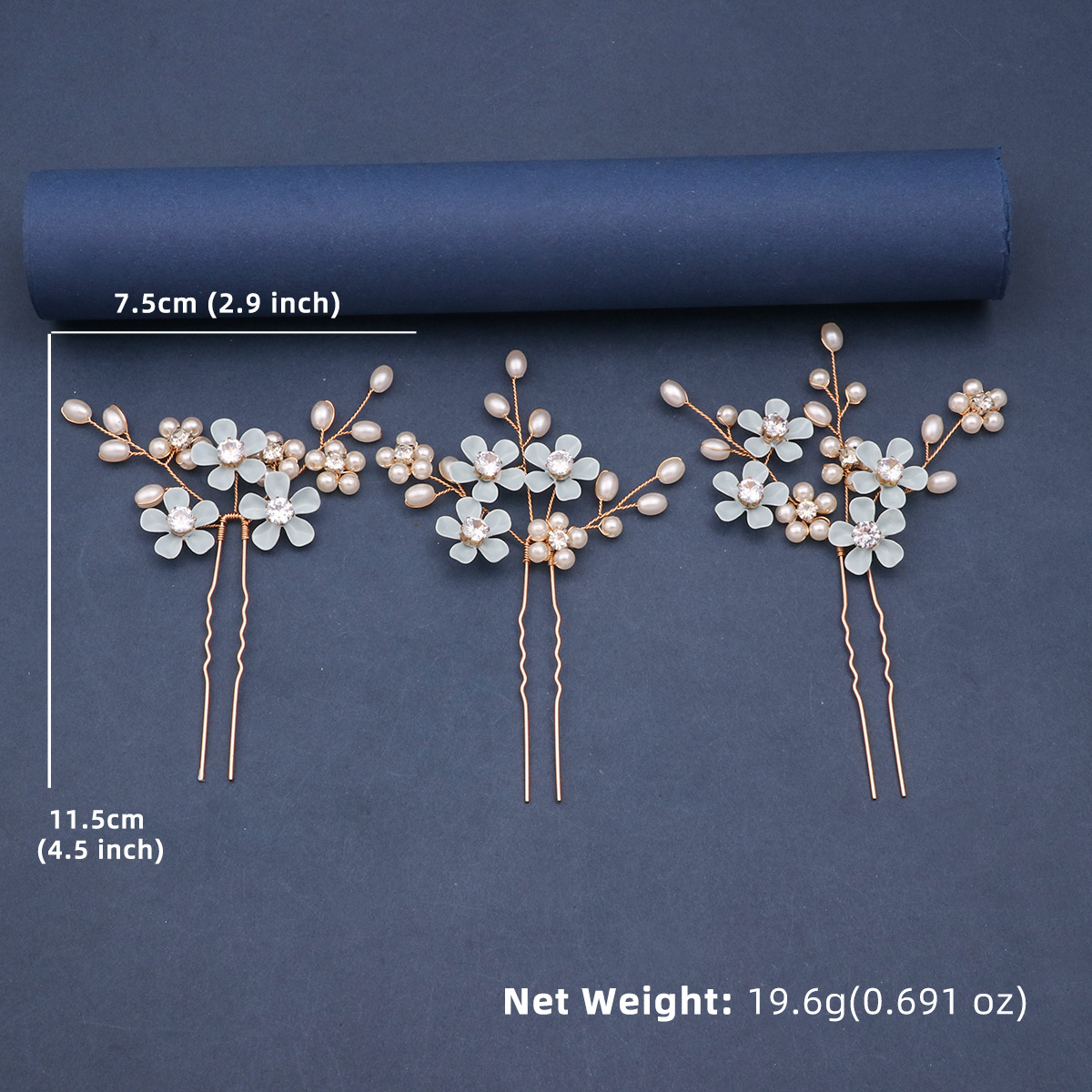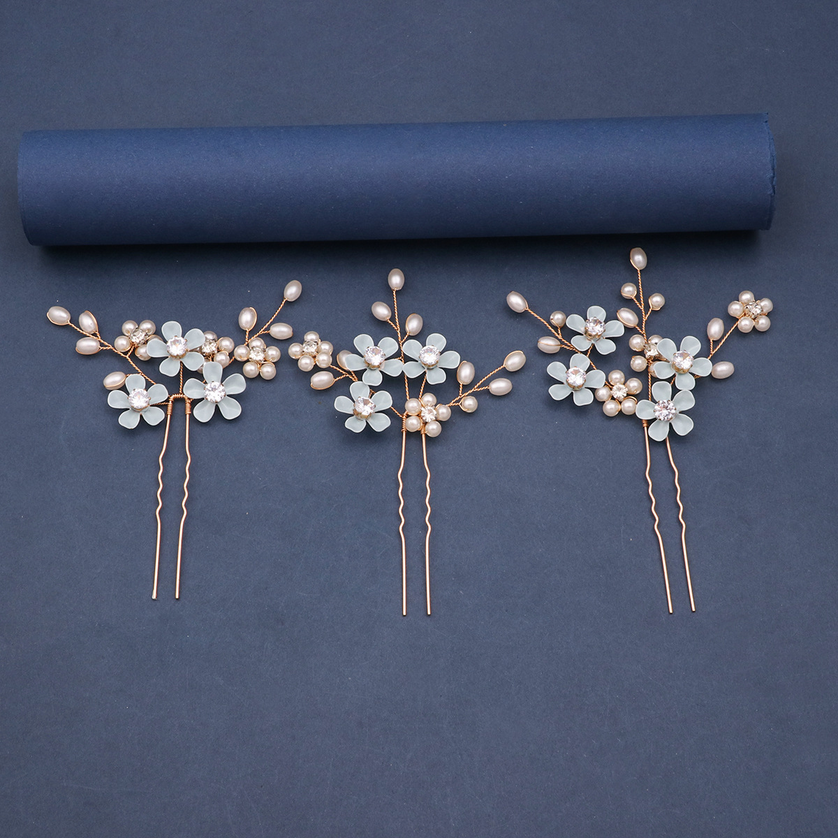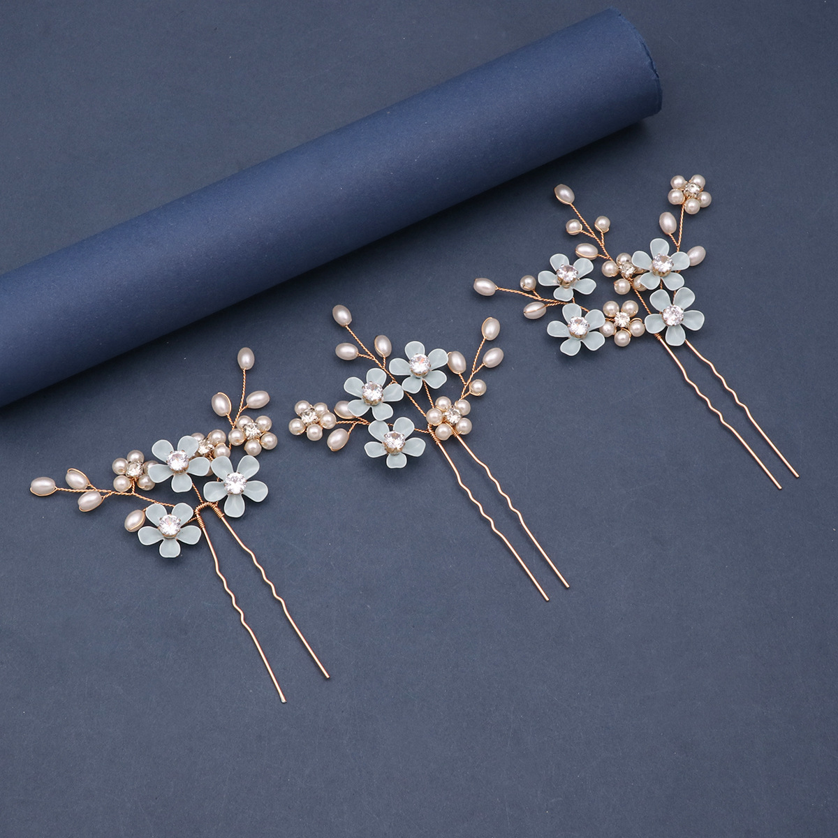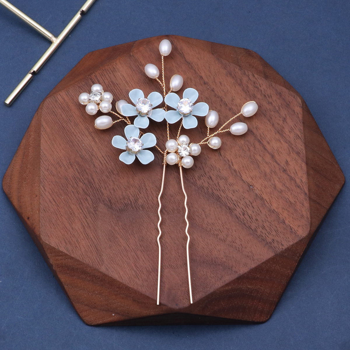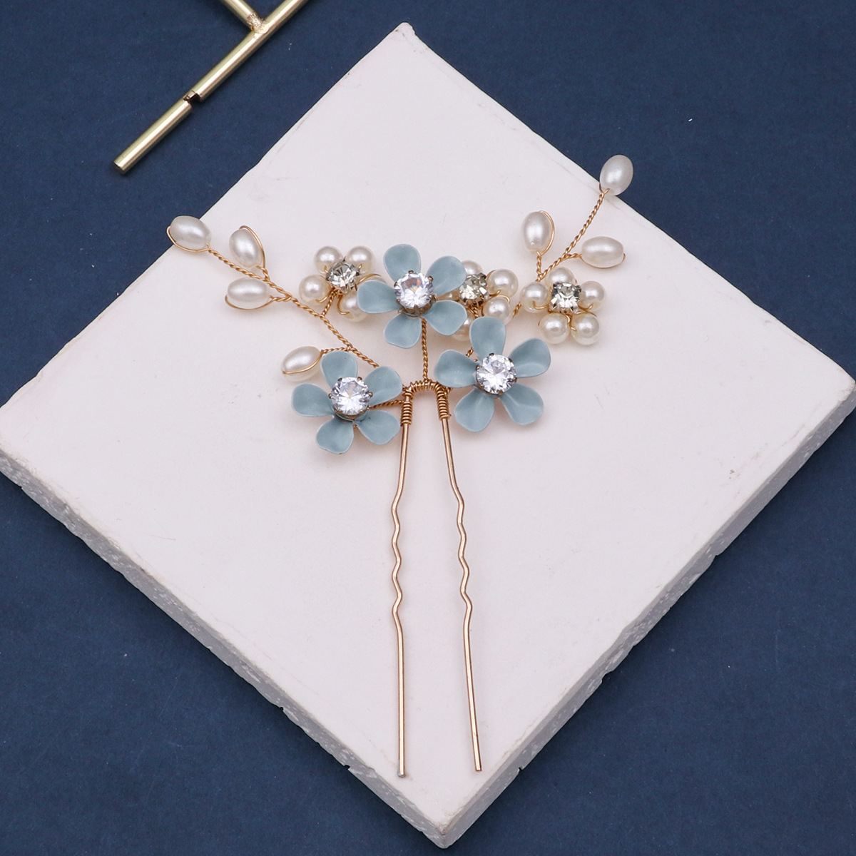 Épingles à cheveux de mariée, alliage de zinc, avec fil en laiton & perle de plastique, fait à la main, trois pièces & pour femme & avec strass, bleu, Vendu par fixé