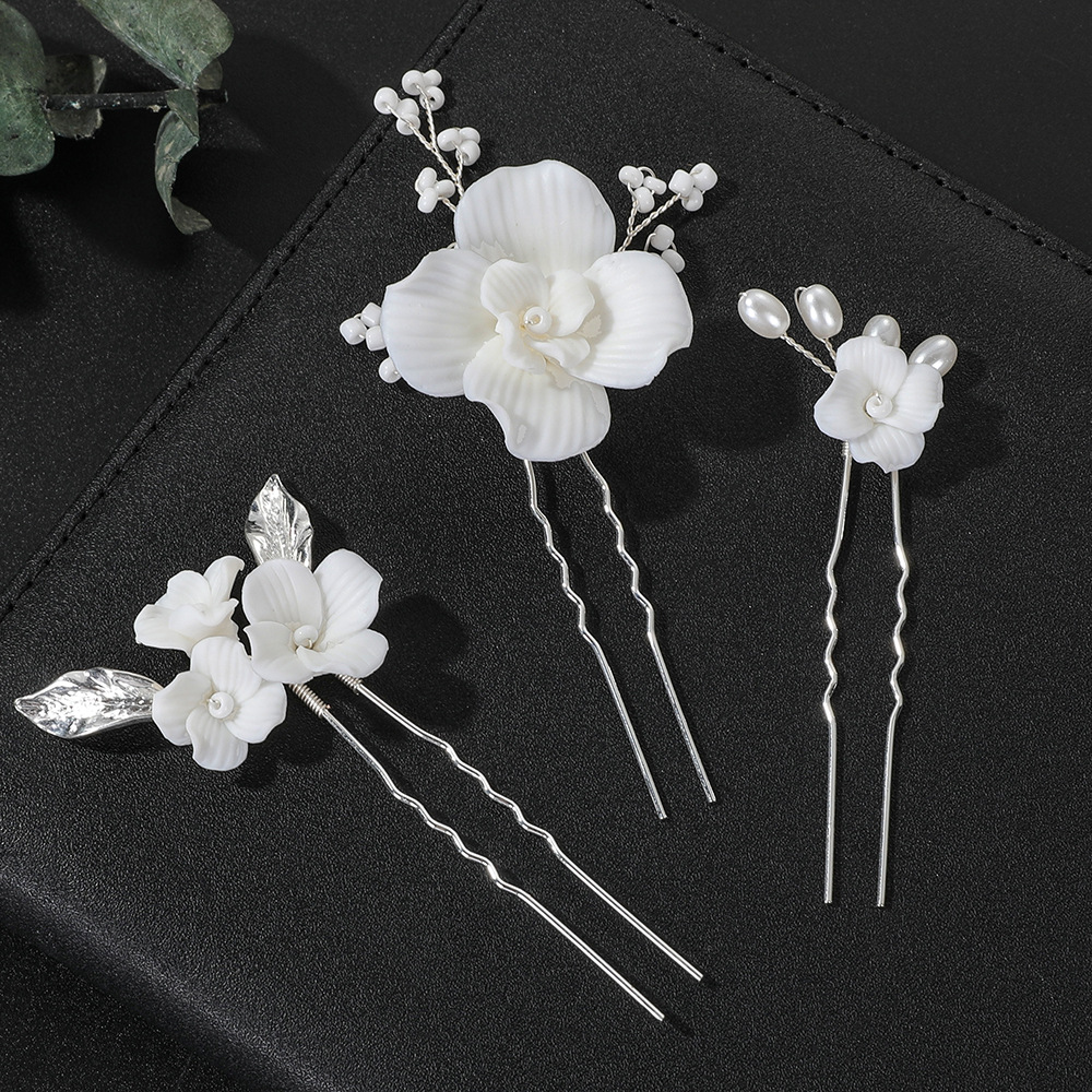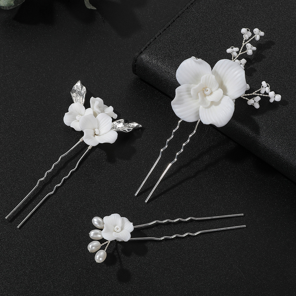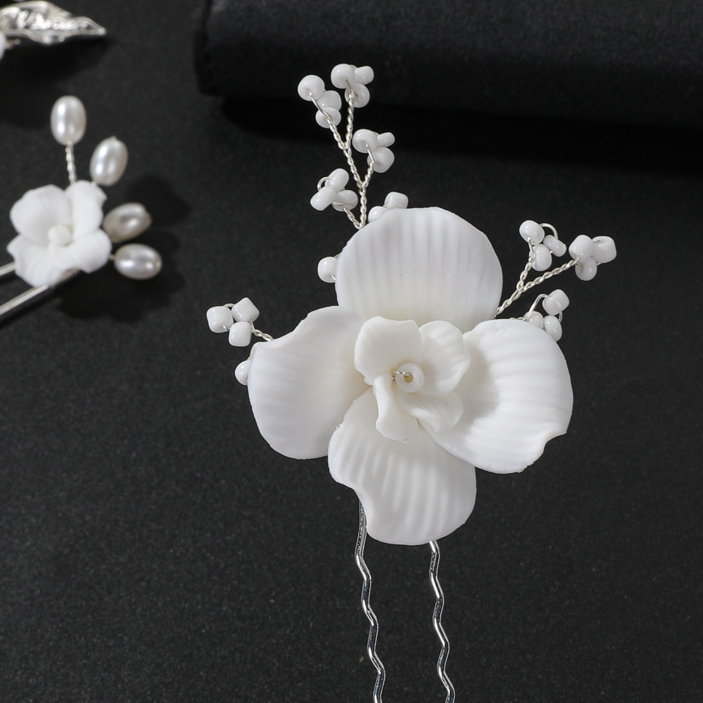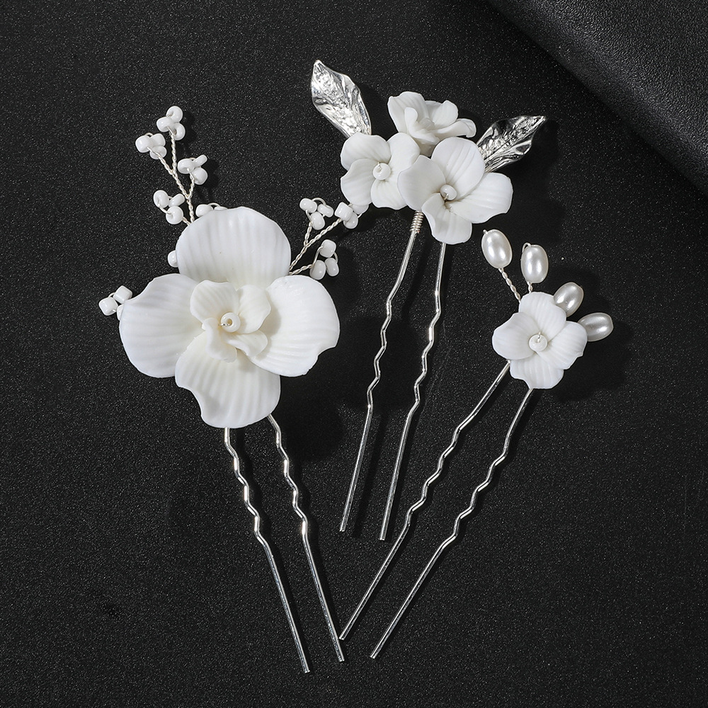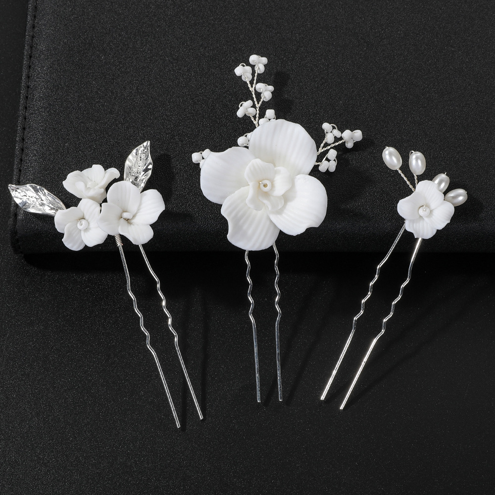 Épingles à cheveux de mariée, alliage de zinc, avec Seedbead & fil en laiton & argile de polymère & perle de plastique, fait à la main, trois pièces & bijoux de mode & pour femme, argent, 130x80x20mm, Vendu par fixé