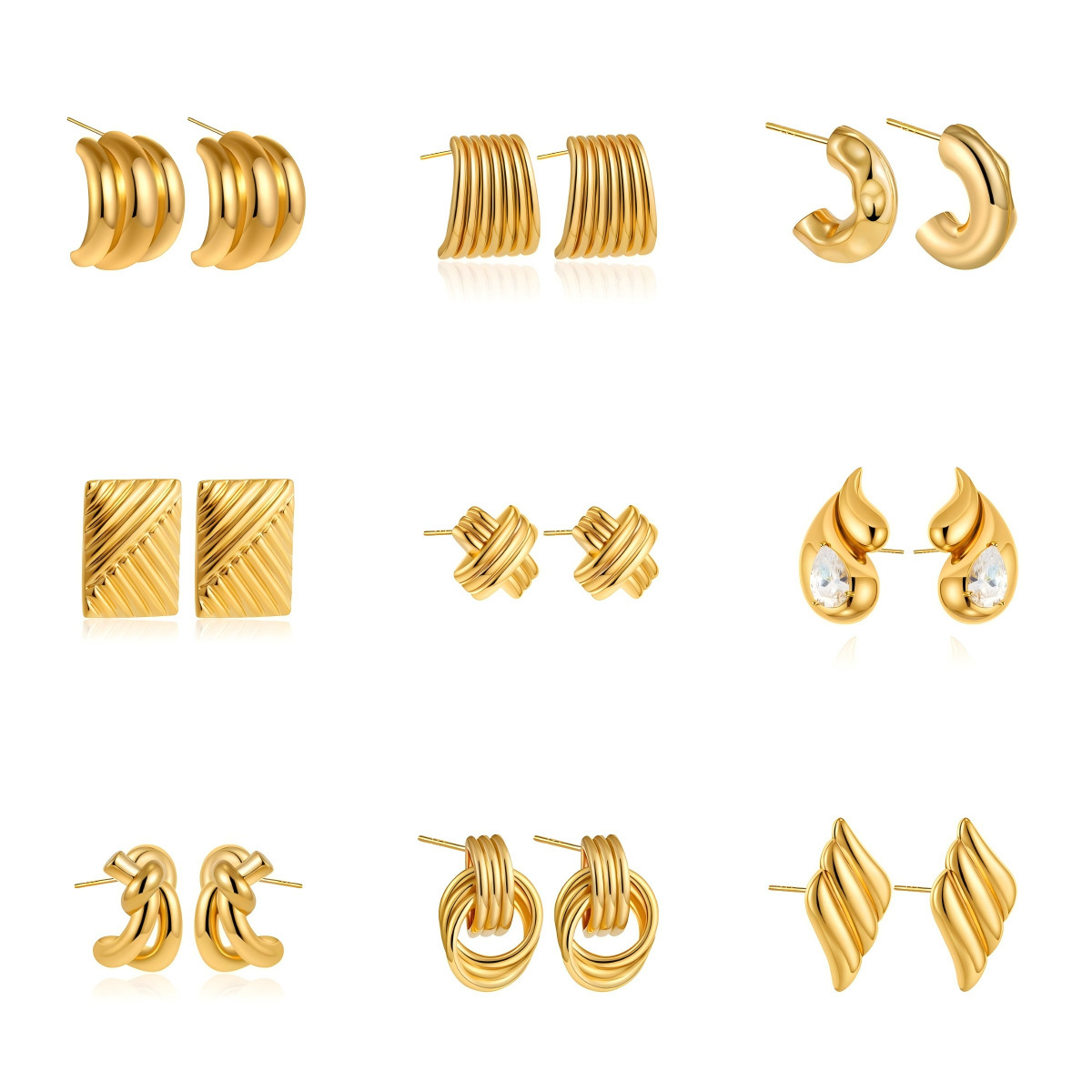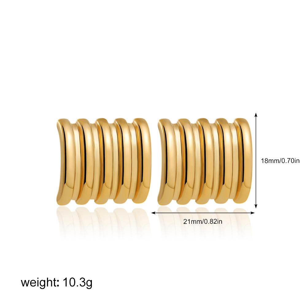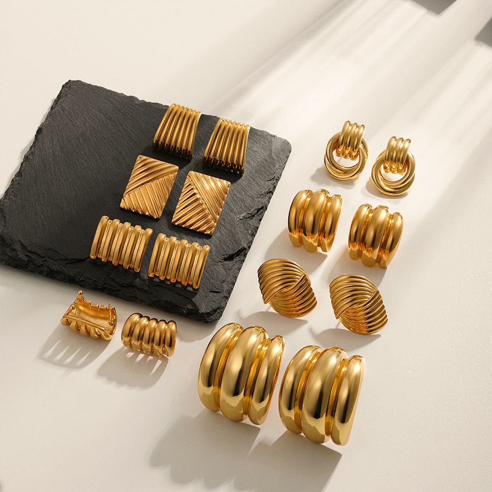 1:Golden c-shaped vertical pattern2:Golden vertical stripe quadrilateral3:Golden glossy arc4:Golden quadrilateral5:Golden double circle trumpet6:Golden double circle large size7:Golden fan8:Gold glossy earrings9:Golden interlaced10:Gold hammered c shape11:Golden five-petal flower12:Golden starfish13:Gold stainless steel stripes14:Golden balloon15:Golden geometric c shape16:Golden cross17:Gold removable double ring18:Gold stainless steel square stripes19:Golden stainless steel heart20:Gold stainless steel conch