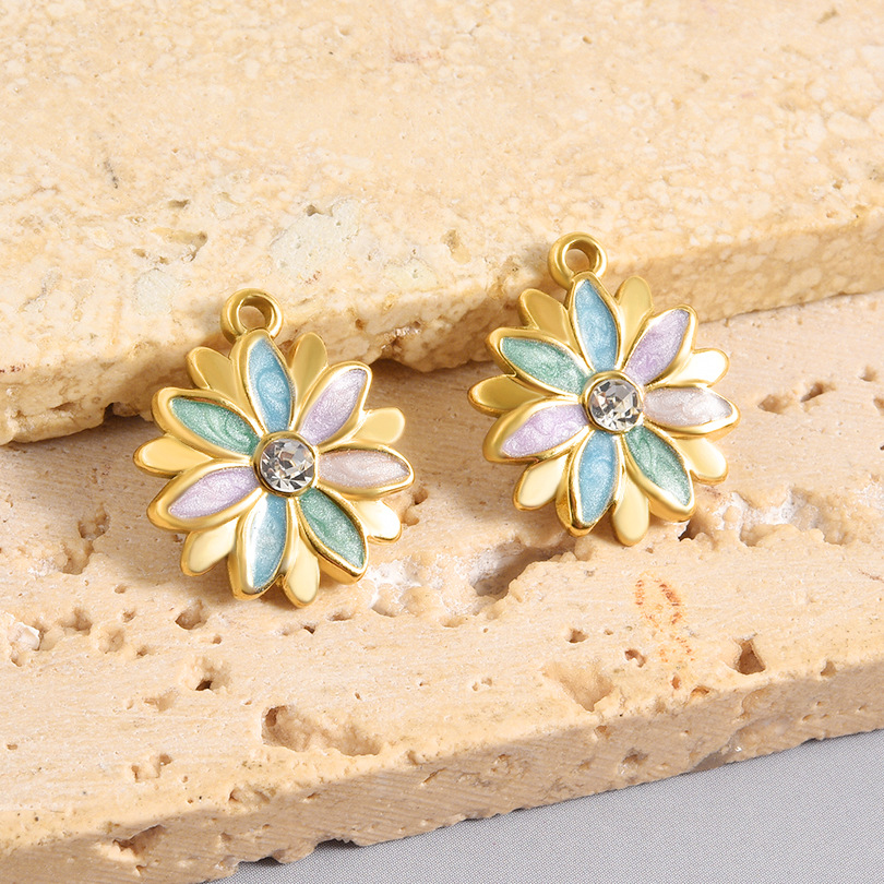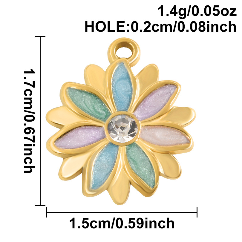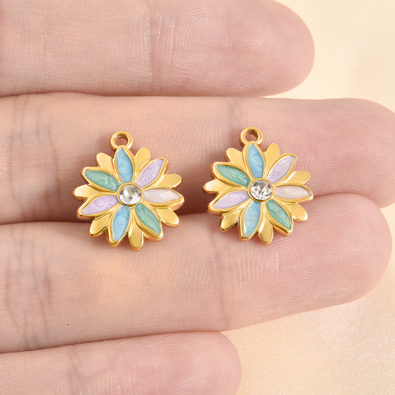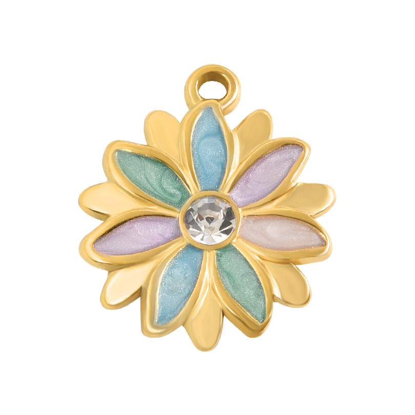Pendentif fleur en acier inoxydable, Acier inoxydable 304, Placage de couleur d'or, DIY & émail & avec strass, couleurs mélangées, 10PC/sac, Vendu par sac