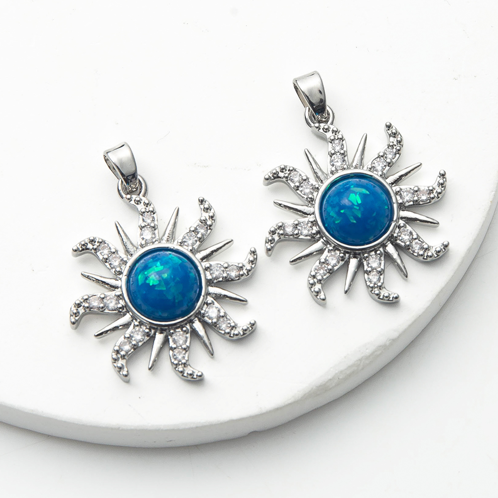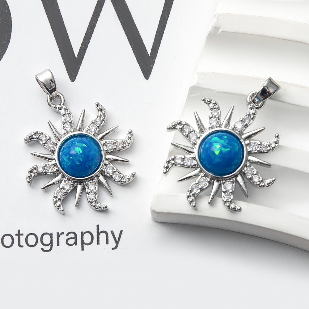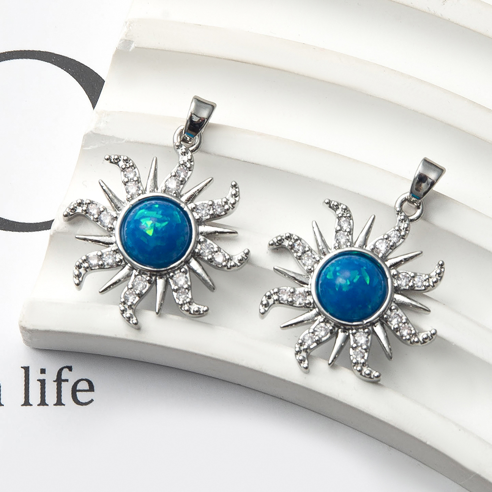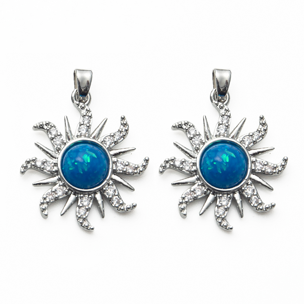 Pendentifs cristal, laiton, avec cristal, soleil, Placage de couleur argentée, DIY & pavé de micro zircon, bleu, protéger l'environnement, sans nickel, plomb et cadmium, 22.70x5.78x29.41mm, 20PC/sac, Vendu par sac